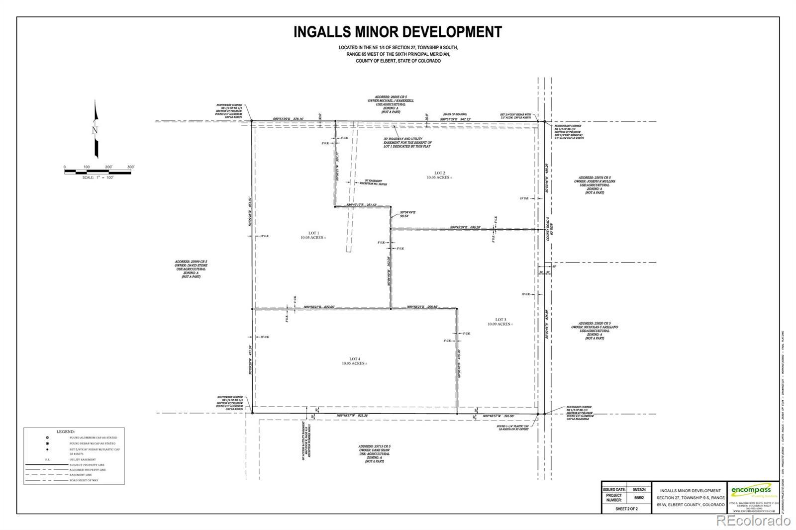 Lot 4 of the Ingalls Minor Subdivison. Fronts on County Road 5 which is publicly maintained. Hig Speed internet cable recently installed along frontage. Electrical power line adjacent to land. Gently rolling, mostly flat, with seasonal stock pond. Regional views and close to Franktown and Elizabeth. 15-20 mintues to shopping in Elizabeth or Castle Rock. Ground water has been adjudicated and will convey with sale. Property tax amount is based upon underlying40-acre parcel. This amount will be changed to reflect new 10-acre parcel. Plat map in suplements- click under photo to see.
