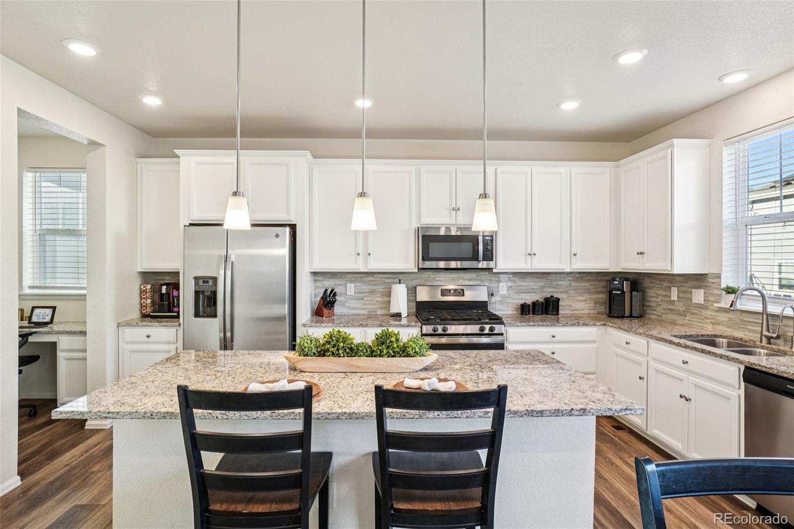 Welcome to your new home Inside, you’ll love the easy-care laminate flooring throughout and a chef-inspired kitchen that steals the show: gas stove, stainless steel appliances, crystal gray backsplash, white farmhouse-style cabinetry, and white granite countertops clean, bright, and timeless. Just off the main living space is a technology nook, perfect for work-from-home days, homework central, or your command station for life. A living room full of natural light and perfect for gatherings. Upstairs, convenience wins with second-level laundry and three spacious secondary bedrooms. The primary suite feels like a true retreat, featuring a spa-like bath with a walk-in shower, double sinks and a built in vanity. Need room to grow? The full unfinished basement is ready for your future vision. Extra bedrooms, a gym, a movie room, or the ultimate hangout space. And the location? Turnberry nails it: walk to the elementary school or pool close to walking trails, and set in a community that makes it easy to get outside and enjoy Colorado living. Skip the “new build premium” and get better-than-new in Turnberry. Built in 2020, this home already has the upgrades buyers usually pay extra (and wait months) for finished landscaping , a beautifully poured concrete patio, and all the move-in-ready touches… without tacking on another*$25,000 just to say “brand new.”