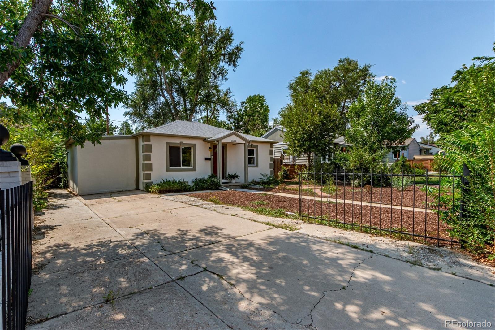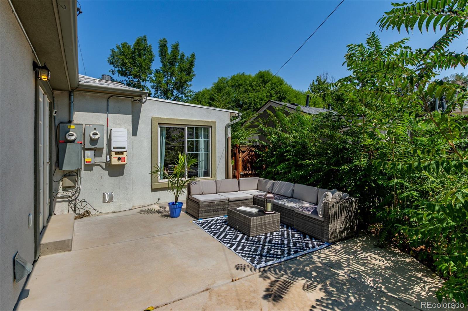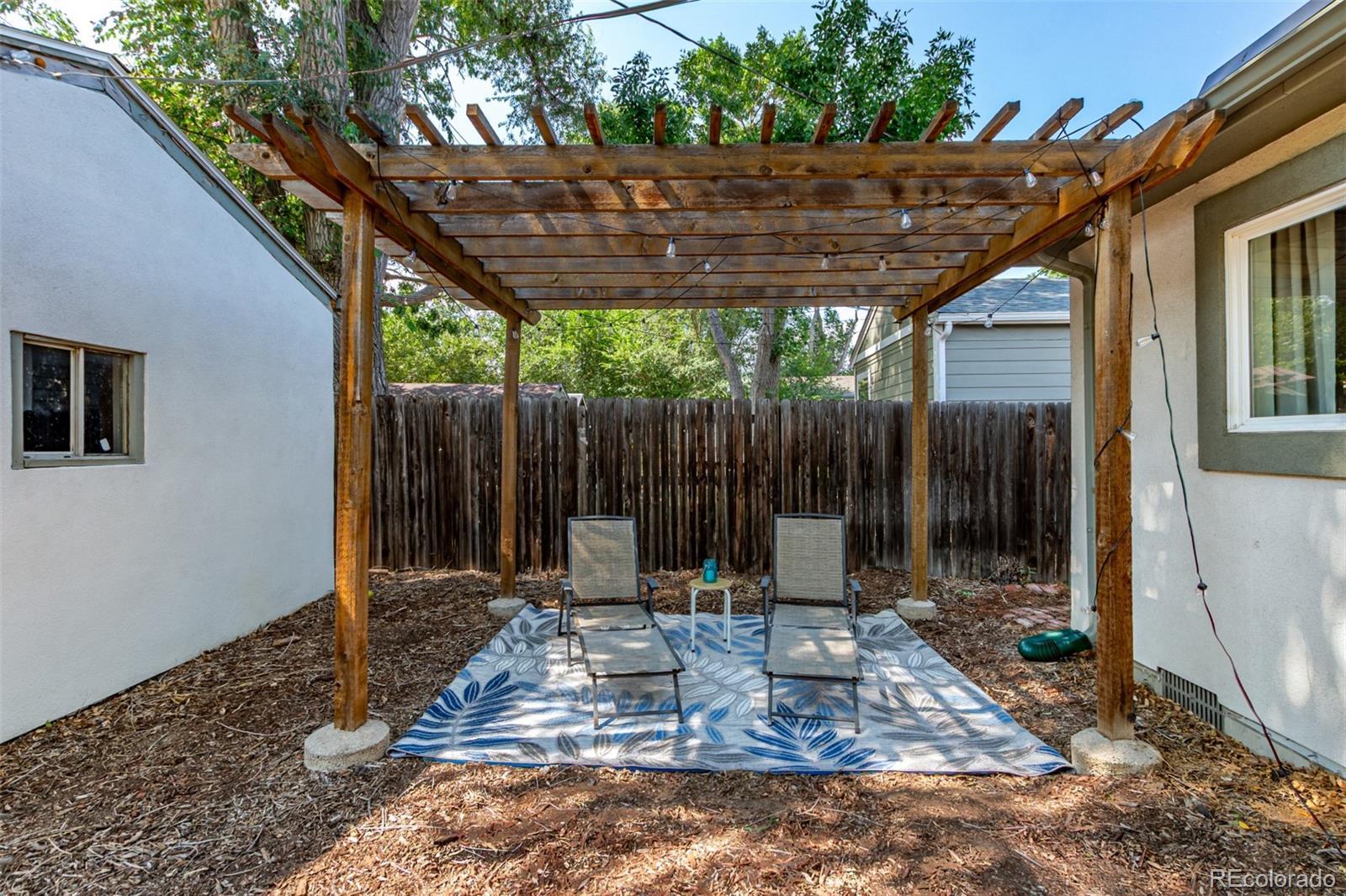 Beautifully updated 4-bedroom ranch with owned Tesla solar, a private backyard retreat, and rare single-level living — all for under $500K in central Denver. Set on a quiet, tree-lined block just minutes from downtown, this light-filled home delivers more space, style, and comfort than anything else in its price range. The thoughtfully expanded layout offers four true bedrooms and two remodeled baths — including a spa-inspired primary suite with dual sinks, oversized walk-in shower, and a custom-built walk-in closet. The bright, open kitchen features warm wood cabinetry, solid-surface counters, gas range, and two pantries (one walk-in) — a rare find at this price point. Hardwood floors, newer double-pane windows, and abundant natural light flow throughout. French doors open to a private backyard oasis with a pergola, raised garden beds, and a wraparound patio — perfect for outdoor dining or quiet evenings by string lights. Additional highlights include owned Tesla solar panels (no lease), RV parking, a detached garage, and a dedicated laundry nook with built-in storage and folding counter. Recent system upgrades provide added peace of mind and efficiency throughout. Located in Denver’s desirable Valverde neighborhood, this move-in ready home combines energy efficiency, modern design, and effortless access to downtown, I-25, and the mountains. Where character meets comfort — and value meets opportunity.