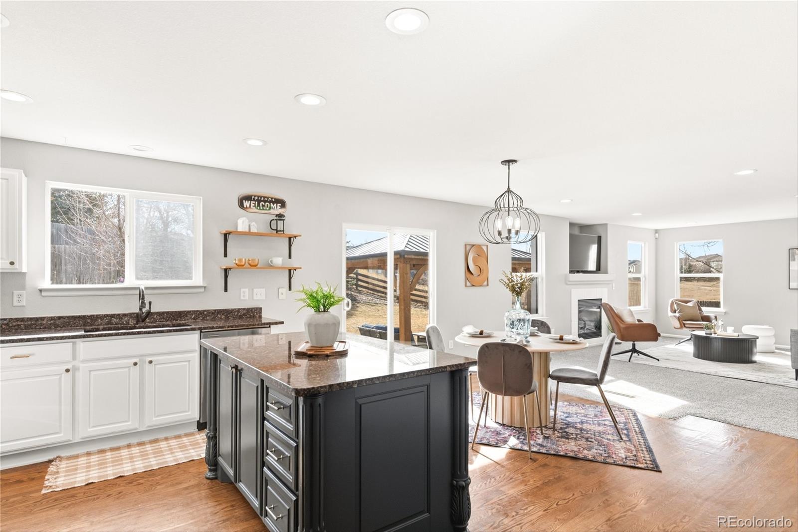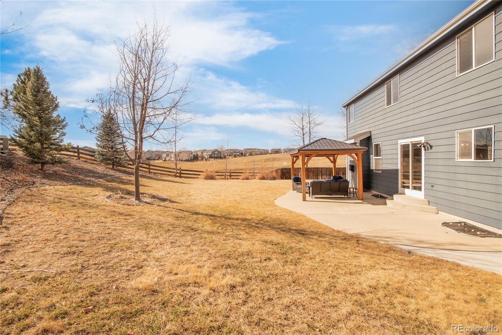 This beautifully maintained 5-bedroom, 3.5-bath home offers the space, privacy, and long-term value today’s buyers are searching for. Tucked into a quiet cul-de-sac and backing to open space, the setting provides peaceful views and a safe place for play while still being close to everyday conveniences. Situated on a generous .28-acre lot — one of the larger lots in the neighborhood — the backyard features an expansive patio and included gazebo, creating the perfect space for entertaining, relaxing evenings, or enjoying Colorado’s sunshine. Inside, 3,621 square feet of thoughtfully designed living space showcases true pride of ownership, tasteful updates, and brand new carpet throughout the main level and entire upstairs. The open kitchen features granite countertops and flows seamlessly into the inviting living area anchored by a cozy gas fireplace. The finished basement adds valuable flexibility with additional living space, a conforming bedroom, and a 3/4 Bathroom, ideal for guests, recreation, or multi-generational living. Energy-saving solar panels transfer to the new owner, providing significant utility savings, and the home includes a radon mitigation system and owned ADT security equipment for added peace of mind. A 3-car garage and extended driveway offer ample parking and storage. Located within the award-winning Cherry Creek School District with convenient access to parks, shopping, and commuter routes, this home offers a rare combination of lot size, privacy, efficiency, and space at this price point — making it an exceptional value and a must-see.