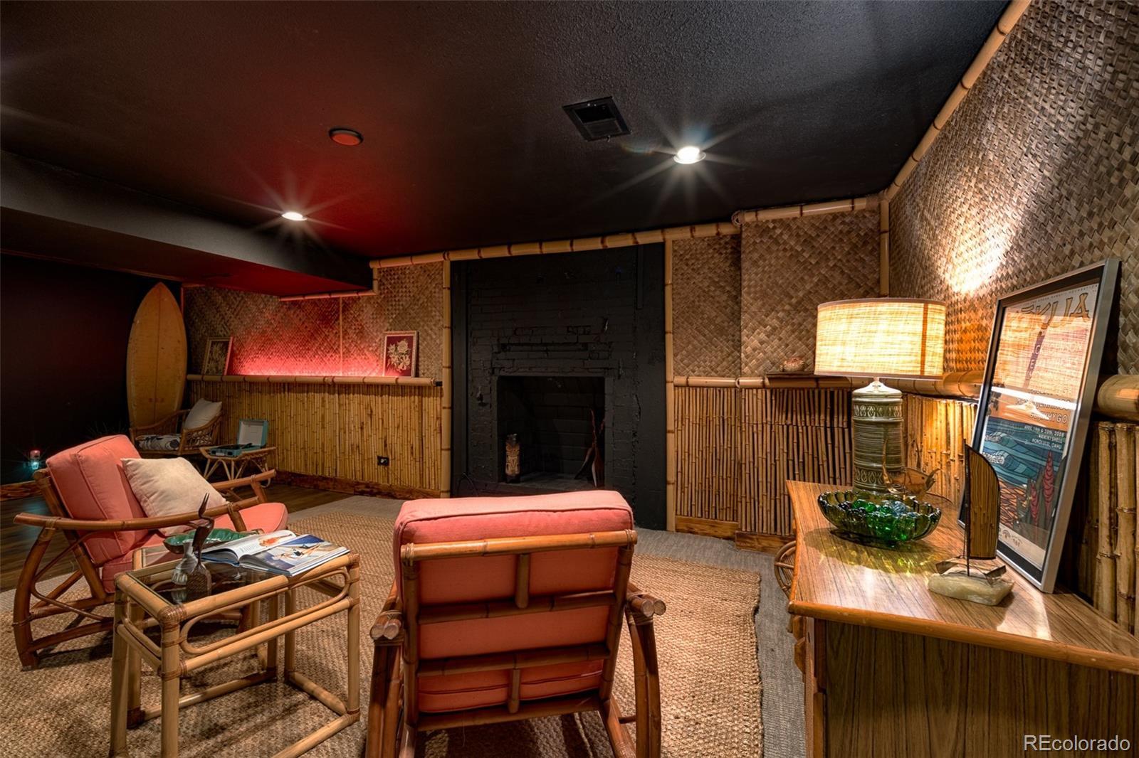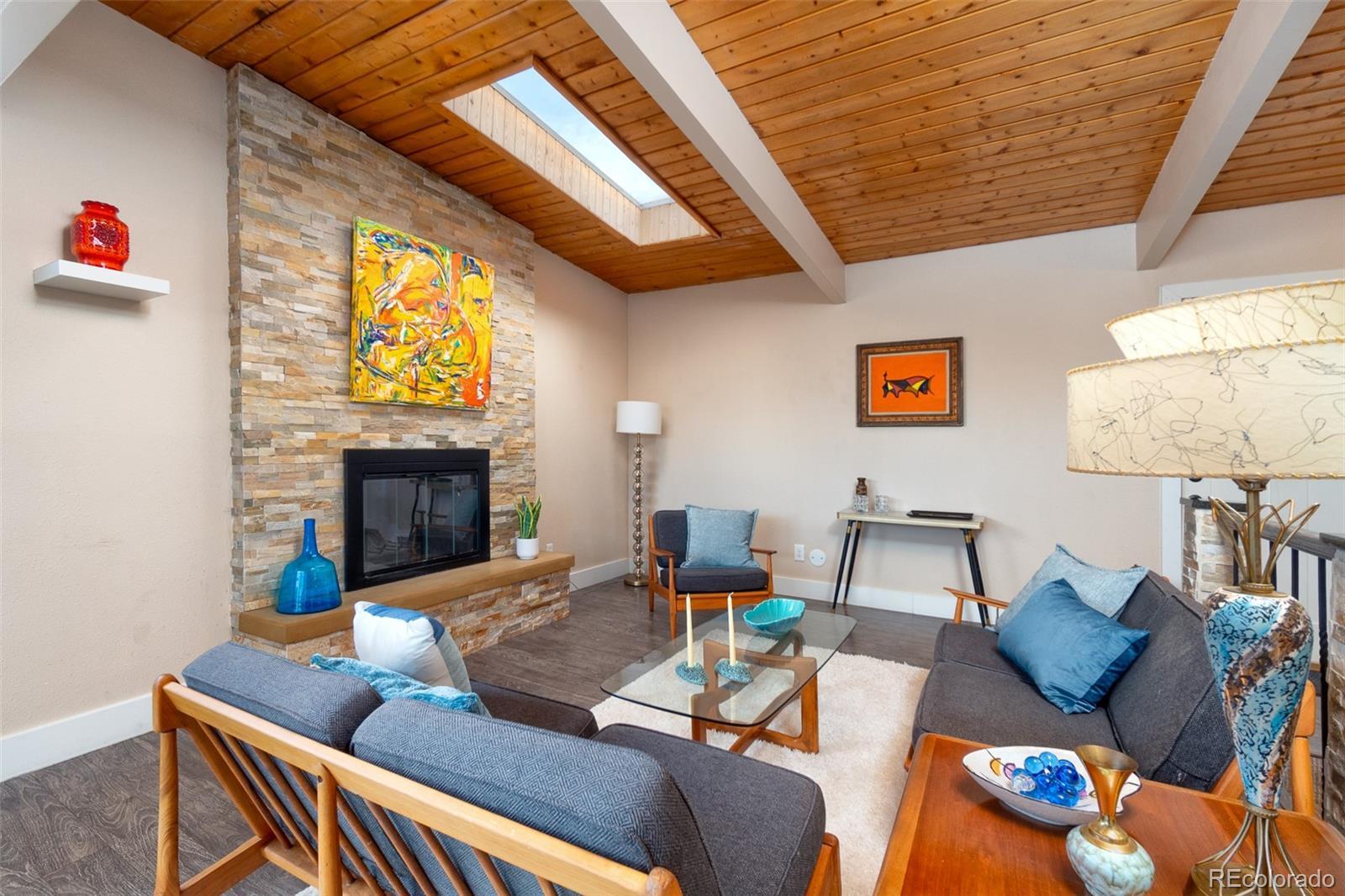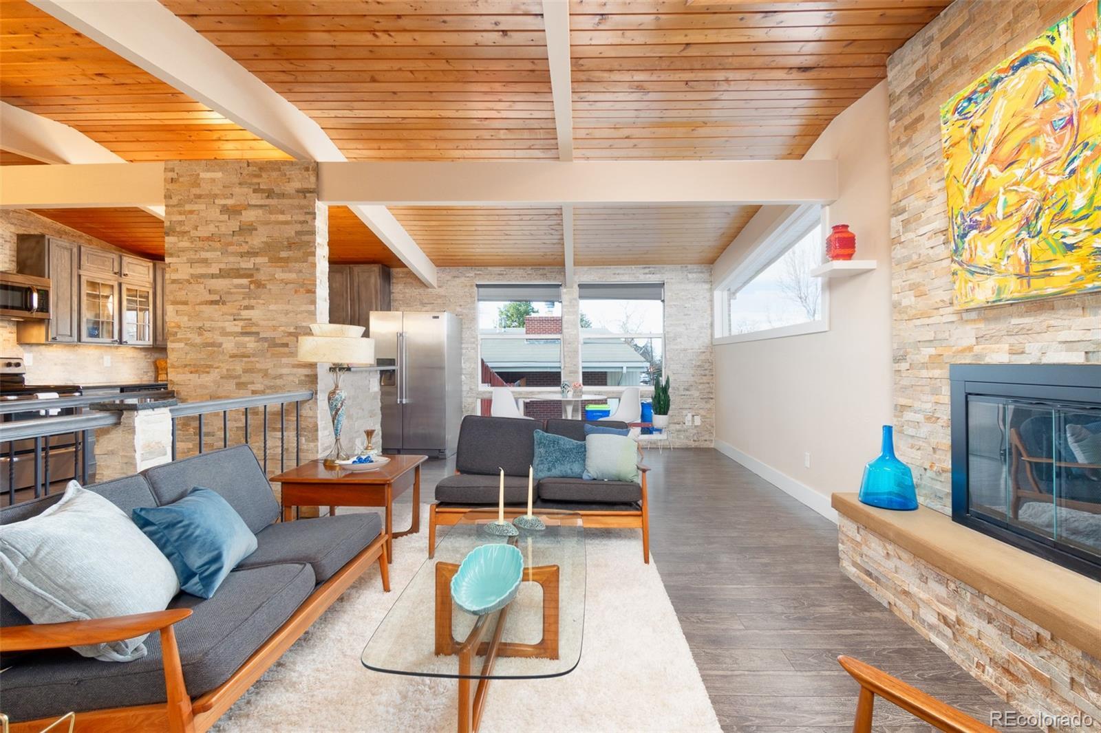 A classic mid century modern home, just what you can expect from Woodman Construction. The low sloped roofline flows directly into the oversized two car carport for a cohesive, quintessential mid-century look, while the full wrap-around unpainted brick exterior adds to a timeless curb appeal. Inside, the main level opens up with exposed beams and tongue and groove ceilings that immediately set the stage. Floor-to-ceiling glass in the living area brings in great natural light and maintains the indoor outdoor connection. A wood burning fireplace anchors the living space, while luxury vinyl plank flooring and dry stack stone accents make for a more modern feel. The open layout makes this home phenomenal for entertaining, with easy flow between the living, dining, and kitchen spaces.The kitchen has been updated with contemporary finishes adding ease to everyday living. Whether it’s coffee at the island or dinner with friends, the open floor-plan makes it accessible. Upstairs, you’ll find three bedrooms and two updated bathrooms. The primary suite includes a 3/4 ensuite bath with refreshed tile and river rock accents for a subtle spa feel. Two additional bedrooms share a full hallway bathroom. But wait, there's more! Take the stairs down to your own private escape. A custom built tiki bar is ready for your decor, movie marathons and exotic cocktails or mocktails; pick your poison. Two non conforming bedrooms add flexibility for a home office, guest space, gym, or creative studio. Outside, the fully fenced yard is ready for summer evenings with friends. The oversized carport offers covered parking, and a large shed gives you plenty of room for bikes, tools, and all your outdoor gear. Set in the Aurora Hills neighborhood, this home puts you close to parks, schools, shopping, dining, and major commuter routes. It’s a true mid-century atomic ranch with enough personality to keep things interesting, but updated to live without sacrificing comfort or function.