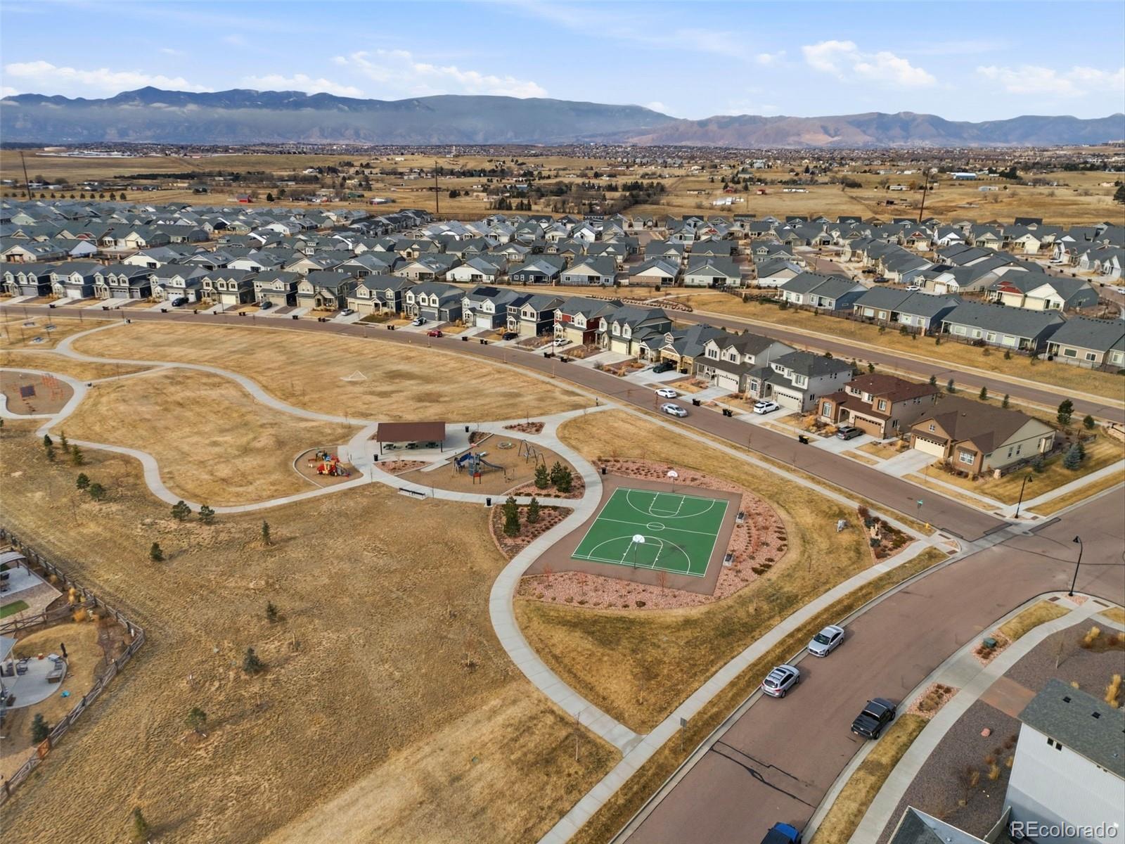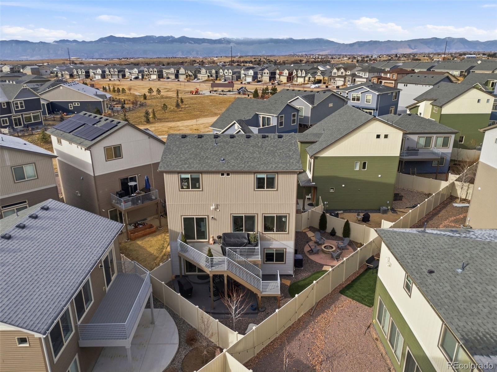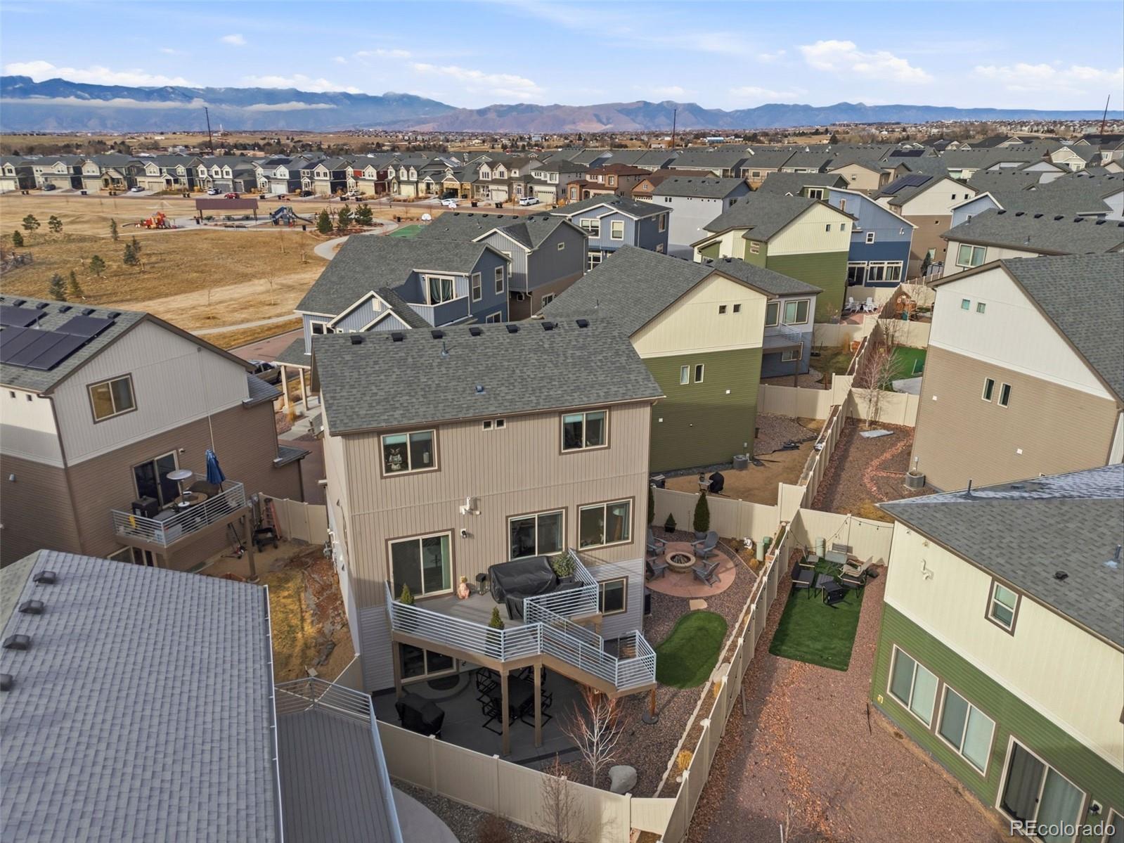 Welcome home to this beautifully appointed residence ideally situated across the street from a neighborhood park in sought-after Banning Lewis Ranch. Designed for both everyday comfort and effortless entertaining, this home offers a bright, open floor plan filled with natural light and high-end finishes throughout. The gourmet kitchen is the heart of the home, featuring granite countertops, a large center island, breakfast bar seating, stainless steel appliances, tile backsplash, pantry, and stylish pendant lighting. Luxury vinyl plank flooring flows seamlessly through the main living areas, while expansive windows frame the space and create an inviting atmosphere. The kitchen opens to a spacious family room with 9-foot ceilings and direct access to an oversized composite deck—perfect for indoor-outdoor living. The main-level primary suite provides a private retreat with picturesque mountain views, a walk-in closet, and a well-appointed en-suite 3/4 bathroom. The primary bath includes granite countertops, a dual vanity, and an oversized ceramic tile shower. Upstairs, you’ll find a versatile loft space ideal for a home office or secondary living area, along with two additional bedrooms and a full bathroom finished with granite countertops. The walk-out basement expands your living space with LVP flooring and a new standalone gas fireplace, creating a warm and comfortable area for relaxing or entertaining. Step outside to an oversized patio that leads to a fully landscaped backyard complete with a flagstone patio and firepit—an ideal setting for gatherings year-round. Enjoy an exceptional community lifestyle with nearby parks, playgrounds, pickleball courts, a pool, fitness center, dog park, and miles of walking trails, all just moments from your front door. This home offers the perfect blend of modern finishes, functional design, and an unbeatable location.