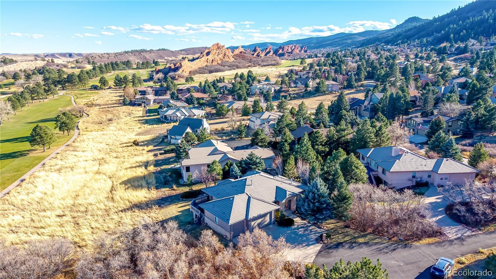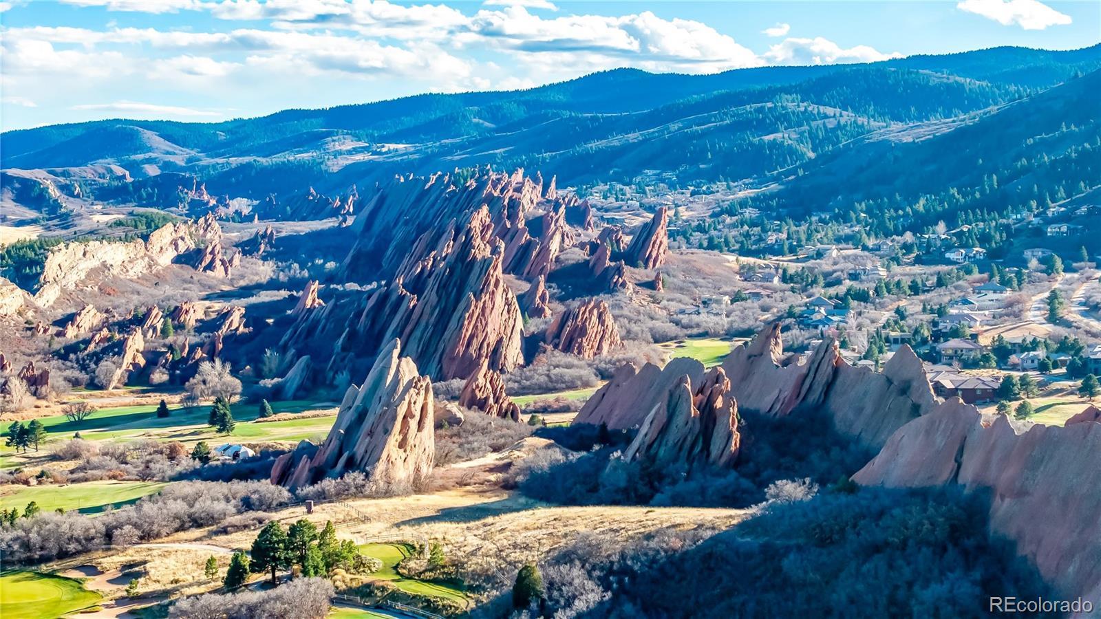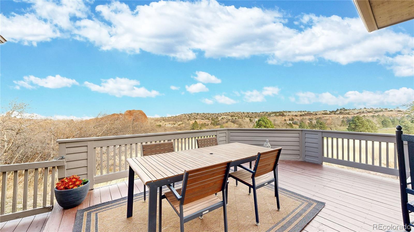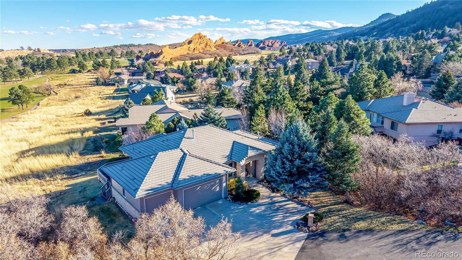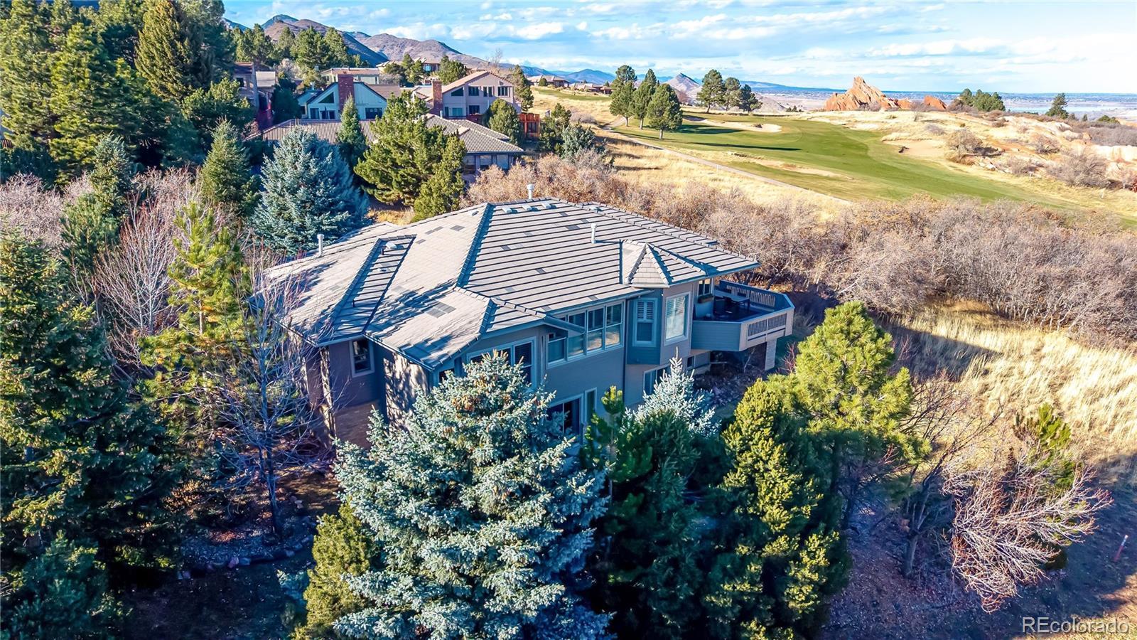 This updated ranch home backs to Arrowhead Golf Course in highly sought-after Roxborough Park, offering sweeping foothill views and exceptional privacy. The light-filled main level showcases natural hickory hardwoods, plantation shutters, and thoughtfully updated kitchen and baths. Upon entry, a stylish study sits to the right, featuring an imported antique fireplace surround from England, custom built-ins, glass French doors, and a closet-allowing flexible use as a bedroom. The elegant formal dining room impresses with raised-panel wainscoting, a coffered ceiling, and a recessed hutch niche for added architectural charm. The inviting great room offers a two-sided fireplace shared with the kitchen, custom built-ins, hardwoods, and tranquil golf course views. The gourmet kitchen is outfitted with slab granite, a center island, stainless appliances, a walk-in pantry, and a sunny breakfast nook. The primary suite is a true retreat, complete with a brand-new 5-piece bath featuring a freestanding soaking tub, frameless glass shower, dual vanities with quartz countertops, and separate walk-in closets. A functional laundry room with sink, hanging space, storage cabinetry, and mudroom, completes the main level. The walk-out lower level offers endless possibilities with a spacious recreation room anchored by a gas fireplace, plus a bonus room ideal as a guest suite or media room (or open the wall to create one expansive entertainment space). Two additional bedrooms, a beautifully updated full bath, and a storage/workshop area round out the lower level. Additional highlights include a 3-car garage with extra-deep bay, a level usable lot, and unparalleled golf course and foothill views from a peaceful cul-de-sac setting. Enjoy the perks of golf-course living—without stray golf ball concerns. Outdoor adventurers will love the miles of nearby trails and unmatched proximity to Roxborough State Park, Waterton Canyon, Chatfield State Park, and access into Pike National Forest.