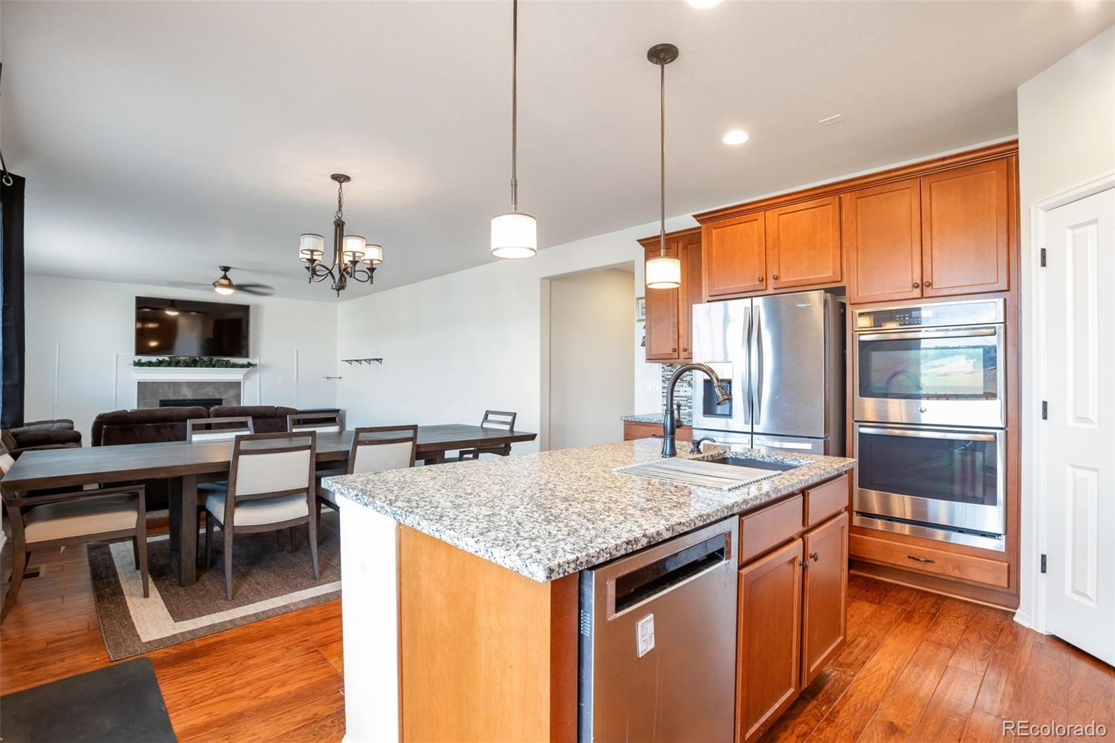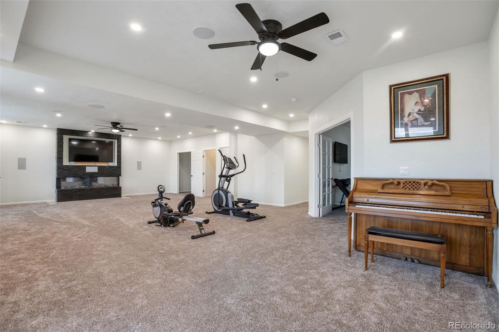 Move right in to this charming ranch with a walkout basement and main floor primary bedroom and bathroom! Main level also features two additional bedrooms, an office or bedroom, a 3/4 bath, laundry, and a kitchen with pantry and island opening to a spacious living area. There's a three car garage with mudroom entry, and there's a deck right off the kitchen with an attached gas grill - yes, that's Pikes Peak you see off in the distance! The newly finished basement includes an electric fireplace in the great room with surround sound audio, a 3/4 bath with rainshower and color-changing shower lights (via app), a guest bedroom, and some bonus rooms for storage, artwork, or any other favorite hobby. Be sure to notice the nice flat back yard, with a stamped patio and built-in gas firepit - plenty of room for gardening and throwing the ball around. Come see it today!