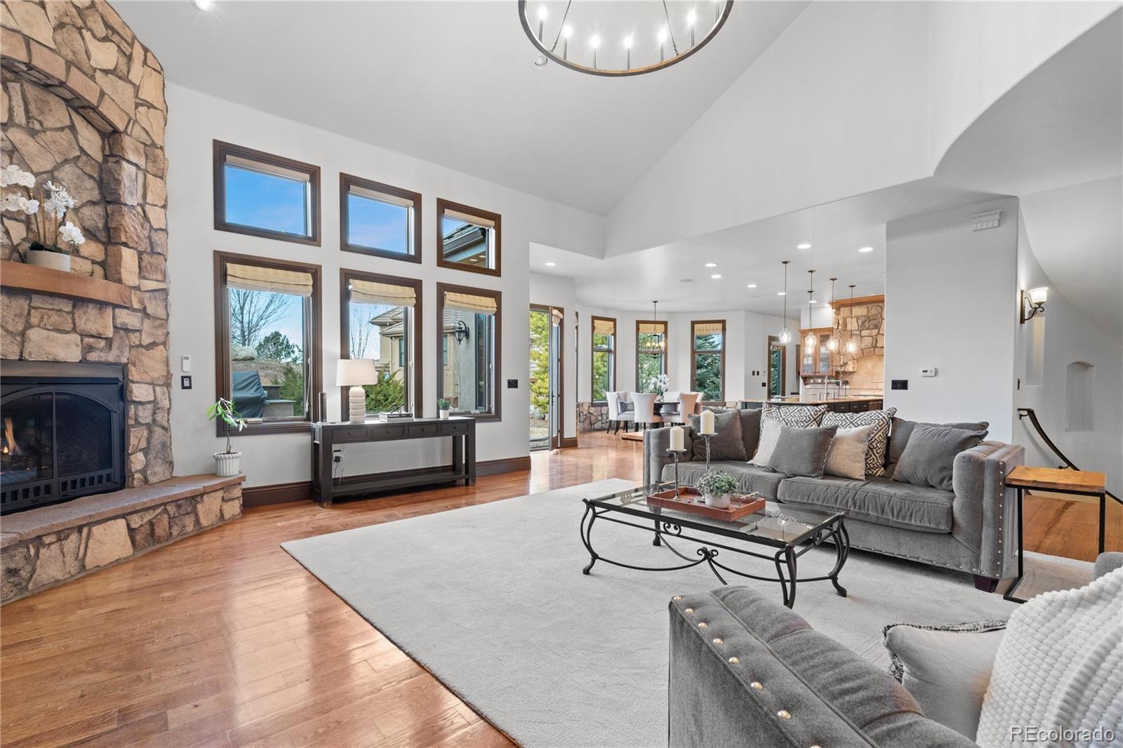 Nestled in one of Castle Pines’ most sought-after gated communities, this exceptional residence seamlessly blends timeless elegance with modern sophistication. A striking stone exterior delivers unforgettable curb appeal and sets the tone for what lies within. Inside, a thoughtfully reimagined interior showcases fresh, updated paint and curated designer light fixtures that elevate every space. The sun-drenched main level is framed by expansive windows, bathing the home in natural light and creating a warm, airy ambiance that flows effortlessly from room to room. The open-concept design balances refined style with everyday functionality, making it equally suited for intimate evenings and lively gatherings. At the heart of the home, the chef’s kitchen is designed to impress, featuring a brand-new JennAir refrigerator, double ovens, sleek cooktop, and an oversized island with integrated seating—perfect for casual dining, morning conversations, or effortless entertaining. The primary suite serves as a true sanctuary, offering a spa-inspired five-piece bath with premium finishes, a luxurious soaking tub, and an expansive walk-in shower designed for pure relaxation. Upstairs, generously sized bedrooms provide thoughtfully designed retreats for family and guests alike. The lower level elevates the home’s entertainment experience, featuring a sophisticated wet bar and a private theater room—ideal for movie nights, game days, or hosting friends. Step outside to a serene backyard oasis, where a luxurious jacuzzi invites year-round relaxation and unforgettable evenings under the stars. Dedicated open space means this type of privacy is forever. This remarkable home offers a rare fusion of refined luxury and everyday comfort. Located in Castle Pines, residents enjoy breathtaking mountain views, abundant natural beauty, and easy access to scenic parks and trails that offer endless outdoor recreation. Easy access to Rock Canyon High School or Valor High School.
