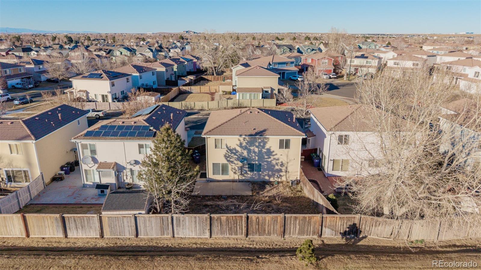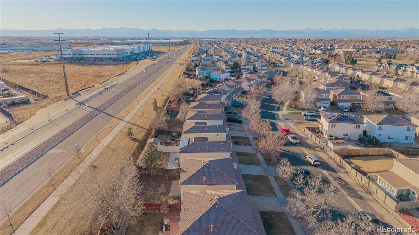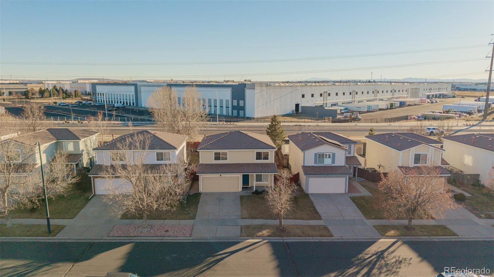 Welcome to this beautifully appointed two-story residence, thoughtfully positioned with no rear neighbors for exceptional privacy. A manicured grassy front yard, charming covered porch, and attached two-car garage create inviting curb appeal from the moment you arrive. Inside, the home unfolds into a warm and welcoming living space featuring plush carpeting, a soothing neutral palette, and abundant natural light. A conveniently located powder room and an elegant formal dining area provide the perfect setting for both everyday living and memorable gatherings. The well-designed kitchen offers rich maple cabinetry, generous counter space, built-in appliances, and a functional breakfast bar—ideal for casual dining or entertaining. The open-concept layout flows seamlessly into the main living area, creating an airy, comfortable environment for hosting or relaxing. Upstairs, a spacious loft provides versatile living space, perfectly suited for a home office, media room, play area, or reading retreat. The primary bedroom serves as a serene sanctuary, complete with soft carpeting and a private en-suite bath. A dedicated laundry area with stacked washer and dryer adds everyday convenience. Step outside to the fully fenced backyard, where a paved patio and open green space offer endless opportunities for outdoor entertaining, gardening, or peaceful evenings—enhanced by the rare benefit of unobstructed rear views. Located in the vibrant and rapidly growing Green Valley Ranch community, this home is surrounded by parks, trails, and green spaces, with easy access to schools, major highways, public transportation, and downtown Denver. With comfort, functionality, and location seamlessly combined, this residence is ready to welcome its next owner and your personal finishing touches.