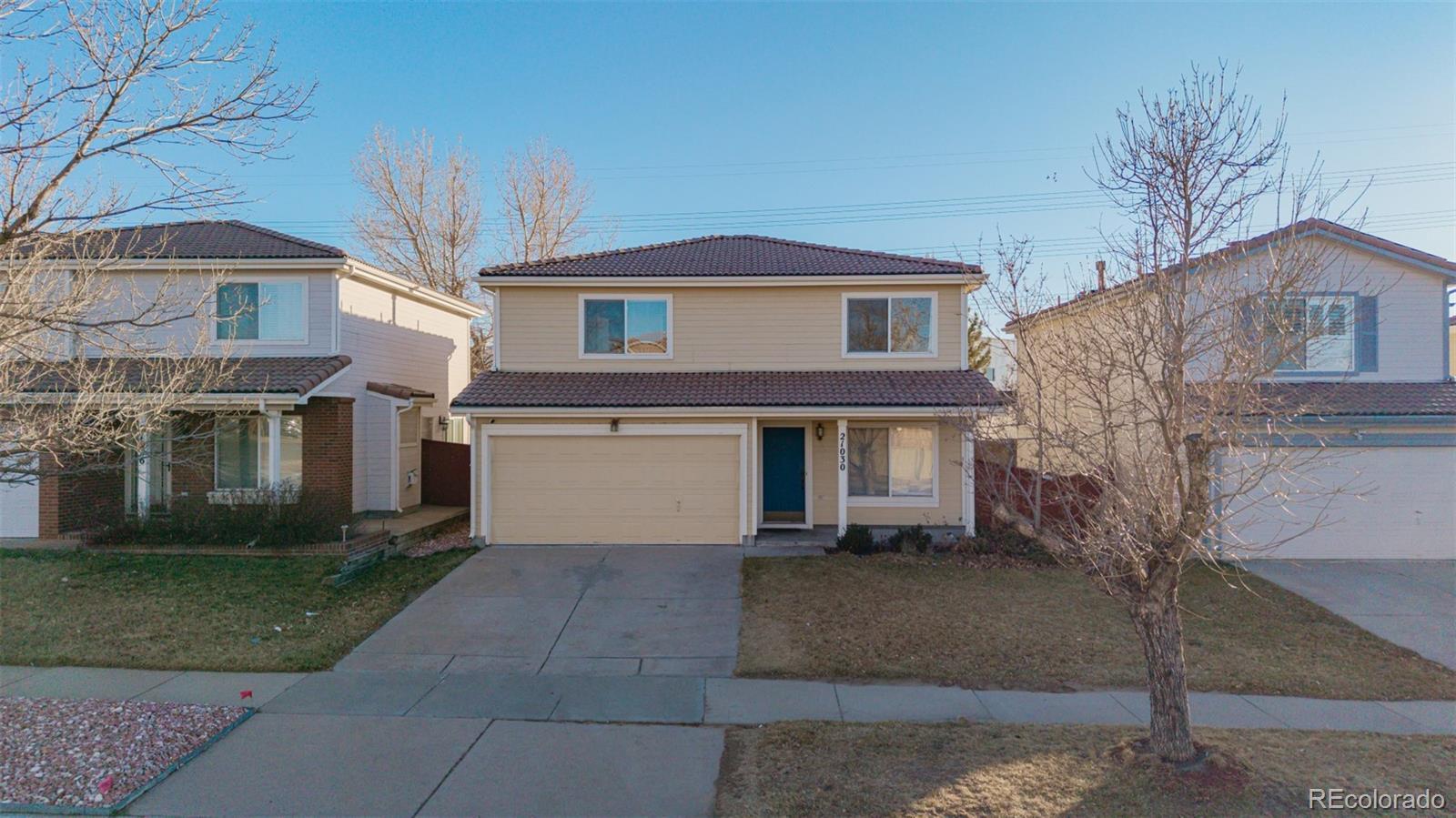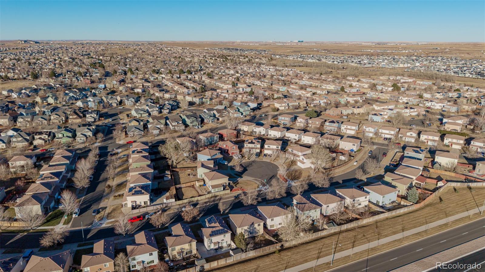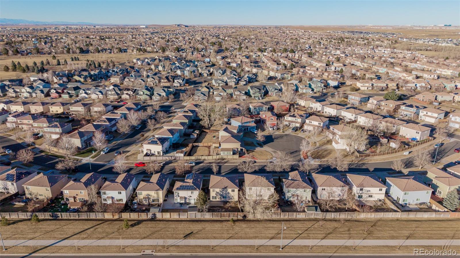 Welcome to this beautifully appointed two-story residence, thoughtfully positioned with no rear neighbors for exceptional privacy. A manicured grassy front yard, charming covered porch, and attached two-car garage create inviting curb appeal from the moment you arrive. Inside, the home unfolds into a warm and welcoming living space featuring plush carpeting, a soothing neutral palette, and abundant natural light. A conveniently located powder room and an elegant formal dining area provide the perfect setting for both everyday living and memorable gatherings. The well-designed kitchen offers rich maple cabinetry, generous counter space, built-in appliances, and a functional breakfast bar—ideal for casual dining or entertaining. The open-concept layout flows seamlessly into the main living area, creating an airy, comfortable environment for hosting or relaxing. Upstairs, a spacious loft provides versatile living space, perfectly suited for a home office, media room, play area, or reading retreat. The primary bedroom serves as a serene sanctuary, complete with soft carpeting and a private en-suite bath. A dedicated laundry area with stacked washer and dryer adds everyday convenience. Step outside to the fully fenced backyard, where a paved patio and open green space offer endless opportunities for outdoor entertaining, gardening, or peaceful evenings—enhanced by the rare benefit of unobstructed rear views. Located in the vibrant and rapidly growing Green Valley Ranch community, this home is surrounded by parks, trails, and green spaces, with easy access to schools, major highways, public transportation, and downtown Denver. With comfort, functionality, and location seamlessly combined, this residence is ready to welcome its next owner and your personal finishing touches.