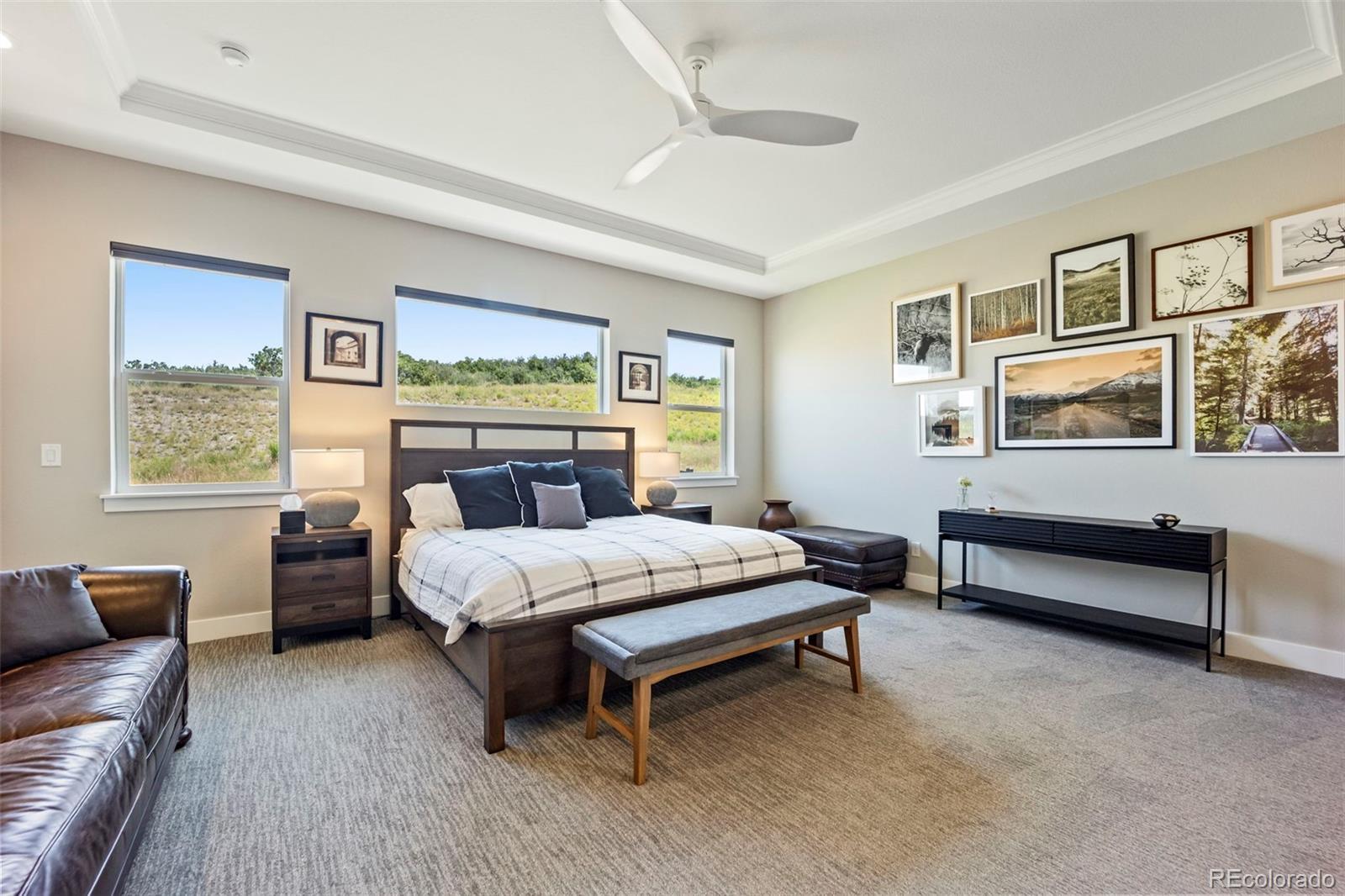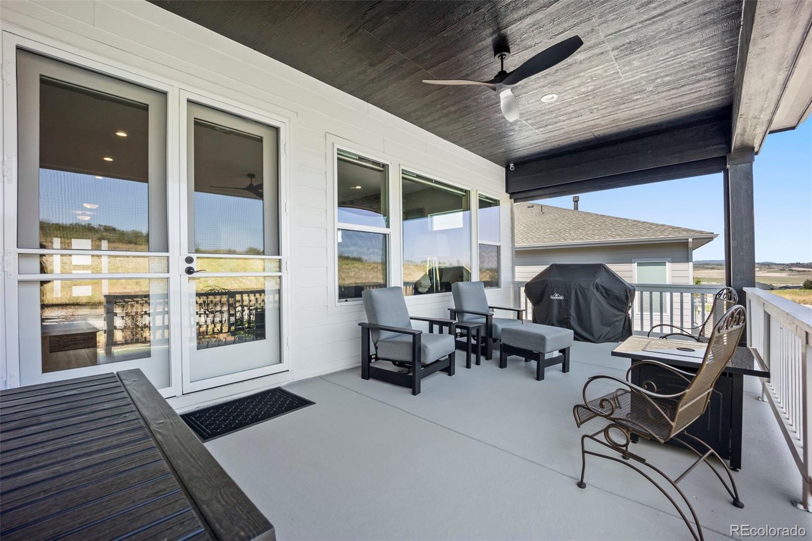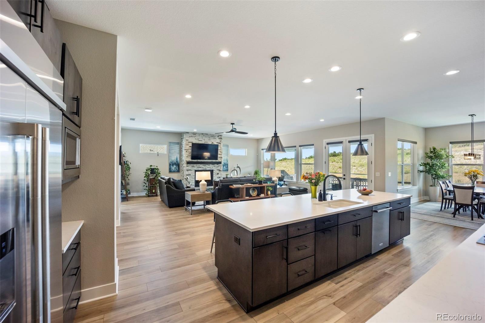 Rare lot w/ open space (rear and side). This extraordinary ranch plan in the coveted "Regency" at Montaine 55+ community offers over 4,700 sq ft (2,720 finished), with thoughtful expansions and luxury upgrades throughout. This nearly new home has unmatched privacy, and elegant design. The open-concept great room has been expanded by over 200 sq ft, creating a gathering space anchored by a floor-to-ceiling stacked stone fireplace. The gourmet kitchen showcases quartz counters, extended island, all upgraded "Yorktowne" cabinetry, KitchenAid double ovens, five-burner cooktop, and built-in Jenn-Air fridge. The great room/dining area opens to a covered patio through French doors, where a motorized sun/wind screen and stained concrete patio provide year-round enjoyment. The primary suite was enlarged, featuring a spa-inspired bathroom w/ upgraded shower enclosure, separate toilet room w/ bidet seat, his/her walk-in closets with custom shelving and drawers. Additional BR has walk-in closet and bath attached. French doors enclose the dedicated office, w/ wired high-speed data. 8-foot solid core doors, additional lighting and electrical upgrades throughout, custom cabinets and shelving in closets, pantry, laundry and garage, plus remote- control window shades on all windows. The insulated and painted garage includes polyaspartic floor coating, while the basement—also finished with polyaspartic flooring—offers a rough-in for an additional bath and ample room for two more BR's, a rec area, or fitness space. Outdoors, the home is fully landscaped w/ pet-rated artificial turf, fenced backyard, and stained concrete entry. Peace of mind comes with storm doors and alarm system. Residents of Regency enjoy resort amenities, including a clubhouse, pool, fitness center, tennis/pickleball courts, and miles of scenic trails. Just minutes from downtown Castle Rock’s shops, dining, and golf, this home perfectly balances luxury, lifestyle, and location.
