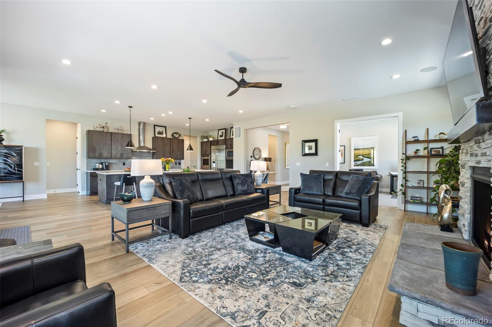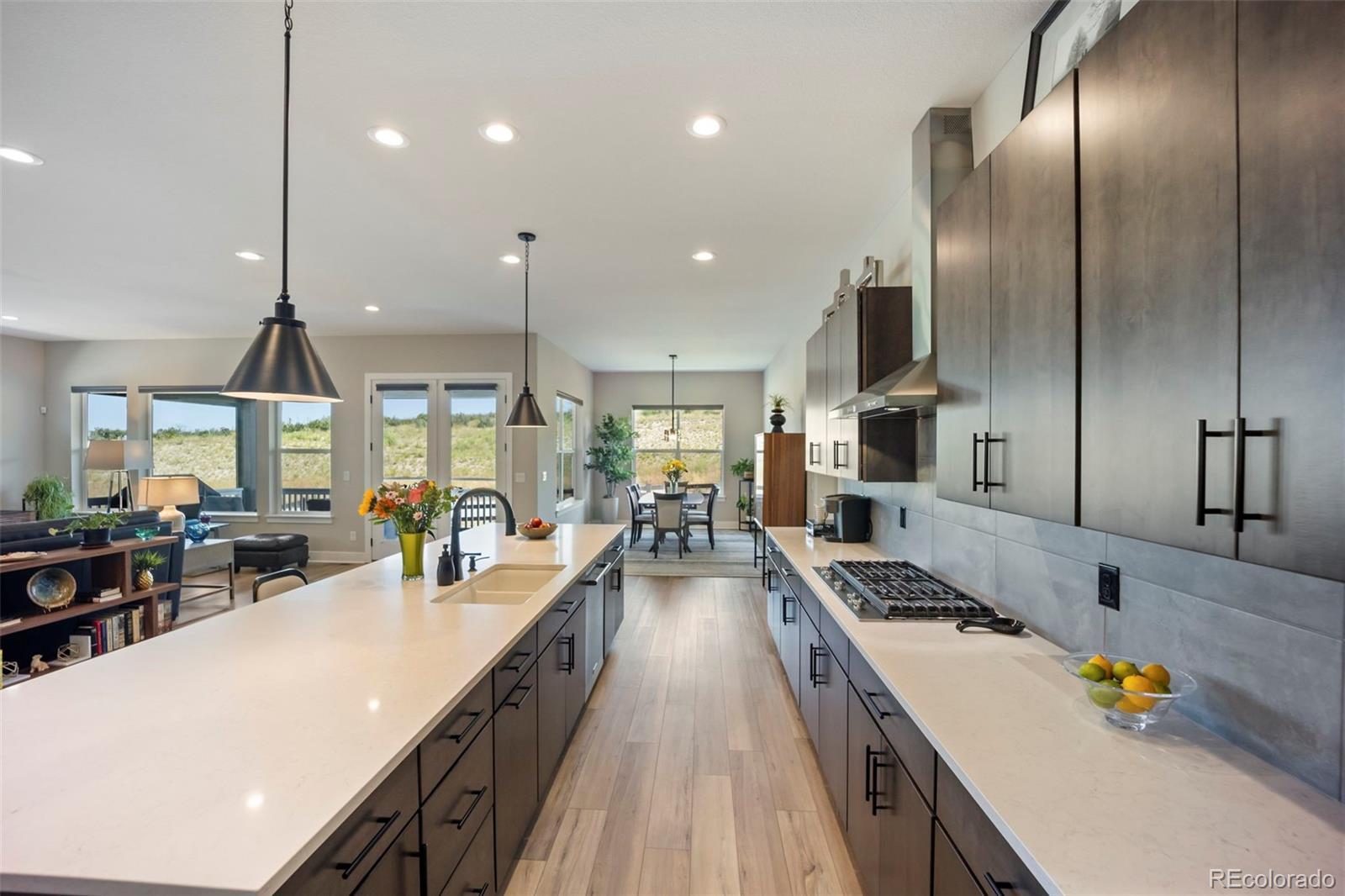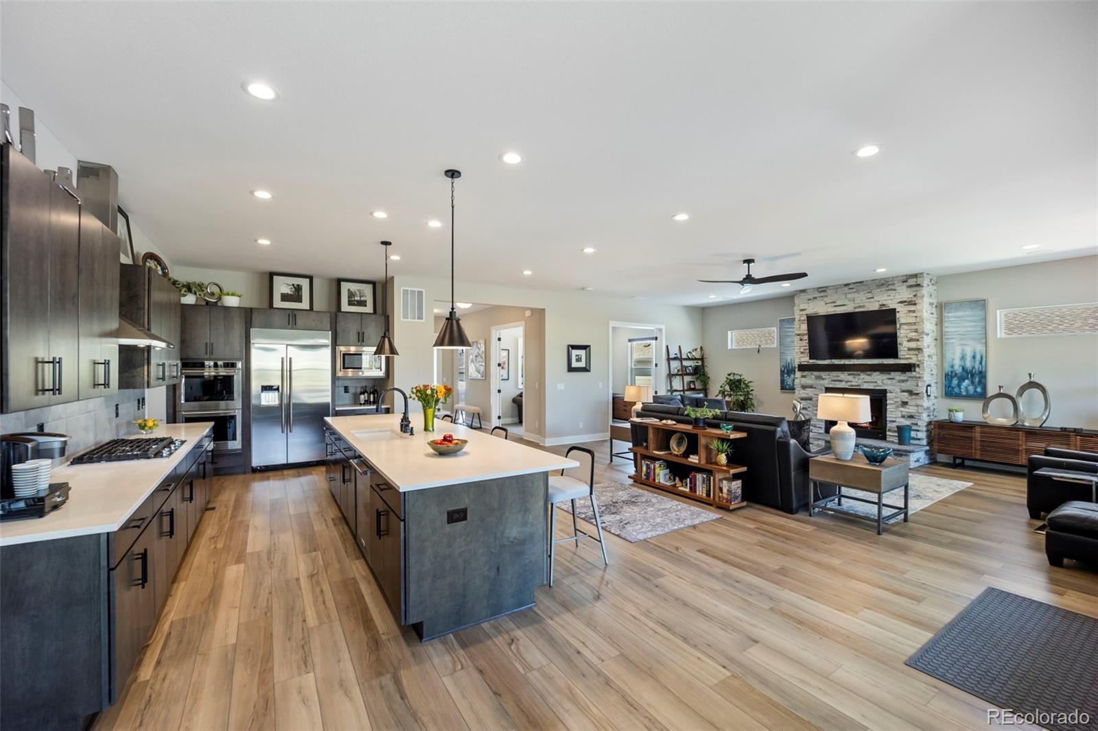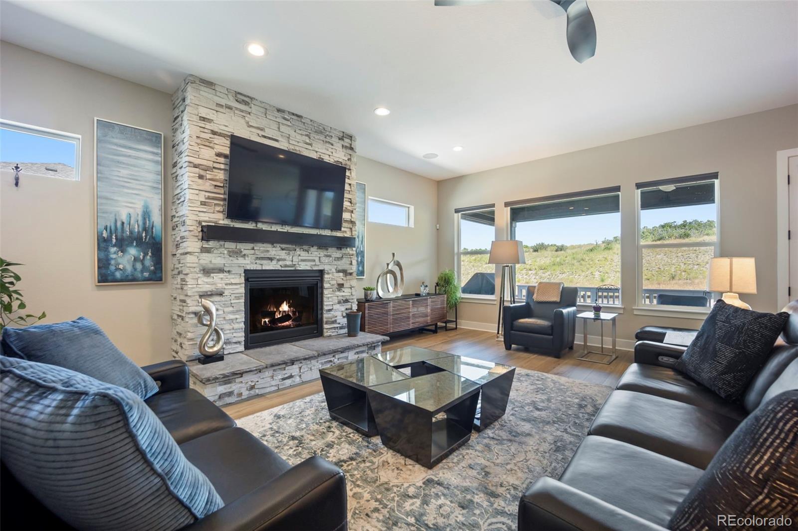 Rare lot w/ open space (rear and side). This extraordinary ranch plan in the coveted "Regency" at Montaine 55+ community offers over 4,700 sq ft (2,720 finished), with thoughtful expansions and luxury upgrades throughout. This nearly new home has unmatched privacy, and elegant design. The open-concept great room has been expanded by over 200 sq ft, creating a gathering space anchored by a floor-to-ceiling stacked stone fireplace. The gourmet kitchen showcases quartz counters, extended island, all upgraded "Yorktowne" cabinetry, KitchenAid double ovens, five-burner cooktop, and built-in Jenn-Air fridge. The great room/dining area opens to a covered patio through French doors, where a motorized sun/wind screen and stained concrete patio provide year-round enjoyment. The primary suite was enlarged, featuring a spa-inspired bathroom w/ upgraded shower enclosure, separate toilet room w/ bidet seat, his/her walk-in closets with custom shelving and drawers. Additional BR has walk-in closet and bath attached. French doors enclose the dedicated office, w/ wired high-speed data. 8-foot solid core doors, additional lighting and electrical upgrades throughout, custom cabinets and shelving in closets, pantry, laundry and garage, plus remote- control window shades on all windows. The insulated and painted garage includes polyaspartic floor coating, while the basement—also finished with polyaspartic flooring—offers a rough-in for an additional bath and ample room for two more BR's, a rec area, or fitness space. Outdoors, the home is fully landscaped w/ pet-rated artificial turf, fenced backyard, and stained concrete entry. Peace of mind comes with storm doors and alarm system. Residents of Regency enjoy resort amenities, including a clubhouse, pool, fitness center, tennis/pickleball courts, and miles of scenic trails. Just minutes from downtown Castle Rock’s shops, dining, and golf, this home perfectly balances luxury, lifestyle, and location.