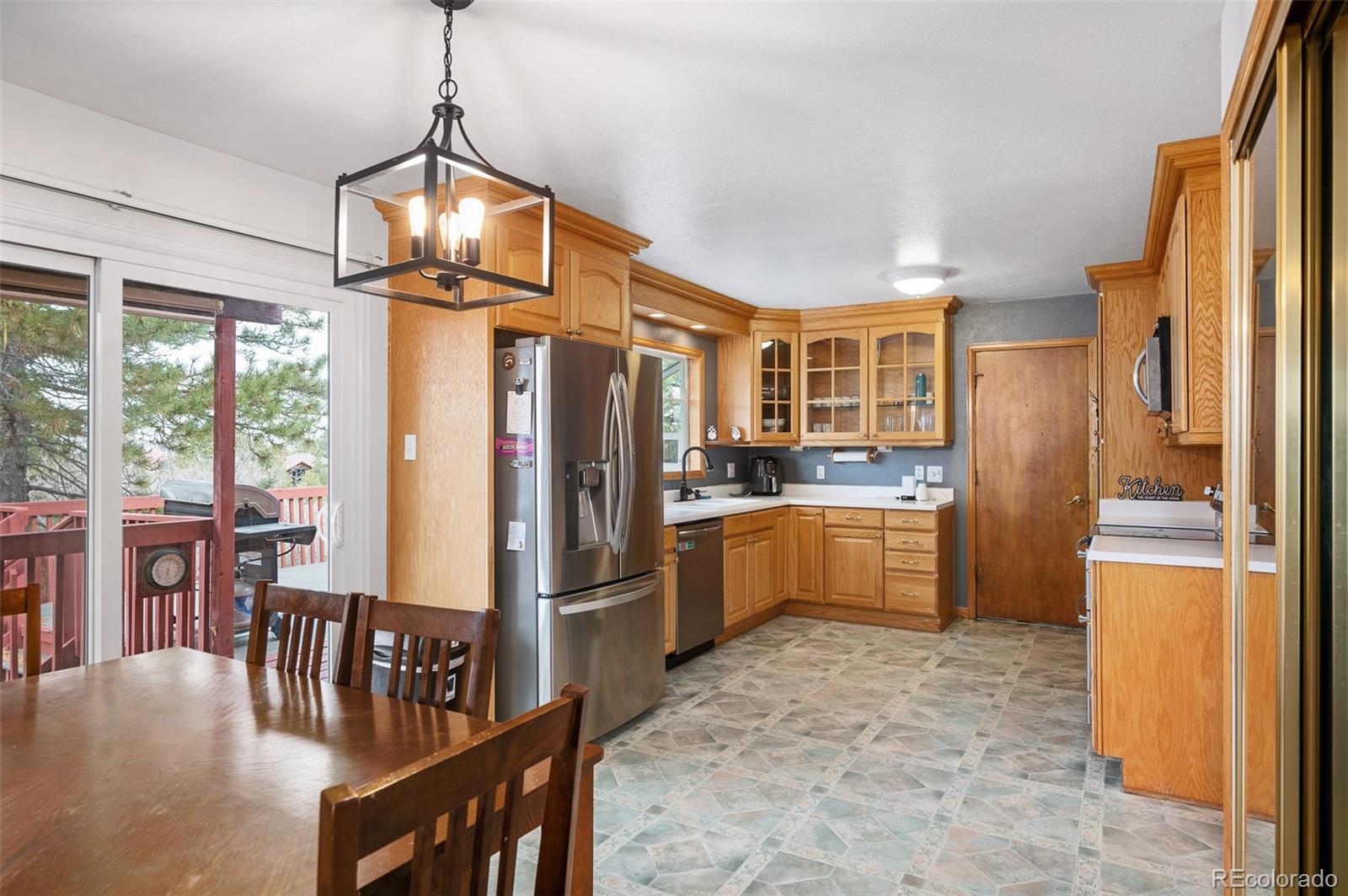 Welcome home to this beautiful walk-out ranch nestled in the highly desirable community of The Pinery. Perfectly positioned on one of the largest private lots in the neighborhood (0.44 acres!), this property offers full panoramic mountain views and an incredible sense of space and privacy. Designed for both relaxation and entertaining, the open-concept floor plan features warm wood floors, two cozy fireplaces, and a practical mudroom entry. Recent updates provide peace of mind and modern comfort, including: Newer windows, roof, and exterior paint Fresh interior paint, carpet, and flooring Updated water heater with expansion tank Radon mitigation system Full architectural plans for a future “pop-top” addition Step outside and take in the Colorado sunshine on your expanded wrap-around wood/Trex deck, perfect for morning coffee or evening gatherings. Enjoy additional features such as a patio with fenced dog run, backyard shed, stamped concrete walkway, and front and back sprinklers. The oversized two-car garage and wide driveway offer ample parking and convenience. Living in The Pinery means embracing a peaceful, mountain-like setting with low HOA fees and optional trash/recycling services. Plus, you’ll love being within walking distance of the local elementary school — a rare find!