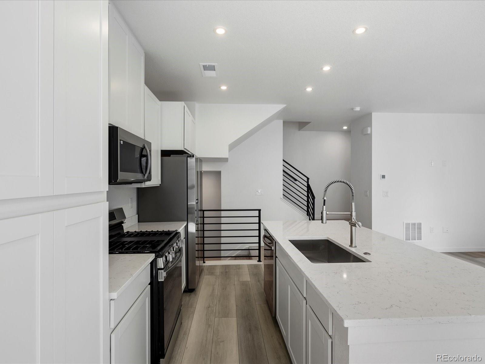 Move-in ready! Ask about special financing offer! Experience the perfect balance of modern living and urban convenience in the heart of Denver. Located minutes from Cherry Creek and downtown, The Hub at Virginia Village offers contemporary townhomes with open-concept layouts, energy-efficient systems, and premium finishes tailored for today’s lifestyle. This impressive three-story Baxter floorplan seamlessly combines smart design and everyday comfort. The lower level features an inviting entryway that leads to a mudroom with a built-in key drop, offering direct access to the attached two-car garage. On the main level, enjoy a bright, open great room that connects to a covered patio — ideal for indoor-outdoor entertaining. The beautifully designed kitchen features Samsung stainless steel appliances, an oversized center island, elevated finishes, and a charming dining area perfect for gathering. Upstairs, two generously sized secondary bedrooms share a full bathroom outfitted with premium Kohler fixtures, while a linen closet and a convenient laundry room add everyday functionality. At the heart of the home is the luxurious primary suite, complete with a spacious walk-in closet and a private bathroom featuring dual vanities and a walk-in shower. Finished in the elevated Grand Lake interior color package, showcasing bright white quartz countertops, clean white cabinetry, and durable, stylish high-quality Shaw flooring, this home feels light, fresh, and welcoming throughout. Built-in smart home features like a Ring video doorbell and a smart garage opener with video capabilities provide security and peace of mind. The Baxter at The Hub is perfect for those seeking a dynamic, well-connected home base that blends modern design, thoughtful details, and unbeatable location. Please note: Home is under construction. Images shown are of a different home with the same floorplan; finishes & view vary.