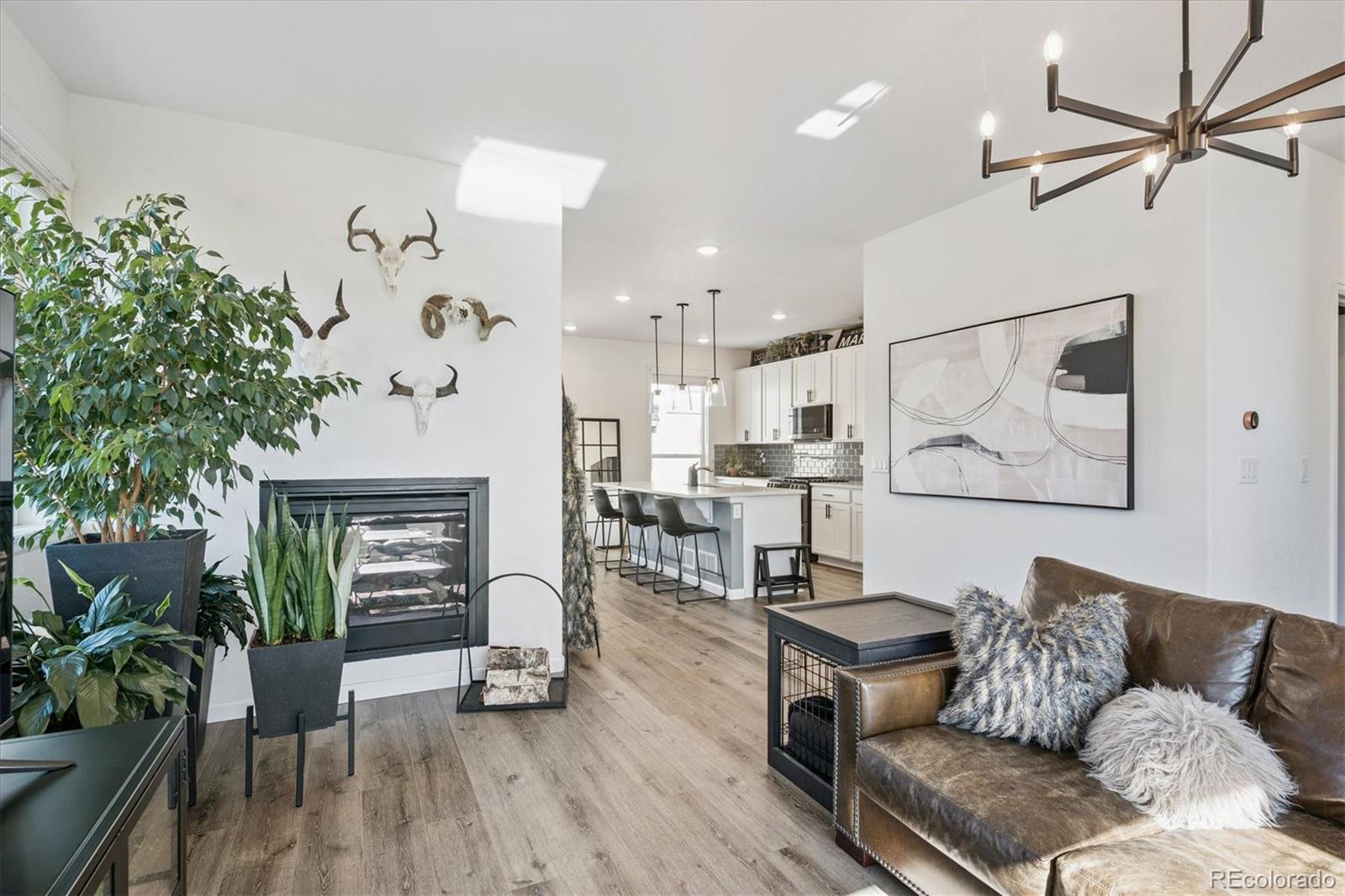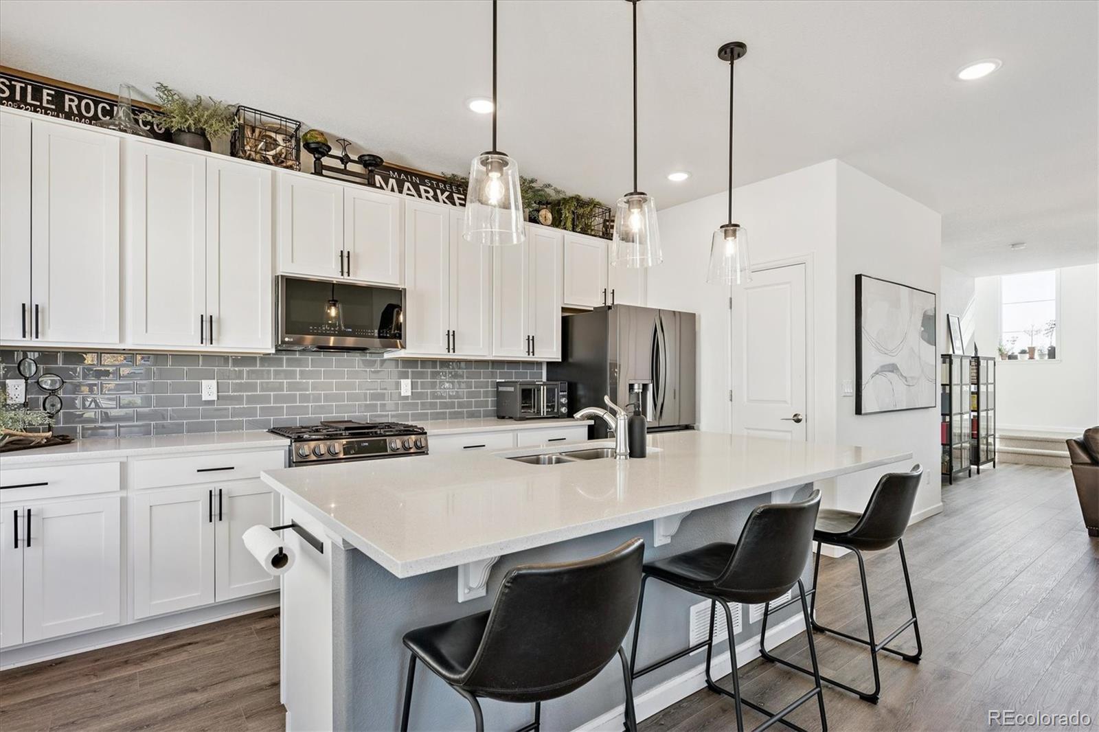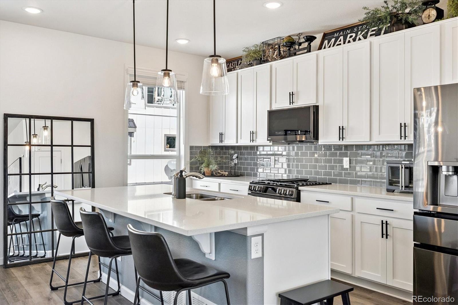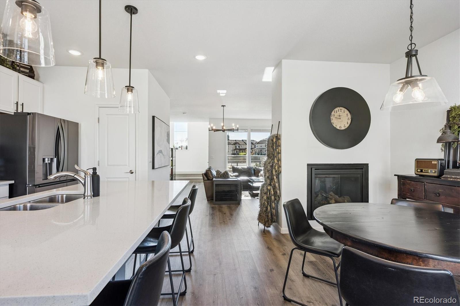 Welcome to this beautifully updated end-unit townhome offering privacy, abundant natural light from three sides, and a modern, move-in-ready interior. The open floorplan is anchored by a stunning double-sided gas fireplace connecting the living and dining areas—creating a warm, inviting, and elegant space for everyday living and entertaining. Step out onto your private end-unit balcony, perfectly positioned for relaxation. The kitchen is a true showpiece, featuring an oversized quartz island, 42” cabinets, pantry, and upgraded black stainless-steel LG appliances including a double oven and gas range. New luxury vinyl plank flooring spans all three levels, paired with new carpet on the stairs and matching blinds throughout. Thoughtful upgrades include updated light fixtures, ceiling fans, bath mirrors and fixtures, cabinet hardware, and timer-controlled exterior lighting. Upstairs, the primary suite offers a reconfigured walk-in closet with double hanging space, while the remodeled laundry room features upper cabinetry and a black stainless-steel LG washer and dryer. An upgraded linen closet with added shelving sits conveniently across from the laundry room. Built in 2018, this home offers low-maintenance living with high-end finishes, a two-car garage, low HOA dues, and exceptional access to Castle Rock’s trails, parks, and downtown amenities. Ideally located minutes from Wilcox Square, Philip S. Miller Park & Trails, the MAC, Challenge Hill, Plum Creek Golf Club, and the Douglas County Fairgrounds.