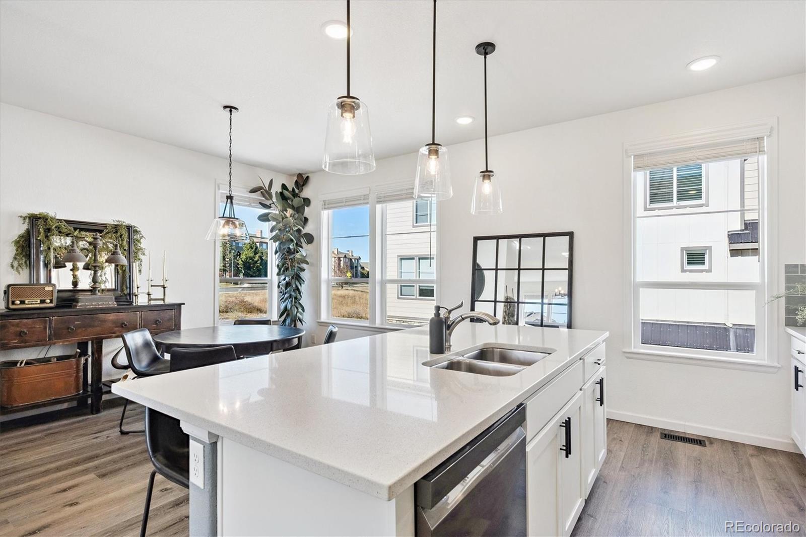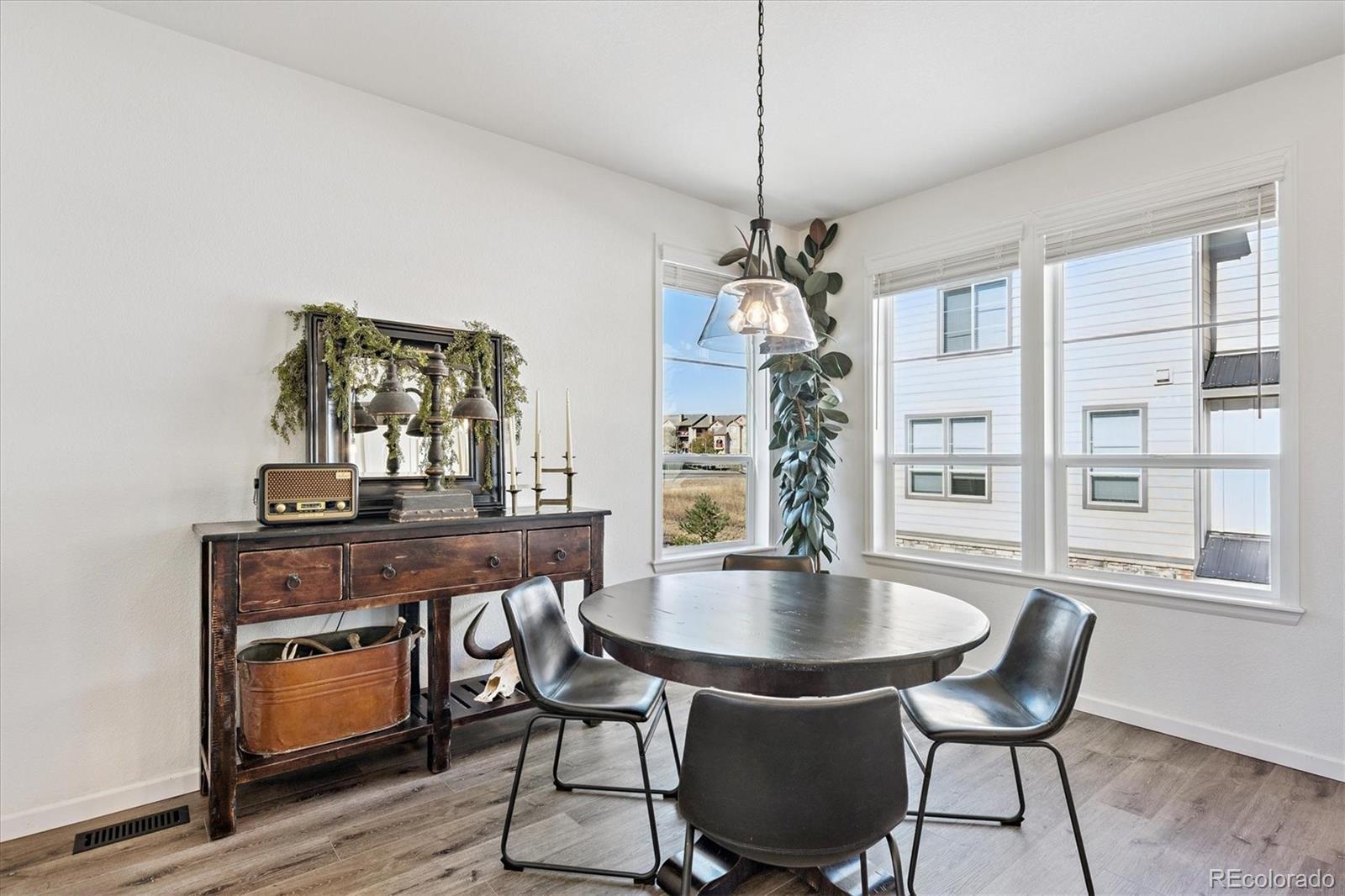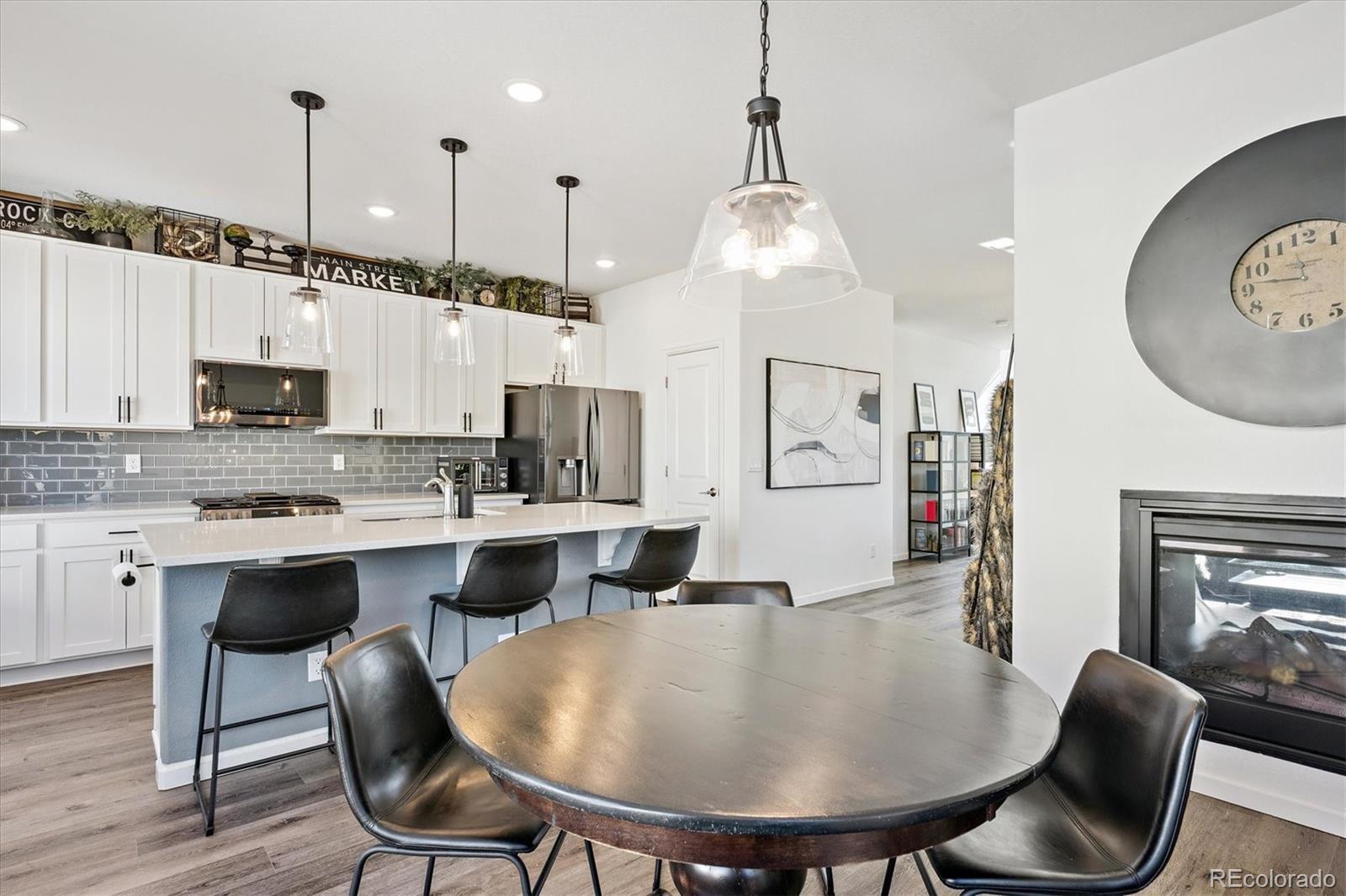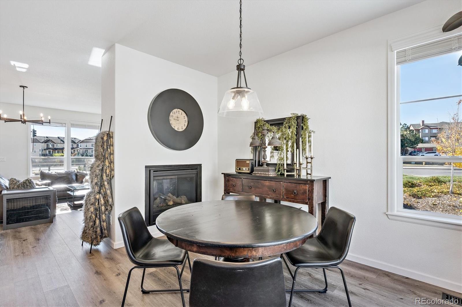 Welcome to this beautifully updated end-unit townhome offering privacy, abundant natural light from three sides, and a modern, move-in-ready interior. The open floorplan is anchored by a stunning double-sided gas fireplace connecting the living and dining areas—creating a warm, inviting, and elegant space for everyday living and entertaining. Step out onto your private end-unit balcony, perfectly positioned for relaxation. The kitchen is a true showpiece, featuring an oversized quartz island, 42” cabinets, pantry, and upgraded black stainless-steel LG appliances including a double oven and gas range. New luxury vinyl plank flooring spans all three levels, paired with new carpet on the stairs and matching blinds throughout. Thoughtful upgrades include updated light fixtures, ceiling fans, bath mirrors and fixtures, cabinet hardware, and timer-controlled exterior lighting. Upstairs, the primary suite offers a reconfigured walk-in closet with double hanging space, while the remodeled laundry room features upper cabinetry and a black stainless-steel LG washer and dryer. An upgraded linen closet with added shelving sits conveniently across from the laundry room. Built in 2018, this home offers low-maintenance living with high-end finishes, a two-car garage, low HOA dues, and exceptional access to Castle Rock’s trails, parks, and downtown amenities. Ideally located minutes from Wilcox Square, Philip S. Miller Park & Trails, the MAC, Challenge Hill, Plum Creek Golf Club, and the Douglas County Fairgrounds.