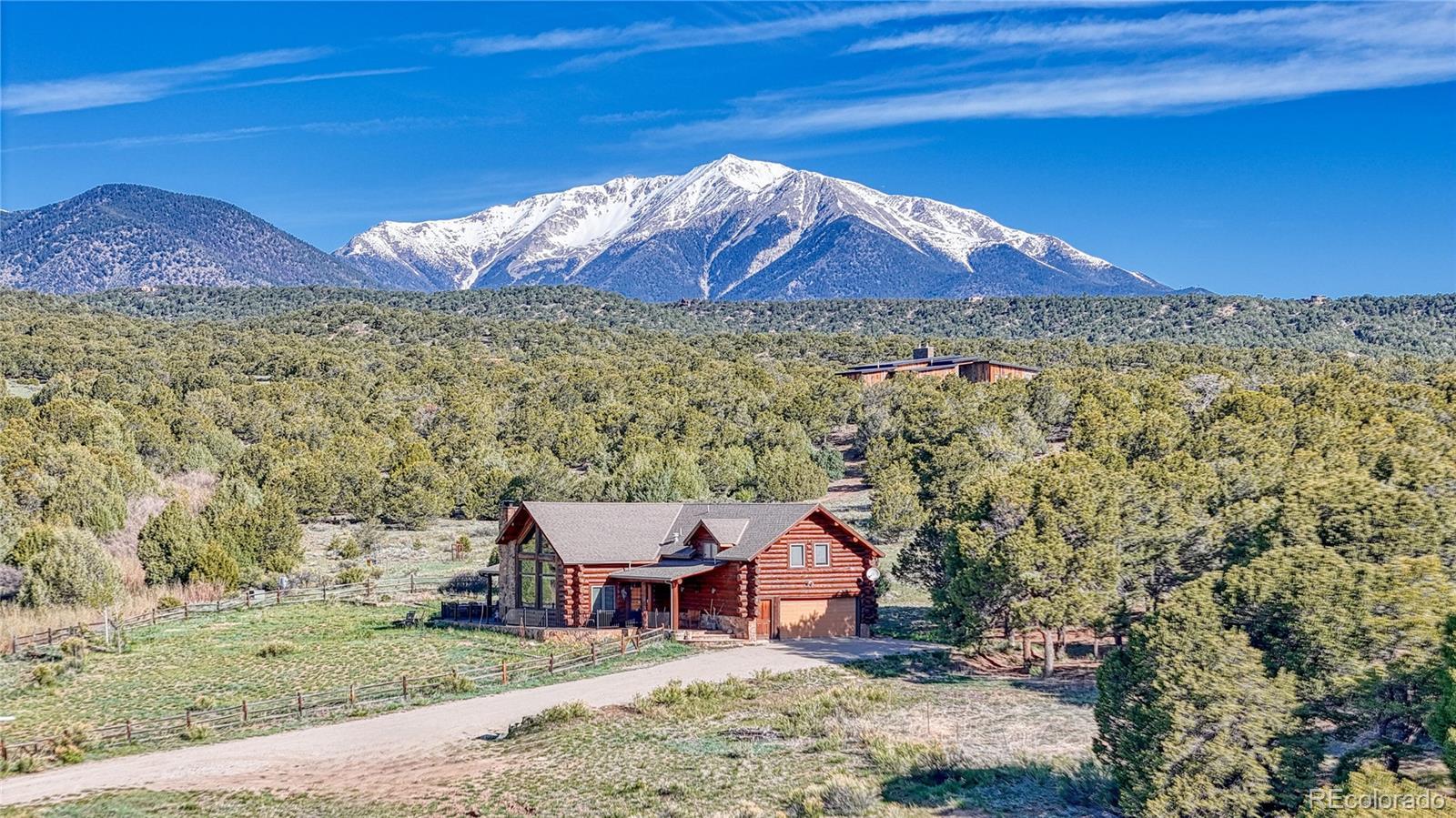 Welcome to Bright Star Ranch, a stunning custom log home set on over 40 acres of fully fenced land, offering unparalleled views of the Collegiate Peaks, San Juans, and Sangre de Cristo mountain ranges. This five-bedroom, plus a den and three-bathroom retreat showcases authentic log craftsmanship both inside and out, with soaring ceilings, expansive picture windows, and a cozy wood fireplace that create a warm and inviting atmosphere. The large primary suite features a private balcony, a luxurious en-suite bath complete with a spacious whirlpool tub and separate shower. The home also comes with the convenience of natural gas and a domestic well, ensuring reliable utilities for year-round living. Recent upgrades include beautifully refinished floors, new kitchen counters and some appliances. Relax and take in the breathtaking scenery from the wrap-around porch, unwind in the private hot tub, or rejuvenate in the sauna. With no HOA restrictions and the rare opportunity to build two additional homes on the property, this is a true legacy estate with endless possibilities. Whether you’re seeking a multi-generational living setup, a guest retreat, or an investment opportunity, Bright Star Ranch offers the flexibility to bring your vision to life. The attached two-car garage provides ample space for vehicles and gear, while the expansive property is ideal for equestrian enthusiasts. Bright Star Ranch offers the perfect blend of privacy, comfort, and mountain living — a true Colorado retreat ready to be your next adventure. Please see our virtual tour!
