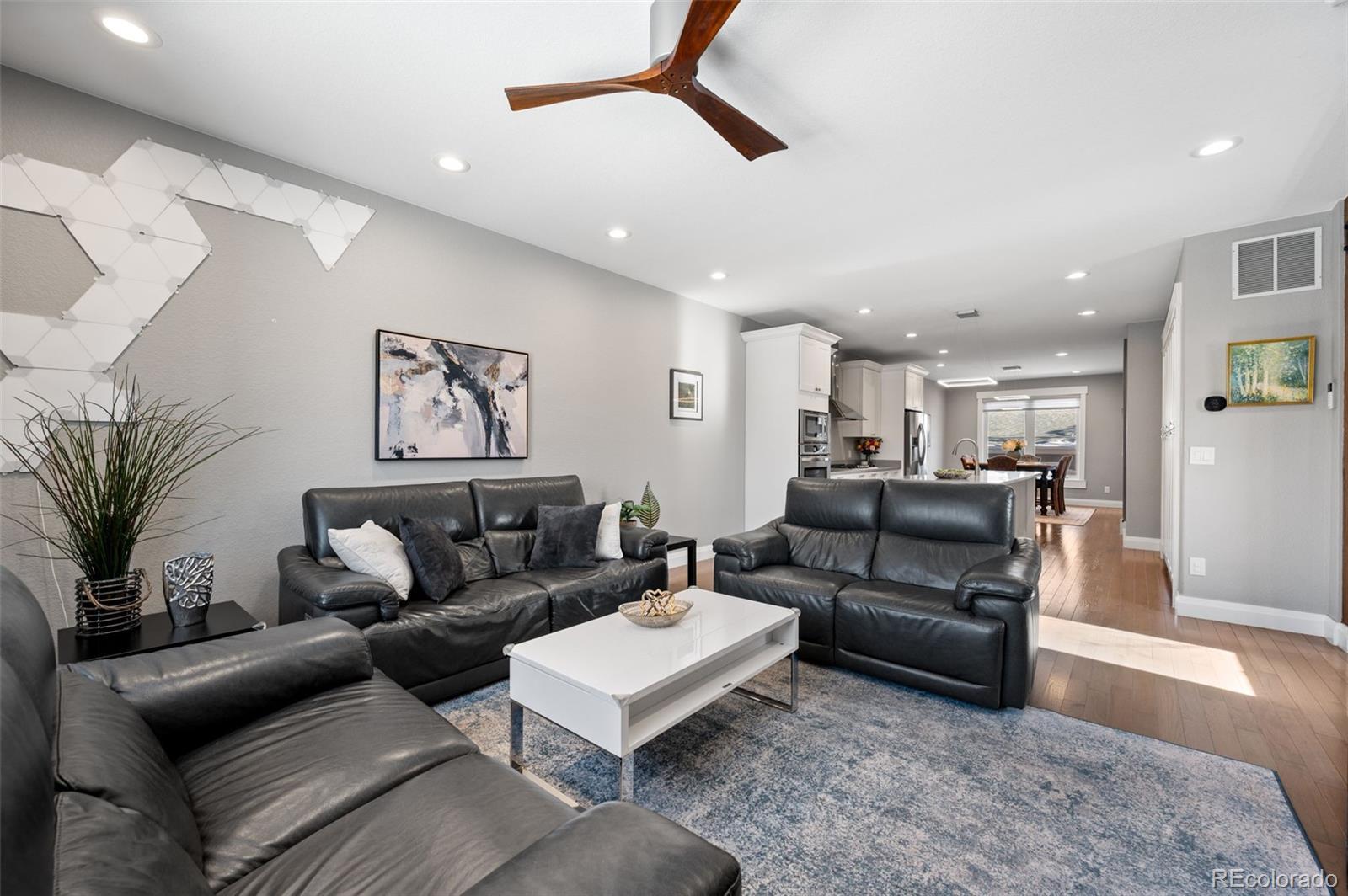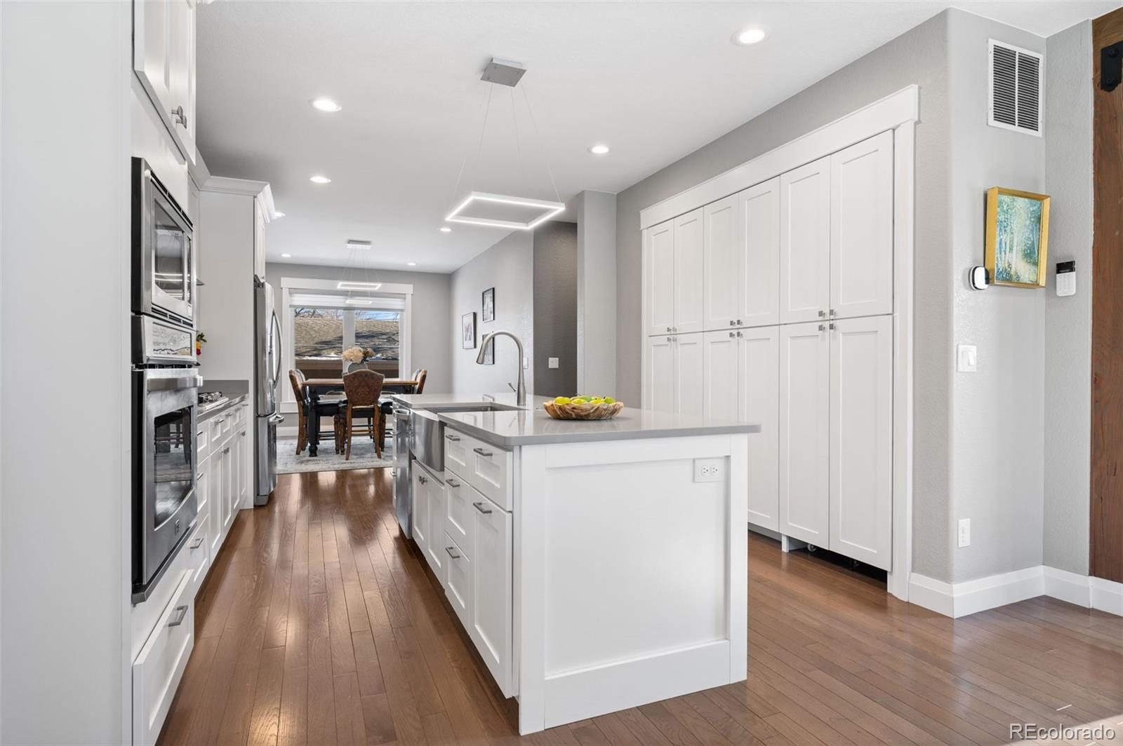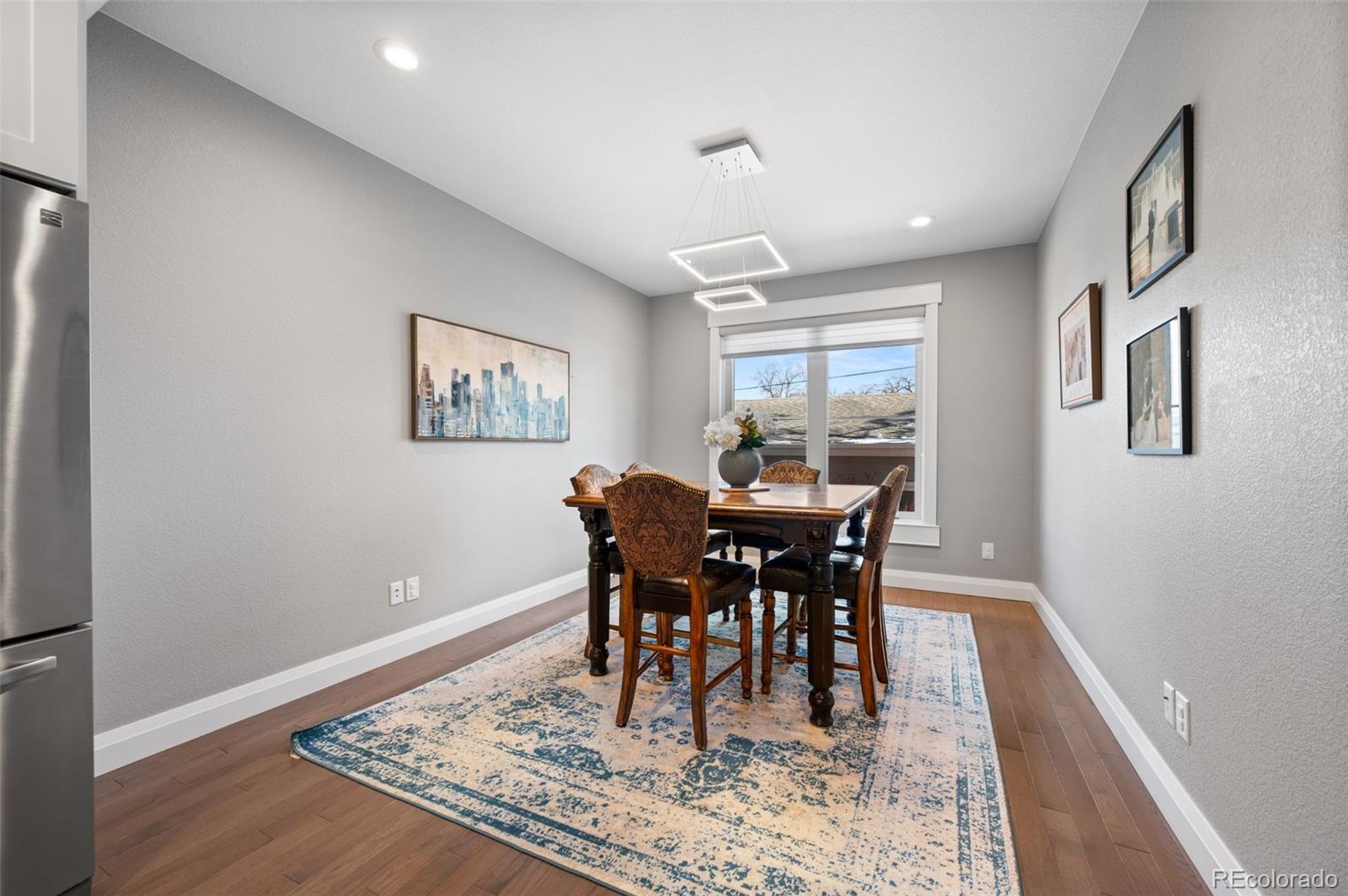 This stunning 3-bedroom, 3-bath duplex offers the perfect blend of thoughtful design, quality craftsmanship, and inviting living spaces. The two-story layout with a garden-level basement is filled with natural light, enhanced by above-ground windows and recessed window detailing. The main level is designed for everyday living and effortless entertaining, featuring a spacious family room, generous dining area, and beautiful engineered wood floors. The kitchen is a true centerpiece, showcasing dovetailed white cabinetry with soft-close drawers, stainless steel appliances, gas cooktop with hood, and a large island with optional seating. Custom solid wood accents and beams add warmth and character, while modern lighting and exquisite custom paint elevate every room. Upstairs, a flexible space—ideal for a home office —leads to a private top-floor primary suite retreat. This serene getaway features mountain views, a large walk-in closet, and a luxurious five-piece primary bathroom with dual sinks, a soaking tub, and soaring 9’6” ceilings. The garden-level basement offers an additional family room complete with pristine cabinetry, and bar sink, creating an ideal space for entertaining or relaxing. Throughout the home, you’ll find custom-cut window coverings, 6-inch trim, and 9-foot ceilings on the main floor, highlighting the home’s quality construction and attention to detail. Step outside to enjoy a private fenced patio with landscaping, perfect for quiet mornings or evening gatherings. Practical features include french drains, no side window wells or equipment—allowing for functional outdoor space or a dog run—and an oversized 20x24 garage. Ideally located within walking distance to Cushing Park, Englewood Shopping Center, Bishop Elementary School, public transportation, the Englewood Library, and dining, shopping, and entertainment along South Broadway. This home offers both comfort and convenience in an unbeatable Englewood location.