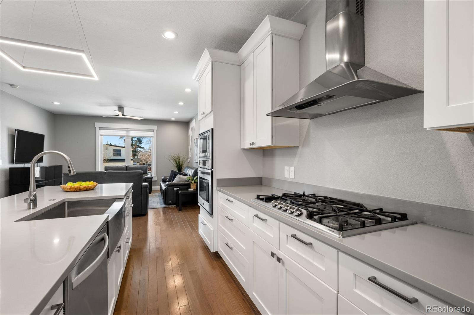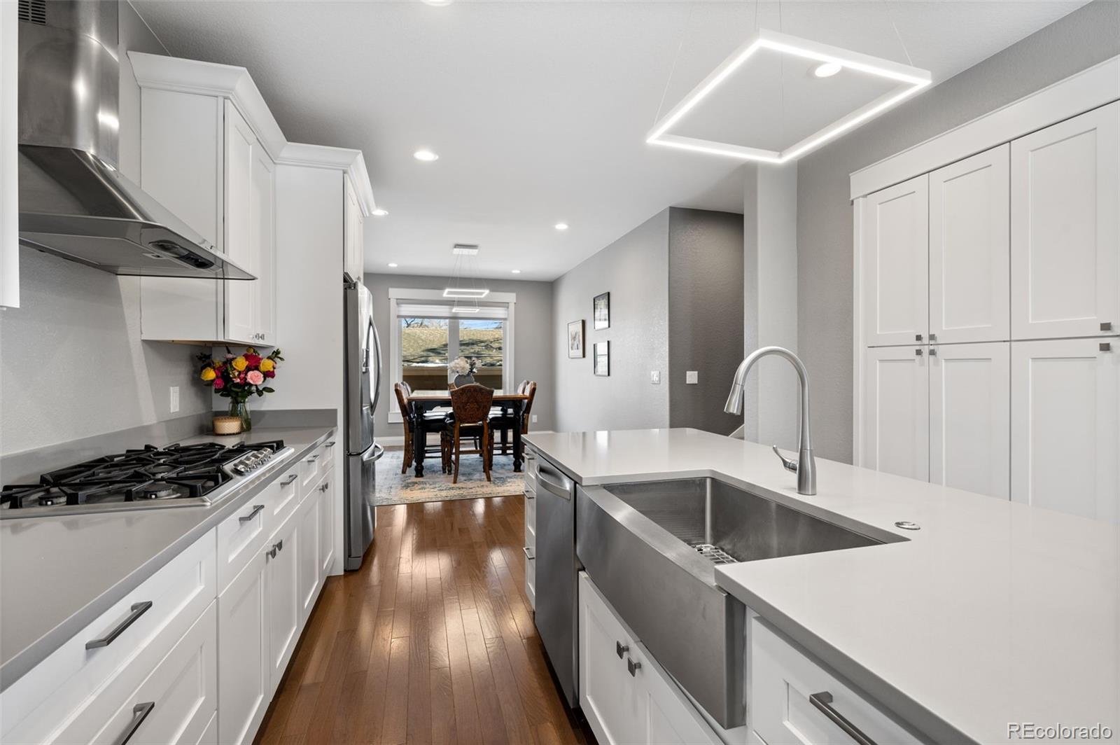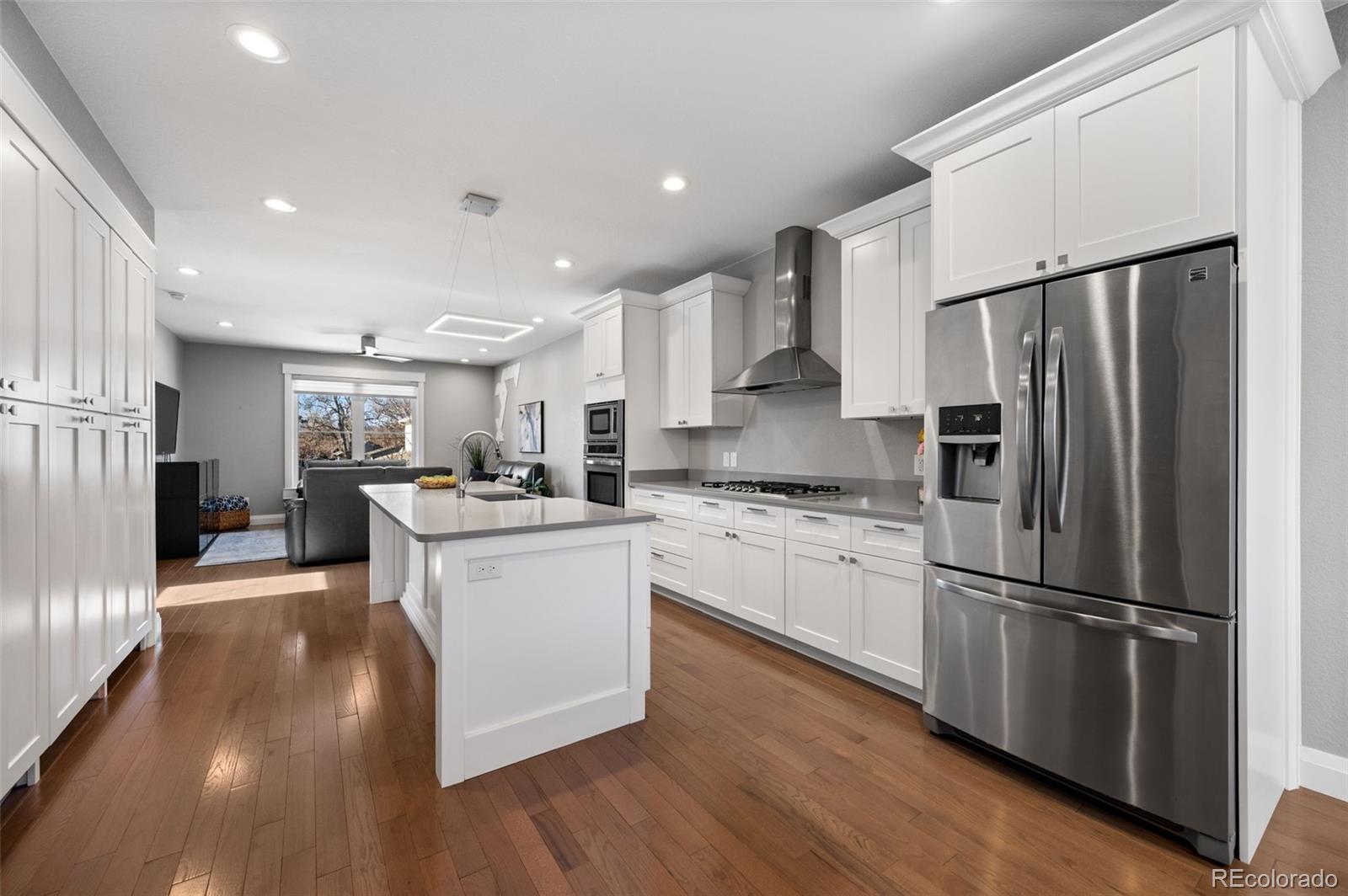 This stunning 3-bedroom, 3-bath duplex offers the perfect blend of thoughtful design, quality craftsmanship, and inviting living spaces. The two-story layout with a garden-level basement is filled with natural light, enhanced by above-ground windows and recessed window detailing. The main level is designed for everyday living and effortless entertaining, featuring a spacious family room, generous dining area, and beautiful engineered wood floors. The kitchen is a true centerpiece, showcasing dovetailed white cabinetry with soft-close drawers, stainless steel appliances, gas cooktop with hood, and a large island with optional seating. Custom solid wood accents and beams add warmth and character, while modern lighting and exquisite custom paint elevate every room. Upstairs, a flexible space—ideal for a home office —leads to a private top-floor primary suite retreat. This serene getaway features mountain views, a large walk-in closet, and a luxurious five-piece primary bathroom with dual sinks, a soaking tub, and soaring 9’6” ceilings. The garden-level basement offers an additional family room complete with pristine cabinetry, and bar sink, creating an ideal space for entertaining or relaxing. Throughout the home, you’ll find custom-cut window coverings, 6-inch trim, and 9-foot ceilings on the main floor, highlighting the home’s quality construction and attention to detail. Step outside to enjoy a private fenced patio with landscaping, perfect for quiet mornings or evening gatherings. Practical features include french drains, no side window wells or equipment—allowing for functional outdoor space or a dog run—and an oversized 20x24 garage. Ideally located within walking distance to Cushing Park, Englewood Shopping Center, Bishop Elementary School, public transportation, the Englewood Library, and dining, shopping, and entertainment along South Broadway. This home offers both comfort and convenience in an unbeatable Englewood location.