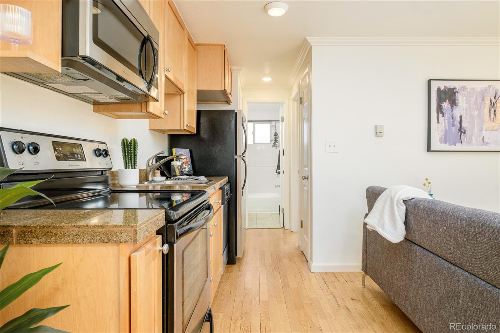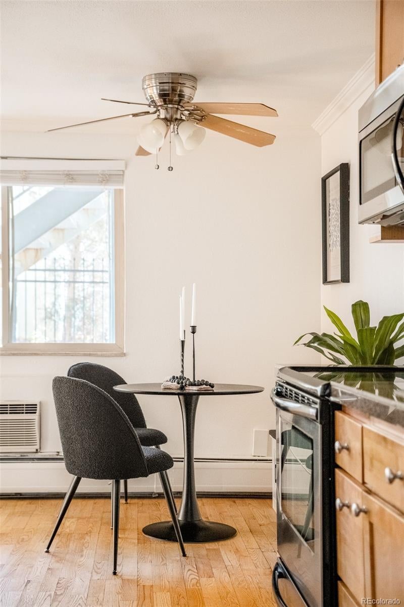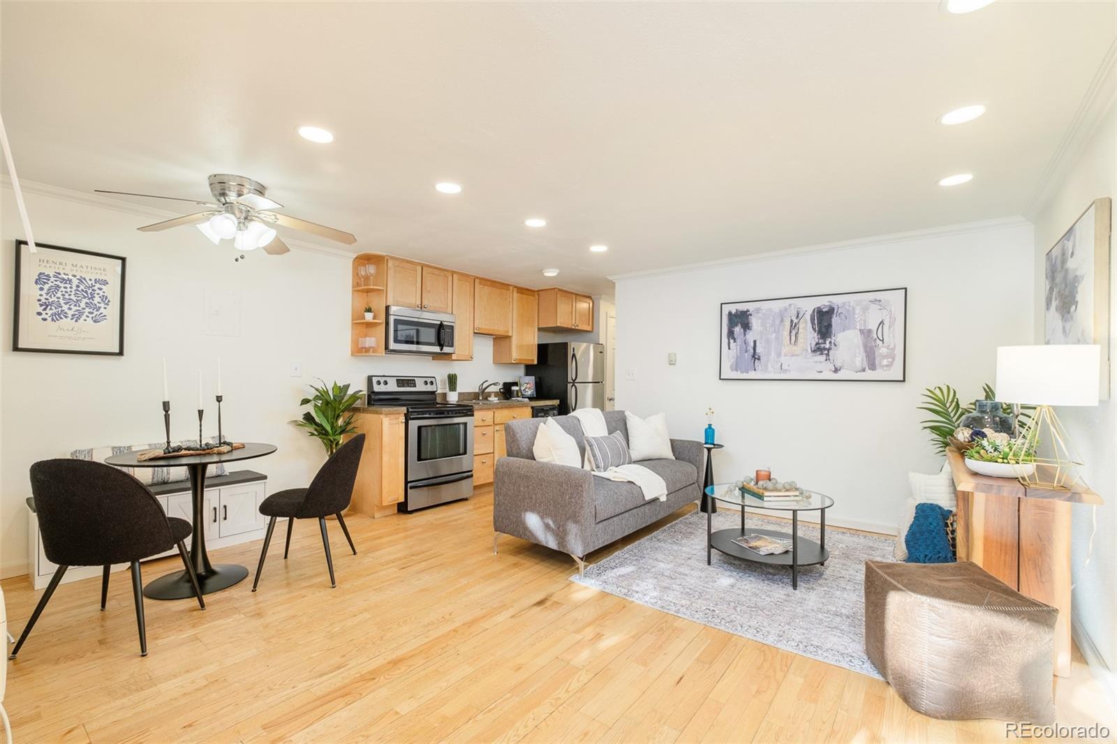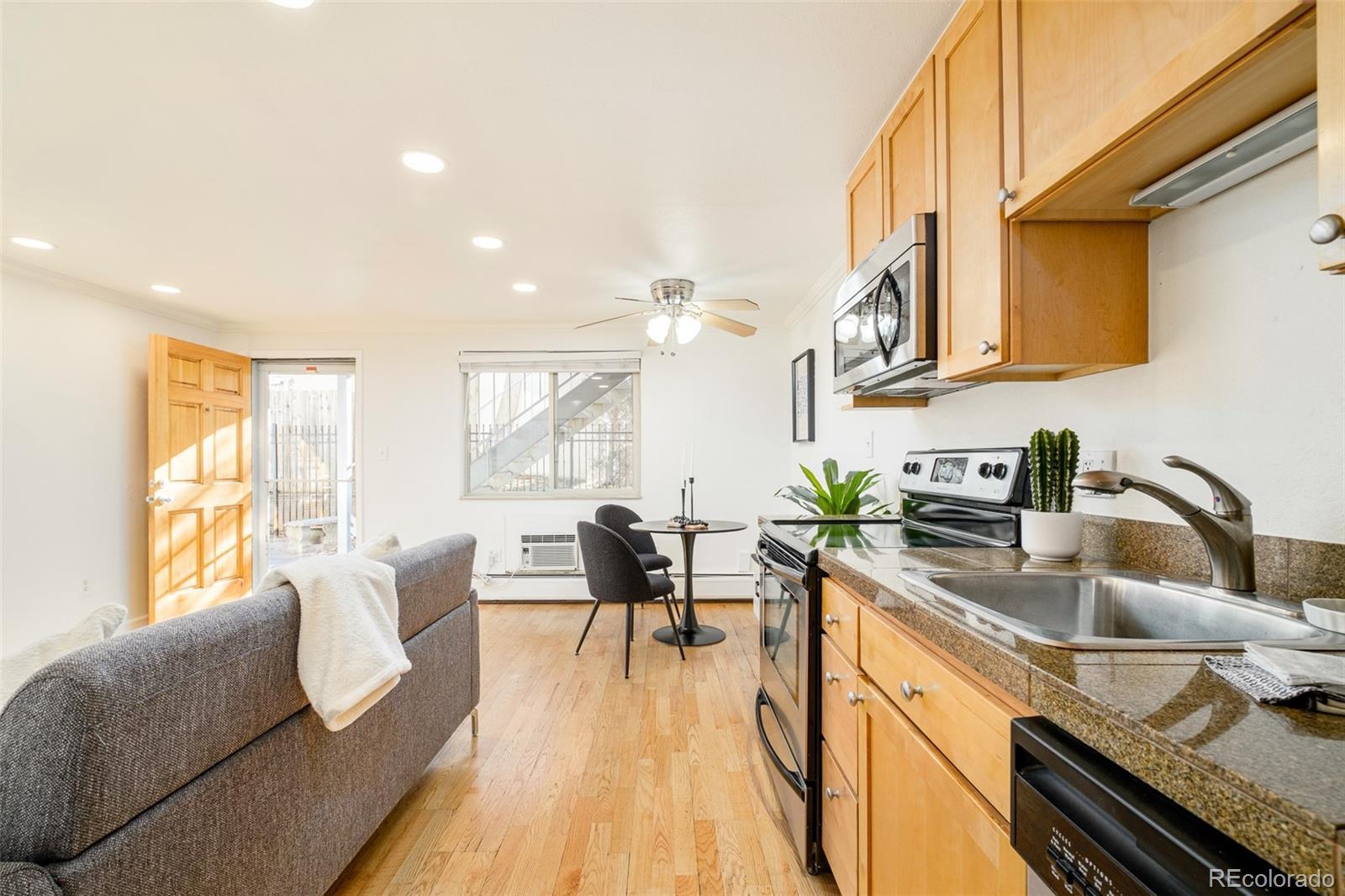 Perfectly positioned in the heart of Congress Park, this charming residence offers thoughtful design in a prime location. Move-in ready and recently refreshed with a fresh coat of paint, this condo offers a highly functional open-concept layout that lives larger than its footprint. Hardwood floors flow through a well-proportioned living room and bedroom, while large windows invite abundant natural light throughout the day. A separate dining area adds flexibility for everyday living or entertaining, complemented by a full bath and ample storage, including an additional dedicated storage room. Set within a smaller, well-maintained complex, residents enjoy access to an outdoor courtyard and the convenience of laundry just a stone’s throw from the unit. An off-street parking space completes the offering. With cafés, restaurants, public transit and outdoor spaces just around the corner on 12th Avenue, this Congress Park condo delivers effortless urban living in a central Denver neighborhood.