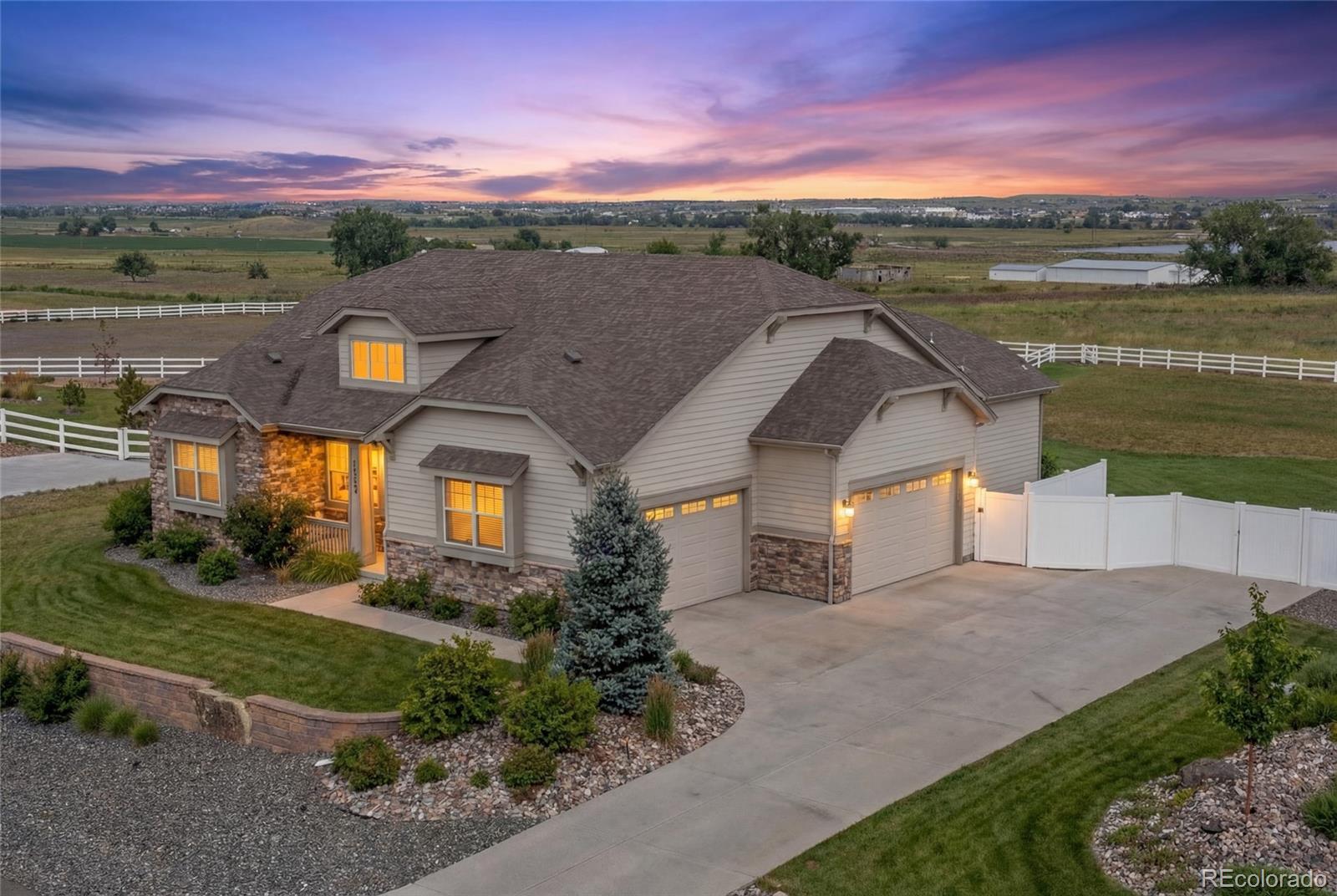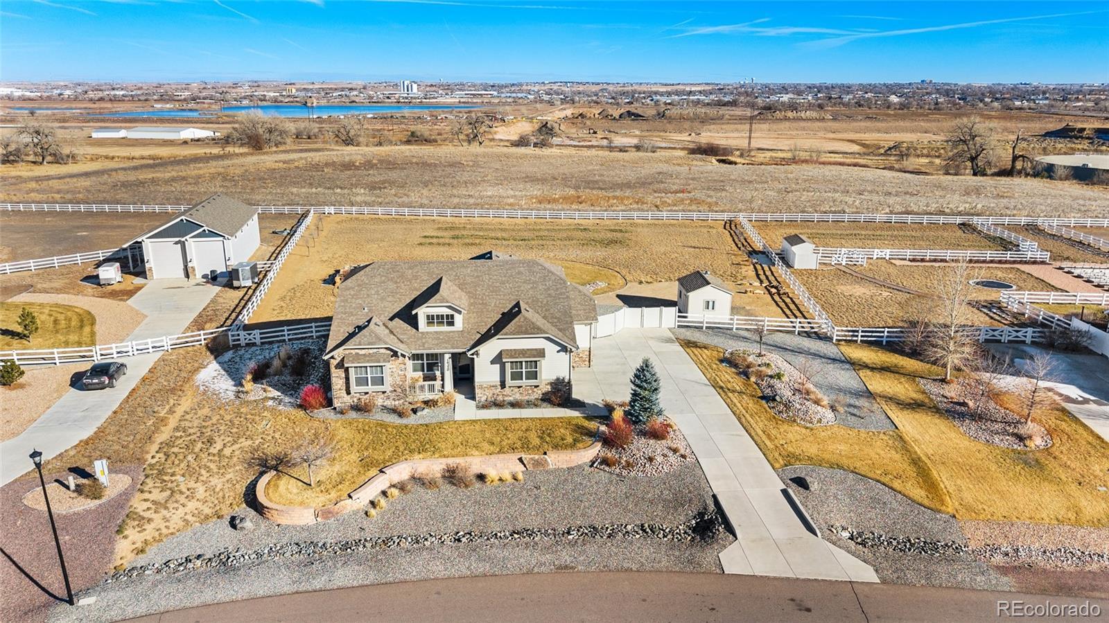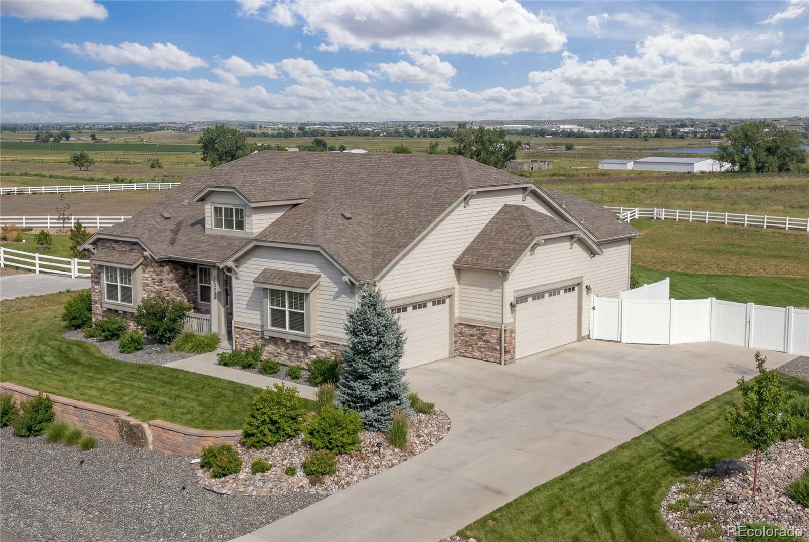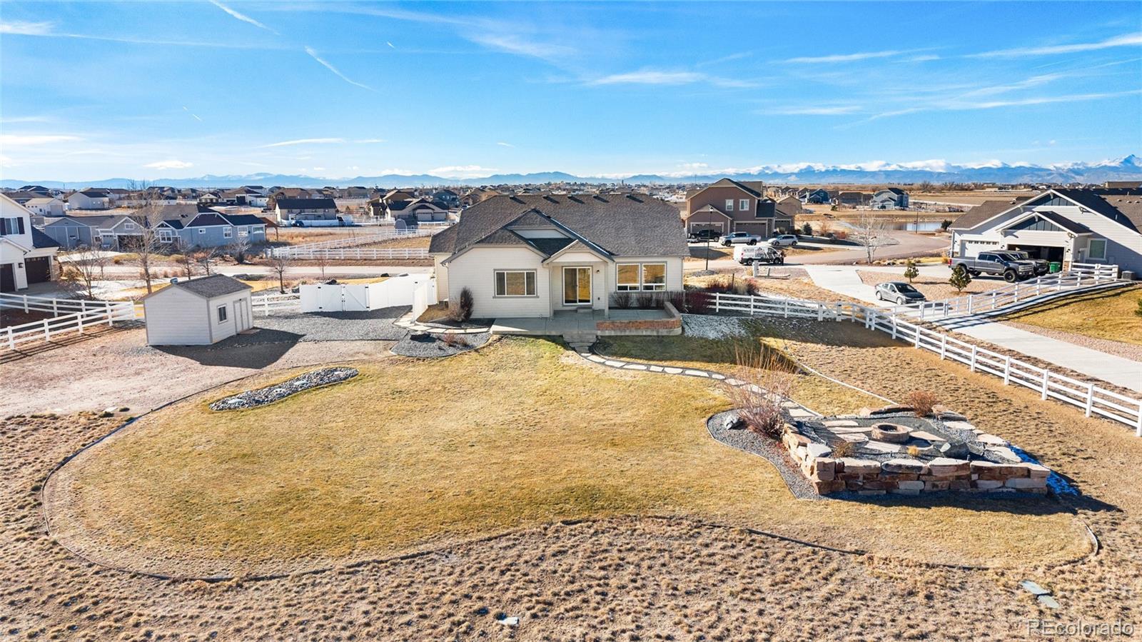 Elegant contemporary ranch on 1.32 acres in Todd Creek Riverside with amazing Front Range and mountain views. The main level features 10-foot ceilings, 3/8-inch engineered wood flooring in the kitchen and family room and a beautifully open inviting layout. The gourmet kitchen is appointed with a large granite island, granite countertops, 42-inch cabinetry, stainless steel appliances including a gas cooktop. The main level offers two bedrooms plus a private office with French doors that can easily convert to a third main-level bedroom. The primary suite includes dual walk-in closets and a soaking tub. Perfect for unwinding after a long day! The finished basement with 8-foot ceilings expands the living space with a spacious great room and wet bar, ideal for entertaining or multi-generational living, along with one additional bedroom and a full bathroom. Storage is abundant with a large shelved storage room, storage under the stairs, unfinished basement storage space, and a generous crawl space. The home is equipped with a passive radon mitigation system, offering added peace of mind. The heated, insulated and finished 4-car garage includes a 50 amp, 240-volt outlet ready for EV charging or shop. Space for all your toys! Outdoor living shines with a covered patio, natural gas fire pit, a 12 x 16 shed with low voltage lighting and room for an outbuilding. Oil and gas rights are included. HOA allows horses, goats, and chickens! Ideally located minutes from shopping, dining, and DIA, this home offers refined living, privacy, and timeless Colorado beauty.