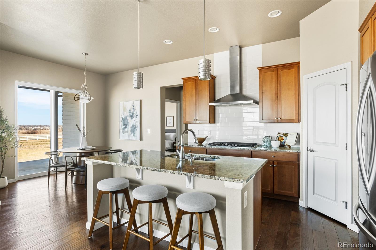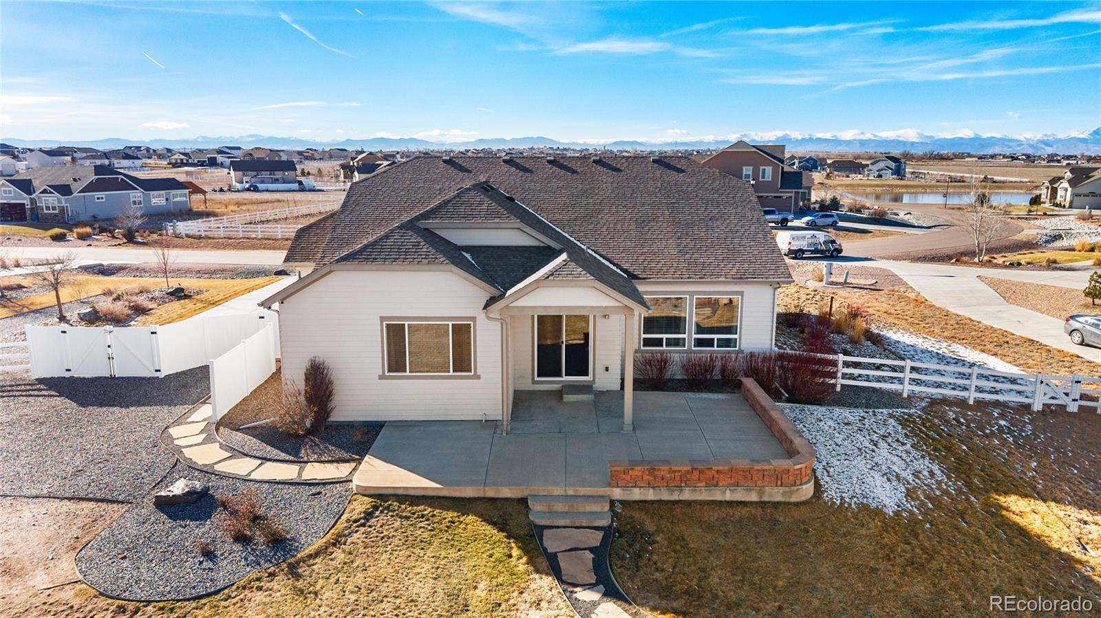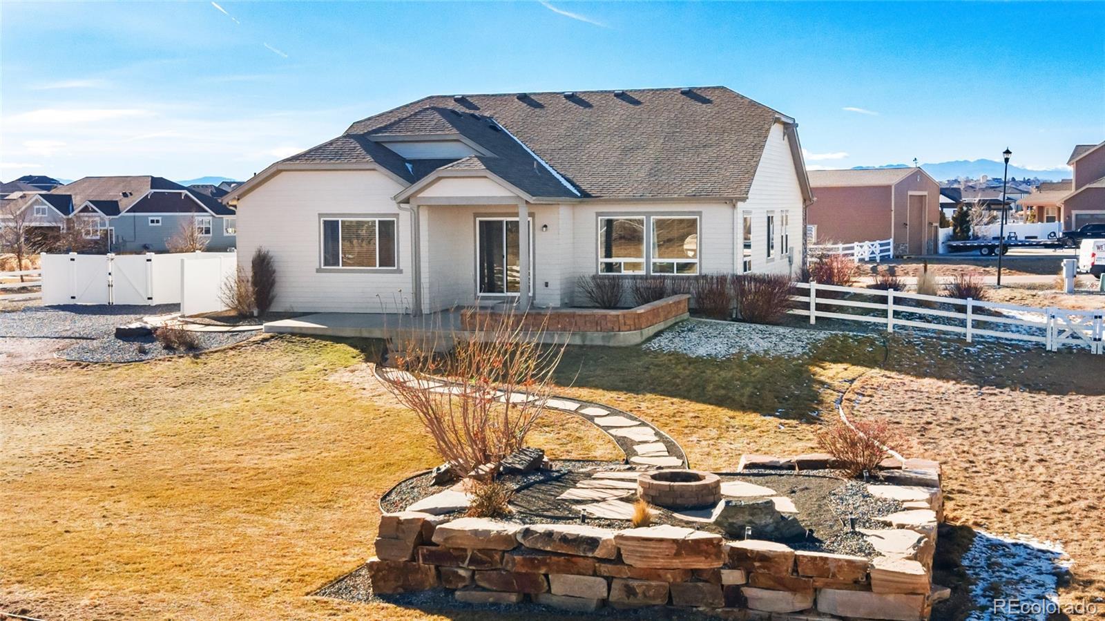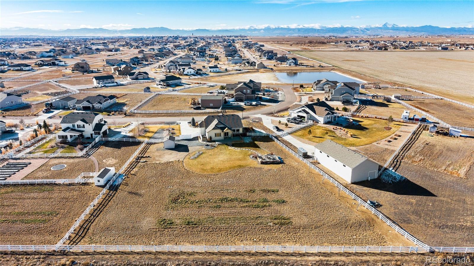 Elegant contemporary ranch on 1.32 acres in Todd Creek Riverside with amazing Front Range and mountain views. The main level features 10-foot ceilings, 3/8-inch engineered wood flooring in the kitchen and family room and a beautifully open inviting layout. The gourmet kitchen is appointed with a large granite island, granite countertops, 42-inch cabinetry, stainless steel appliances including a gas cooktop. The main level offers two bedrooms plus a private office with French doors that can easily convert to a third main-level bedroom. The primary suite includes dual walk-in closets and a soaking tub. Perfect for unwinding after a long day! The finished basement with 8-foot ceilings expands the living space with a spacious great room and wet bar, ideal for entertaining or multi-generational living, along with one additional bedroom and a full bathroom. Storage is abundant with a large shelved storage room, storage under the stairs, unfinished basement storage space, and a generous crawl space. The home is equipped with a passive radon mitigation system, offering added peace of mind. The heated, insulated and finished 4-car garage includes a 50 amp, 240-volt outlet ready for EV charging or shop. Space for all your toys! Outdoor living shines with a covered patio, natural gas fire pit, a 12 x 16 shed with low voltage lighting and room for an outbuilding. Oil and gas rights are included. HOA allows horses, goats, and chickens! Ideally located minutes from shopping, dining, and DIA, this home offers refined living, privacy, and timeless Colorado beauty.