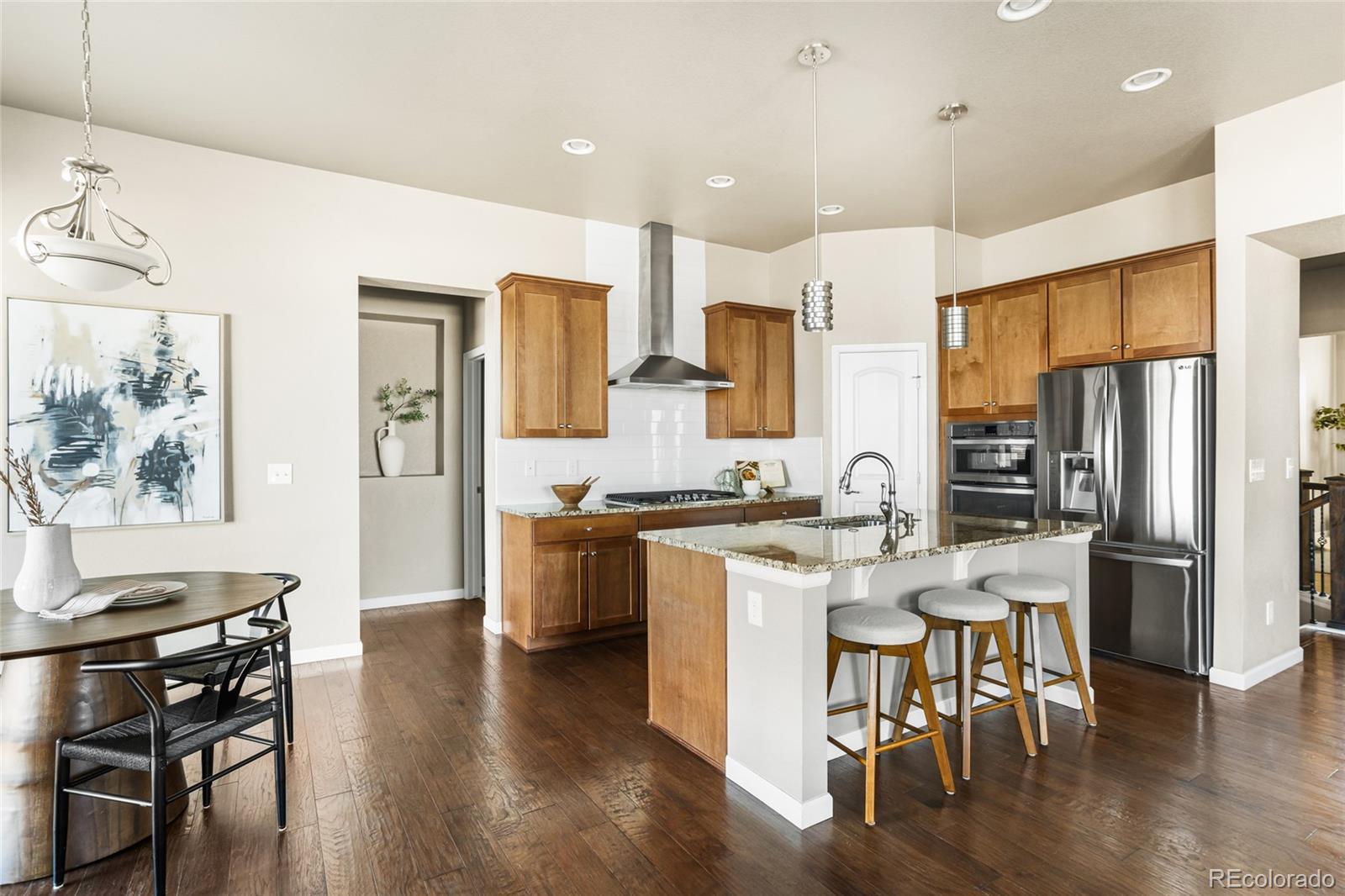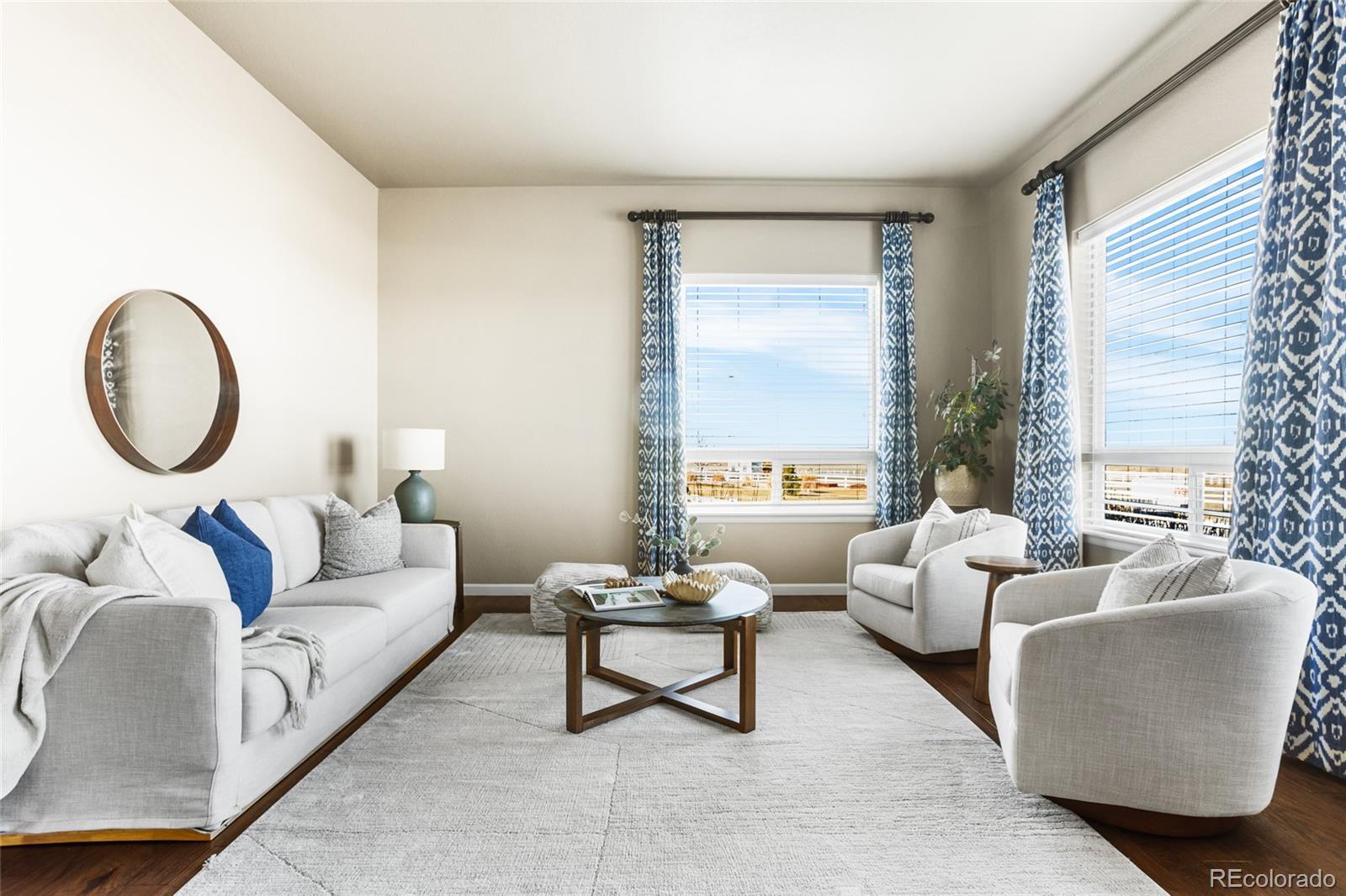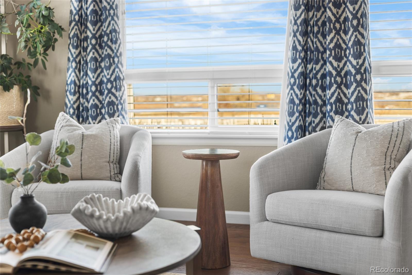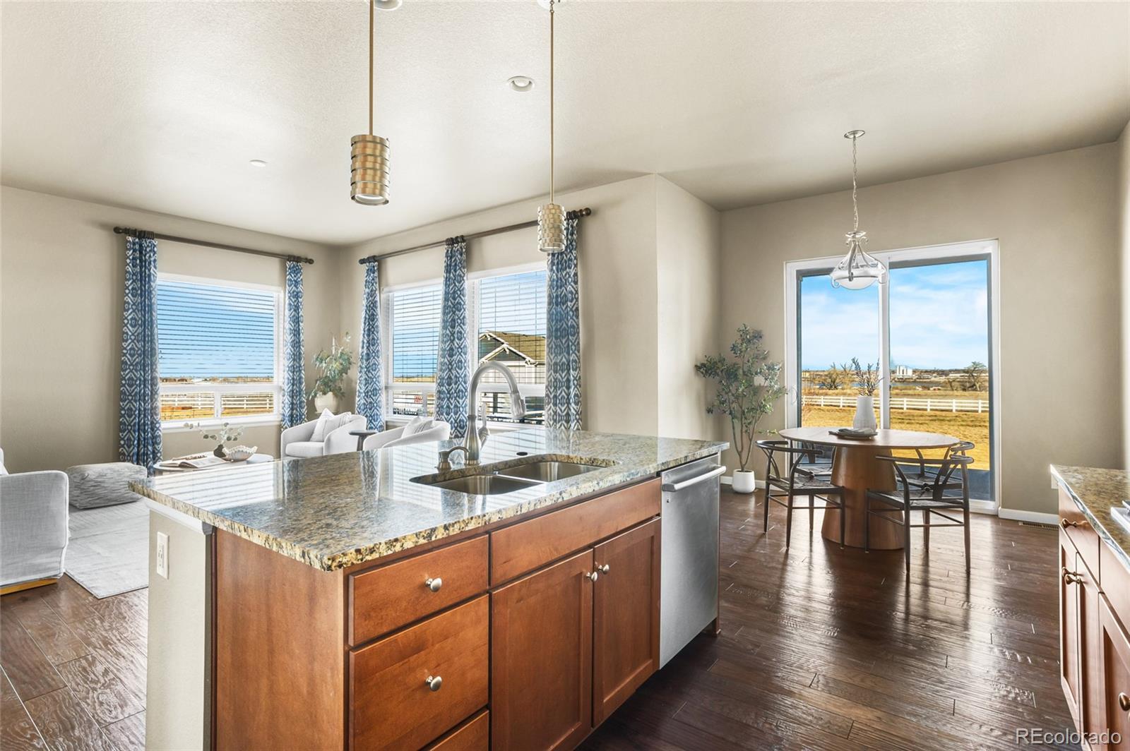 Elegant contemporary ranch on 1.32 acres in Todd Creek Riverside with amazing Front Range and mountain views. The main level features 10-foot ceilings, 3/8-inch engineered wood flooring in the kitchen and family room and a beautifully open inviting layout. The gourmet kitchen is appointed with a large granite island, granite countertops, 42-inch cabinetry, stainless steel appliances including a gas cooktop. The main level offers two bedrooms plus a private office with French doors that can easily convert to a third main-level bedroom. The primary suite includes dual walk-in closets and a soaking tub. Perfect for unwinding after a long day! The finished basement with 8-foot ceilings expands the living space with a spacious great room and wet bar, ideal for entertaining or multi-generational living, along with one additional bedroom and a full bathroom. Storage is abundant with a large shelved storage room, storage under the stairs, unfinished basement storage space, and a generous crawl space. The home is equipped with a passive radon mitigation system, offering added peace of mind. The heated, insulated and finished 4-car garage includes a 50 amp, 240-volt outlet ready for EV charging or shop. Space for all your toys! Outdoor living shines with a covered patio, natural gas fire pit, a 12 x 16 shed with low voltage lighting and room for an outbuilding. Oil and gas rights are included. HOA allows horses, goats, and chickens! Ideally located minutes from shopping, dining, and DIA, this home offers refined living, privacy, and timeless Colorado beauty.