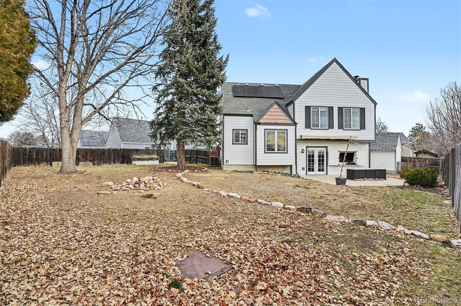 Updated & Move-In Ready in an Unbeatable Location with Mountain Views! Less than five minutes from the shops and restaurants of Olde Town Arvada, this beautifully updated home sits on a large lot at the end of a quiet cul-de-sac, offering excellent curb appeal and a matching storage shed. A fully owned solar system with 25-year warranty adds efficiency and long-term savings. Step inside to soaring ceilings and a light, bright, open floor plan filled with designer finishes throughout. The stunning updated kitchen features upgraded white cabinetry, quartz countertops, high-end stainless-steel appliances, a gas cooktop, and a striking herringbone backsplash. A cozy breakfast nook and updated lighting complete the space. Hardwood floors and wrought iron railings add warmth and style. The spacious family room offers a welcoming fireplace with a brick surround and wood mantle, while the formal living and dining rooms provide ample space for entertaining. Upstairs, the large primary suite includes a double-sink vanity and walk-in closet, along with two additional bedrooms and a full bath. The partially finished basement features a non-conforming fourth bedroom and an updated bathroom—perfect for guests, a home office, or flex space. Outside, enjoy a beautifully landscaped backyard with a patio, outdoor TV and thoughtfully designed areas for gardening and entertaining. This home truly has it all: style, space, a perfect backyard, and incredible access to amenities.