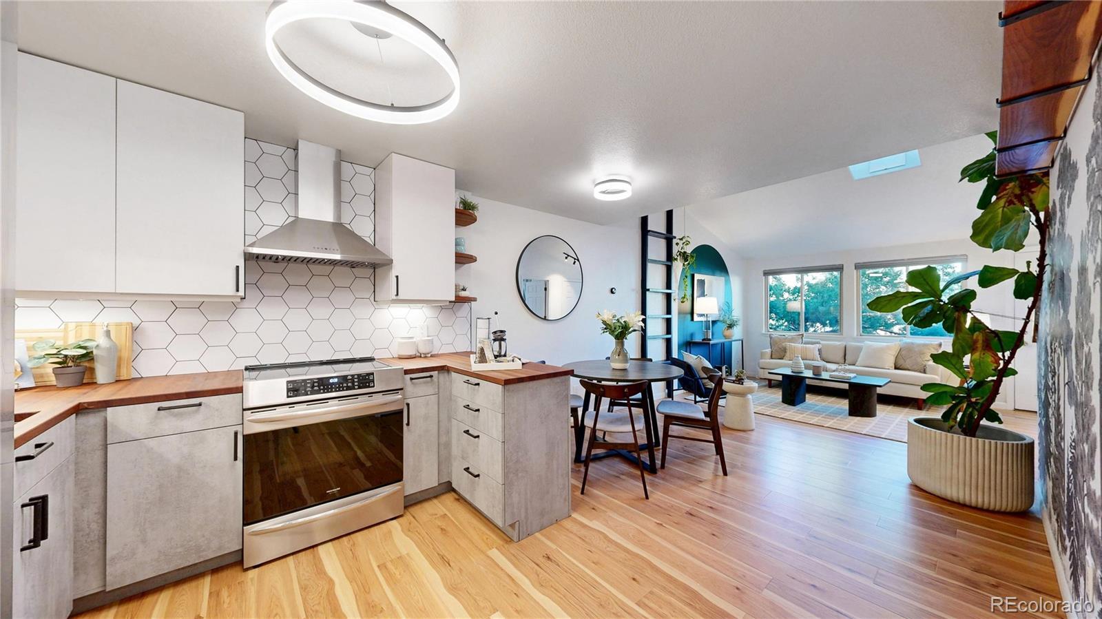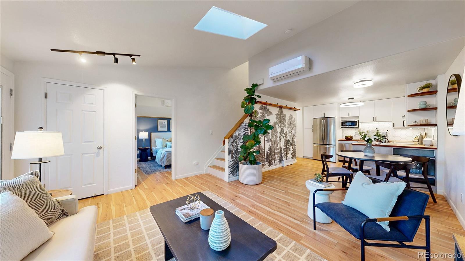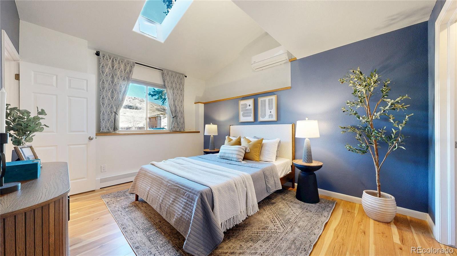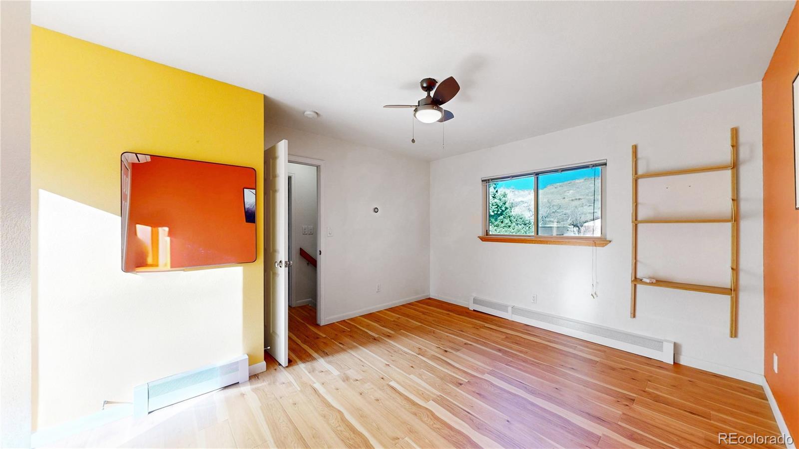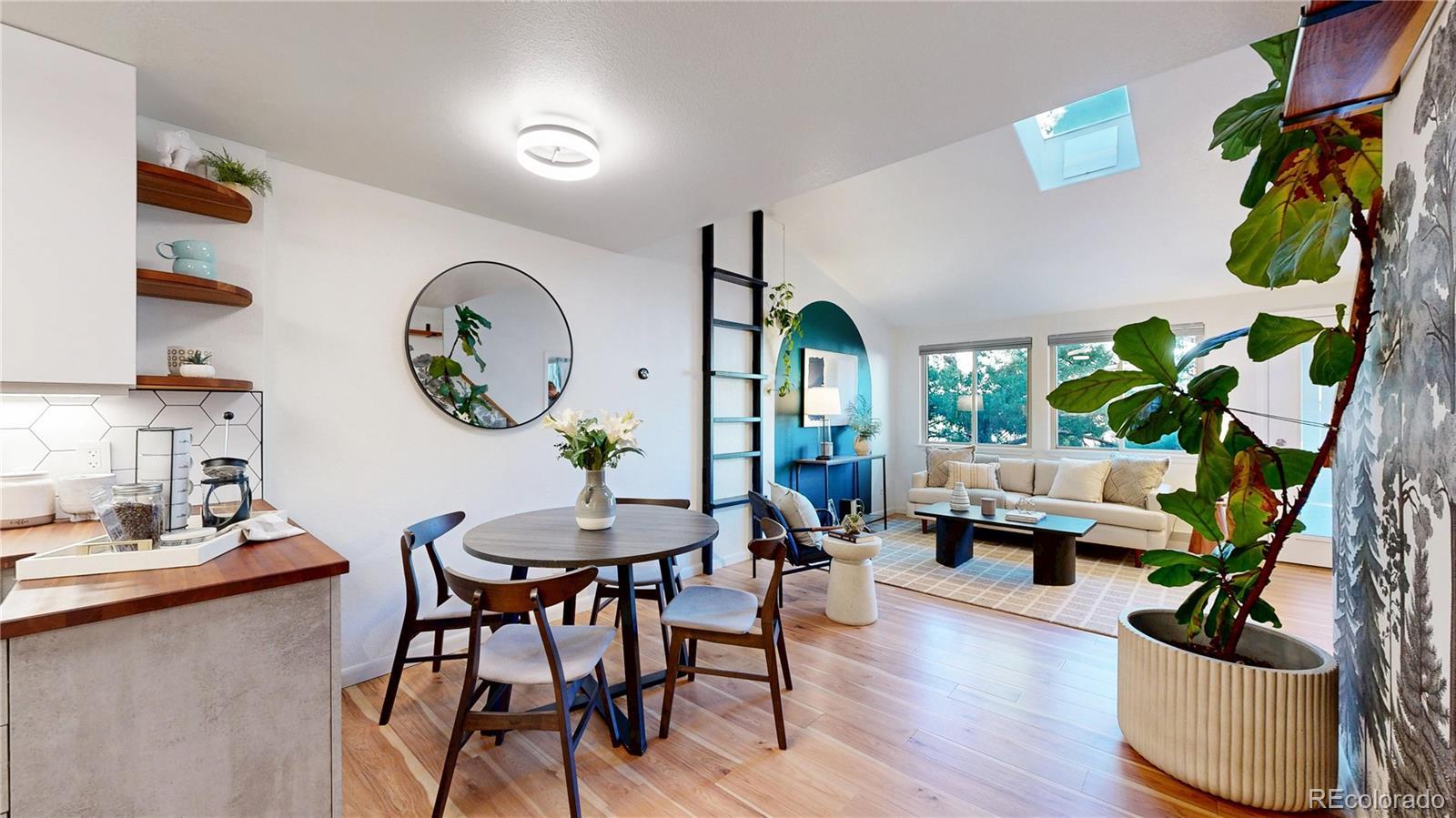 Low maintenance living meets prime location in Golden! Over $100,000 has been thoughtfully invested in this completely turnkey home over the last few years - including fully paid off $25,000 solar panels for ultra low utility bills. Sun filled interiors with vaulted ceilings and new laminate floors welcome you into a spacious open floor plan anchored by a completely renovated kitchen featuring pristine butcher block countertops, soft close cabinetry, a roll out pantry, and all new stainless steel appliances, including an induction cooktop with vented hood. The main level primary bedroom offers a walk in closet and direct access to a full bath. Upstairs, you’ll find two generously sized bedrooms and a recently remodeled full bathroom with a stylish fluted vanity. Step outside to a newly installed paver patio in the fully fenced backyard complete with raised garden beds, a storage shed, and views of the mountains surrounding downtown Golden, including the famous Golden "M"! Enjoy convenient trailhead access to South Table Mountain just steps away for hiking & mountain biking. Additional upgrades include mini split air conditioning in every room, a Navien tankless water heater, new doors and new double pane windows, fully remodeled upstairs bath, solar panels, front landscaping, skylights, plumbing updates, and a 2017 roof. Enjoy no HOA, two off-street parking spaces, and a Level 1 EV charger. A 14 month Blue Ribbon Home Warranty is included for additional ease of ownership. Conveniently located just minutes from downtown Golden, School of Mines, the restaurants and breweries on S Golden Road - all with easy access to the I70 mountain access corridor and Denver, this truly is as turnkey as it gets for easy and comfortable Golden living!