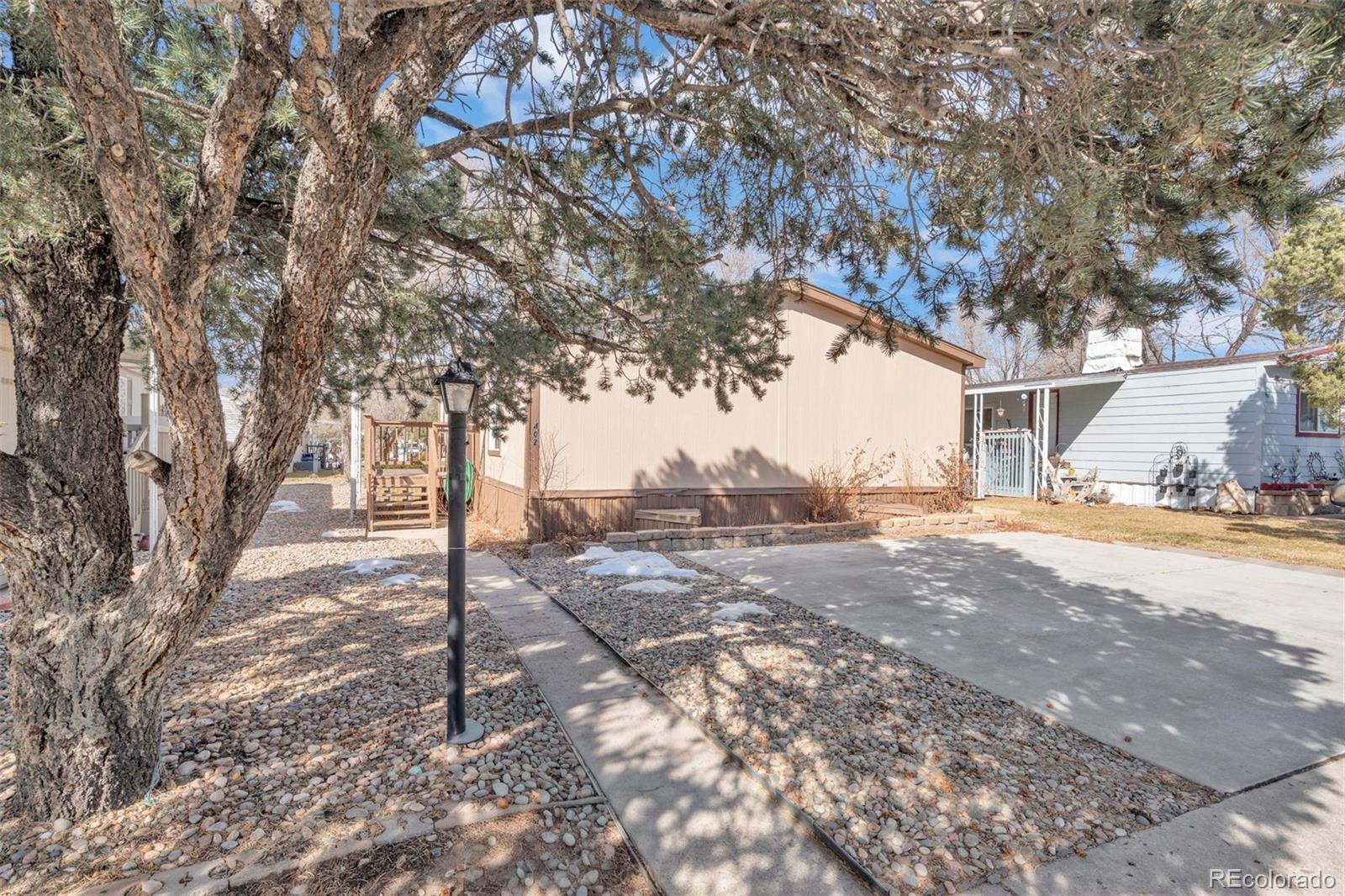 FULLY REMODELED! Lot 402-G is a fully refreshed double-wide offering extensive upgrades throughout and truly move-in ready condition. This home has been thoughtfully updated with new drywall, new windows, luxury vinyl plank flooring in the main living areas, new carpet in the bedrooms, and fully renovated bathrooms. The exterior impresses immediately with crisp wood siding, vinyl skirting, and well-maintained landscaping that enhances curb appeal and functionality. Enter through the covered front porch into the bright family room featuring updated drywall, LVP flooring, and a ceiling fan for added comfort. The spacious primary bedroom is located just off the living area and includes new carpet, a ceiling fan, and abundant natural light from the new windows. A stylish barn door leads to the en-suite bathroom, showcasing an updated vanity with vessel sink, granite countertops, LED mirror, tiled walk-in shower, linen storage, AND a walk-in closet with custom organization. The dining area features a perfectly placed chandelier and flows into the kitchen, which offers ample cabinetry, a striking mosaic backsplash, and included appliances. Both secondary bedrooms are generously sized with new carpet and fresh white paint, creating a bright and airy feel. The shared secondary bathroom includes an updated single-sink vanity and a tiled shower-tub combination. Ideally located near shopping and dining, this beautifully upgraded home is a must-see. CALL TO SCHEDULE A SHOWING TODAY!