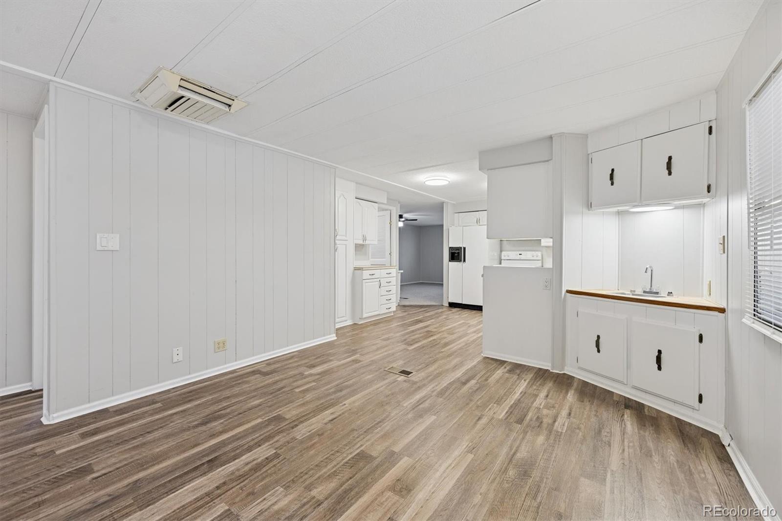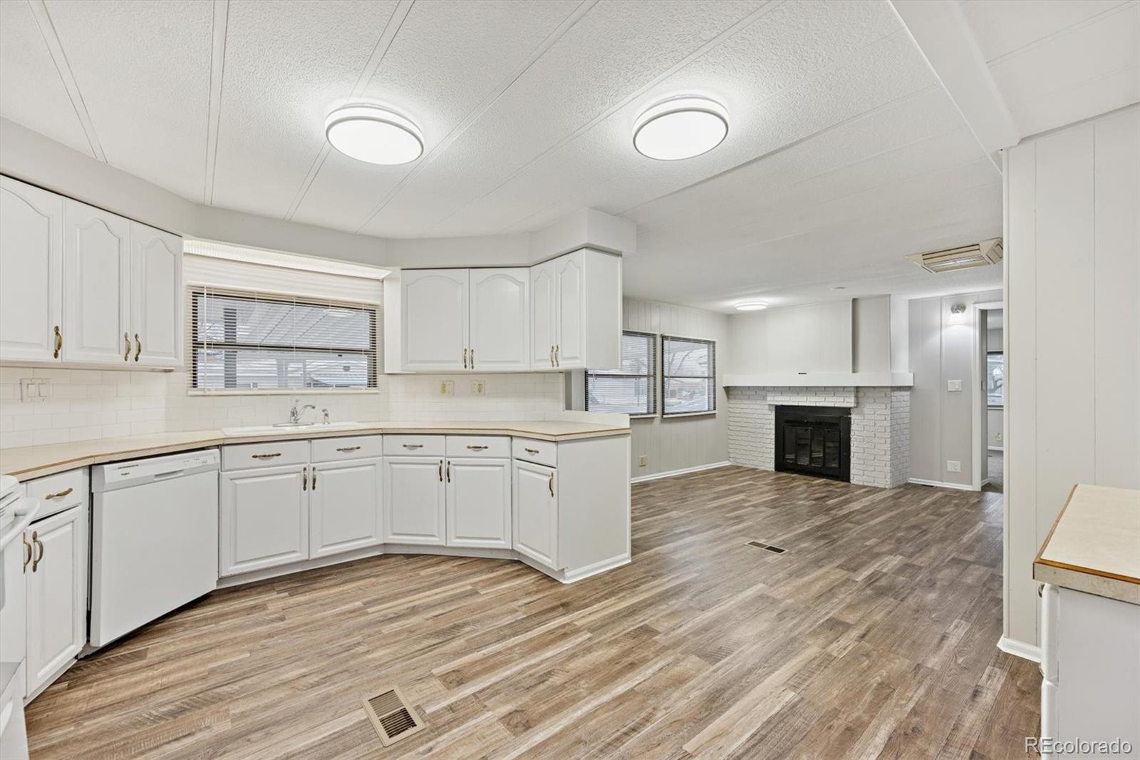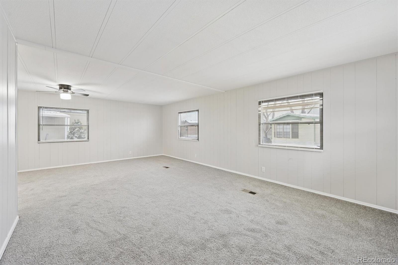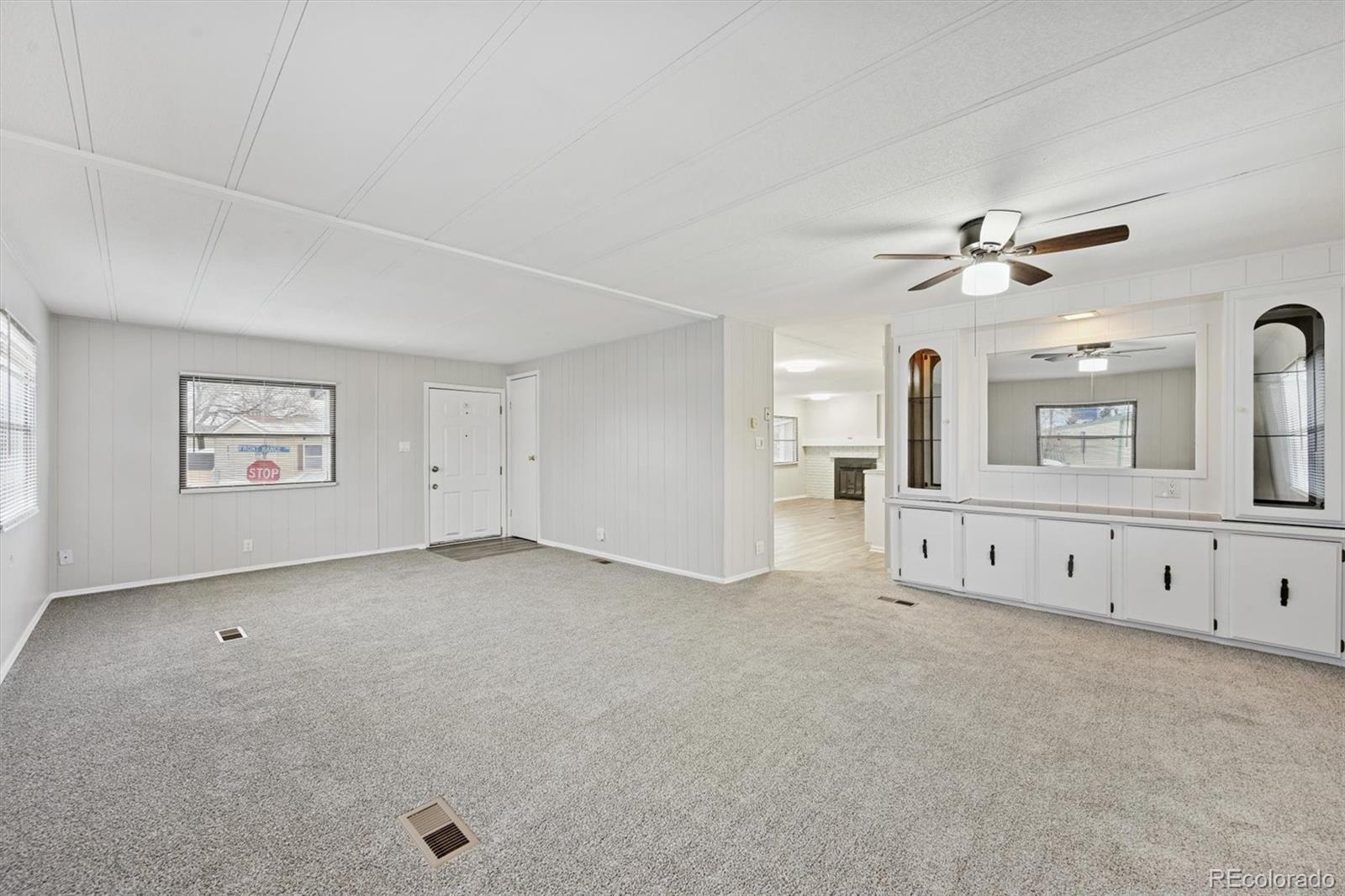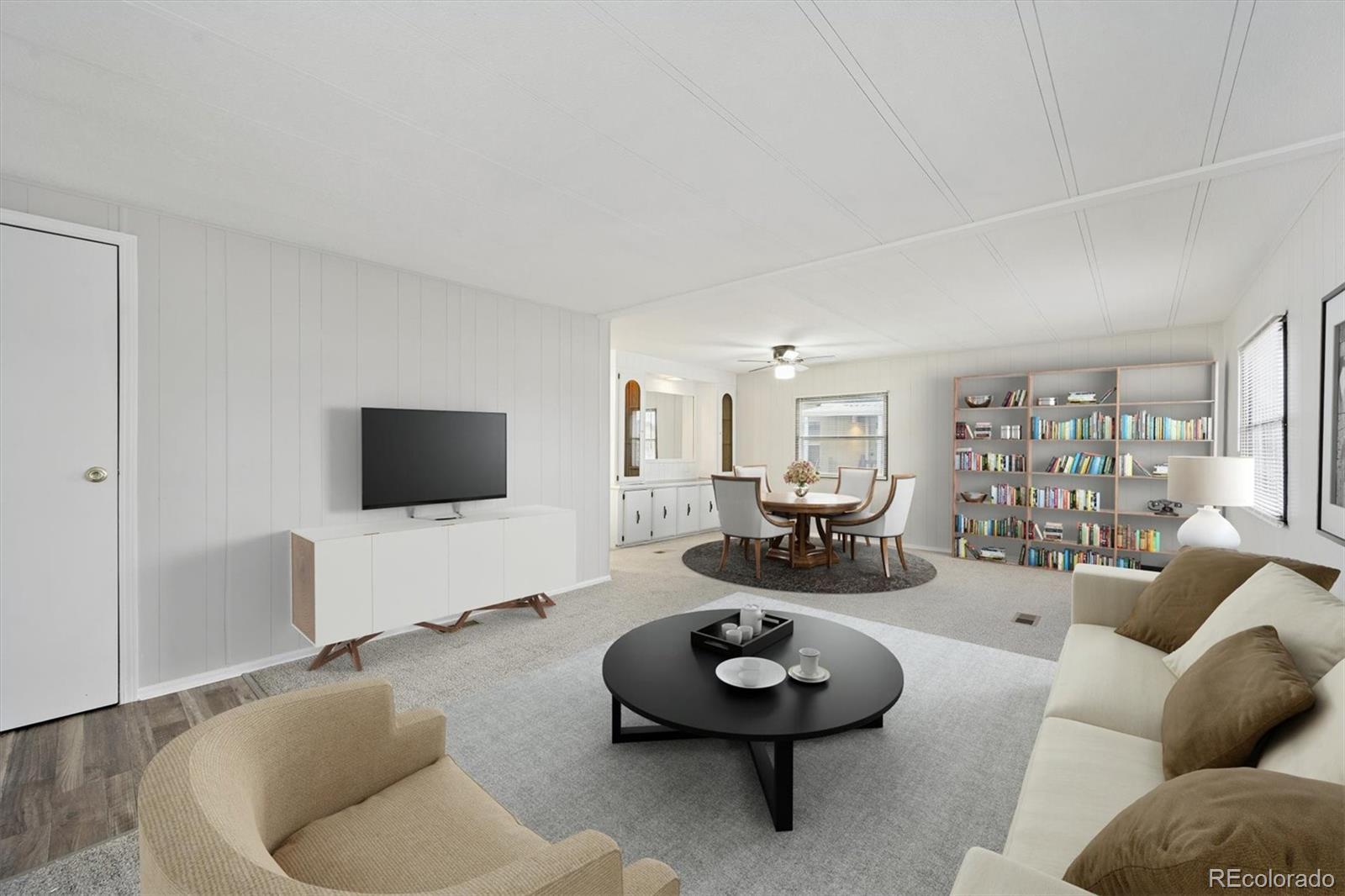 Located on lot 501 in Front Range, this double-wide home has been freshly updated inside and out with new paint throughout. New flooring and carpet have been installed, and all appliances are included for an easy move-in. The home sits on a spacious CORNER lot and includes a large storage shed (which will be painted to match the home) to meet all your storage needs. Inside, you’ll appreciate the generous layout offering over 1,400 square feet of living space. Upon entry, the LARGE family room greets you with fresh paint and updated plush carpet. The room is expansive and versatile, allowing for a variety of furniture arrangements. The dining room features a wet bar and a cozy wood-burning fireplace, creating a functional and inviting space for everyday dining or entertaining. The kitchen offers ample bright cabinetry along with included appliances, making it both practical and welcoming. The primary retreat has been refreshed with plush new carpet and fresh paint, and features double closets and an updated en-suite bathroom. The bathroom includes a large single-sink vanity, walk-in shower, and a soaking tub. Secondary bedrooms have also been updated with new carpet and paint and include window coverings and light fixtures. A dedicated laundry room offers overhead cabinetry for storage, and the washer and dryer are included. Lots of UPDATES and Ready to SHOW! **HOME IS VIRTUALLY STAGED**