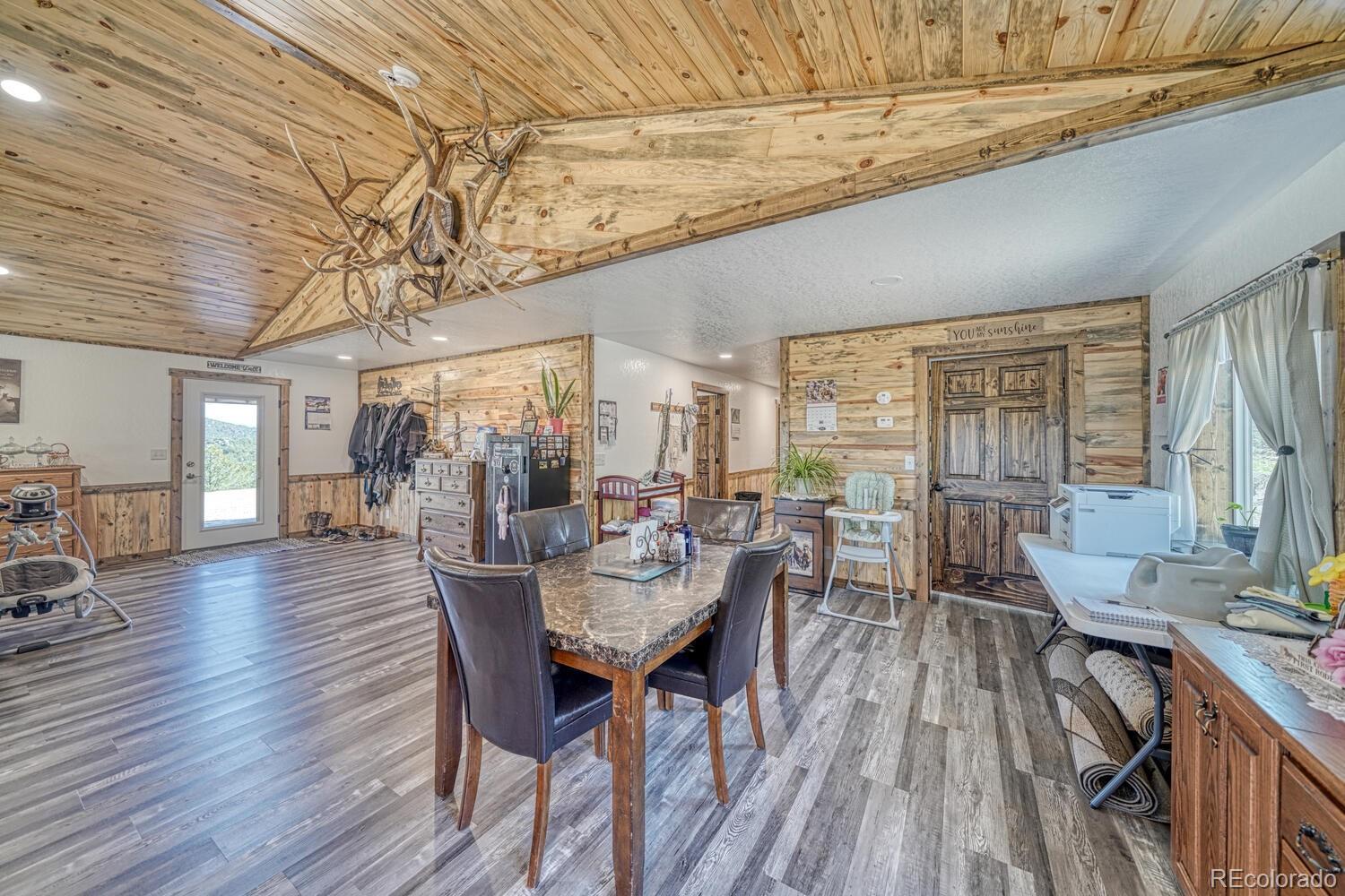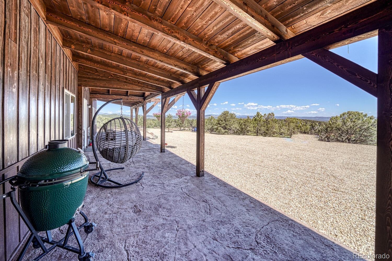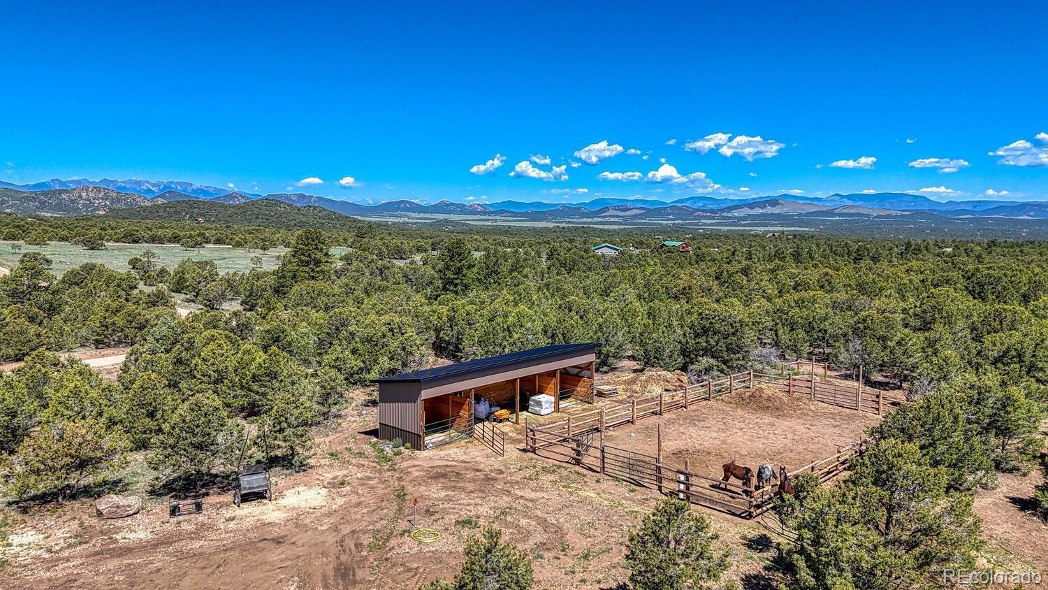 Settled into the quiet sweep of Bull Domingo Ranch, this 35-acre Colorado haven feels like it’s been waiting for someone who understands the rhythm of the mountains. From the moment you arrive, the Sangre de Cristos rise in the distance like a painted backdrop, and the home itself feels rooted—steady timbers, mountain textures, and a porch made for watching daylight drift across the peaks. Inside, the great room unfolds beneath pine tongue-and-groove vaulted ceilings that glow with warm, golden light. It’s the kind of space where conversations linger, meals stretch long, and windows frame the land as if it were a living mural. The kitchen carries that same handcrafted feel—rich wood cabinetry, expansive counters, and an oversized pantry ready for everything from big-batch cooking to stocking up for ranch life. Two comfortable bedrooms sit quietly to one side of the home, each offering a retreat of its own. The primary includes a walk-in closet, while the full bath blends practicality with rustic charm. An on-demand hot water system keeps everything efficient and easy, whether you're hosting a full house or simply ending the day with a long shower. Step outside, and the land opens around you. A stamped concrete covered patio invites relaxation, while pines rolling out in every direction, offer privacy, quiet, and the kind of deep stillness you only find in the high country. For horse lovers, the property is already thoughtfully set up with corrals and a sturdy shelter—well-planned, well-placed, and ready for your herd. And the massive 4-car tandem garage is more than parking; it’s workspace, equipment storage, hobby room, and possibility all under one roof. Everywhere you turn, this property tells the story of Colorado living—honest, wide-open, timeless. Schedule a showing today and step into the next chapter of a life lived close to the land, surrounded by beauty, and grounded in the comfort of a home built with intention.