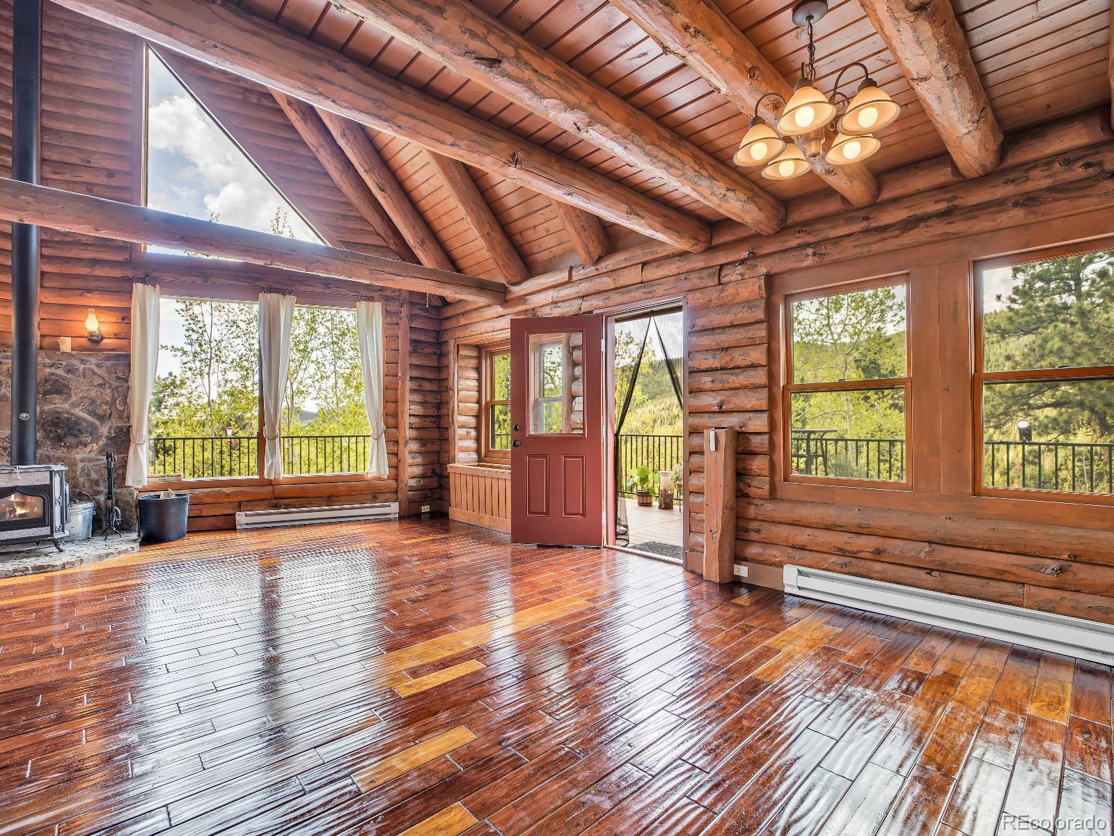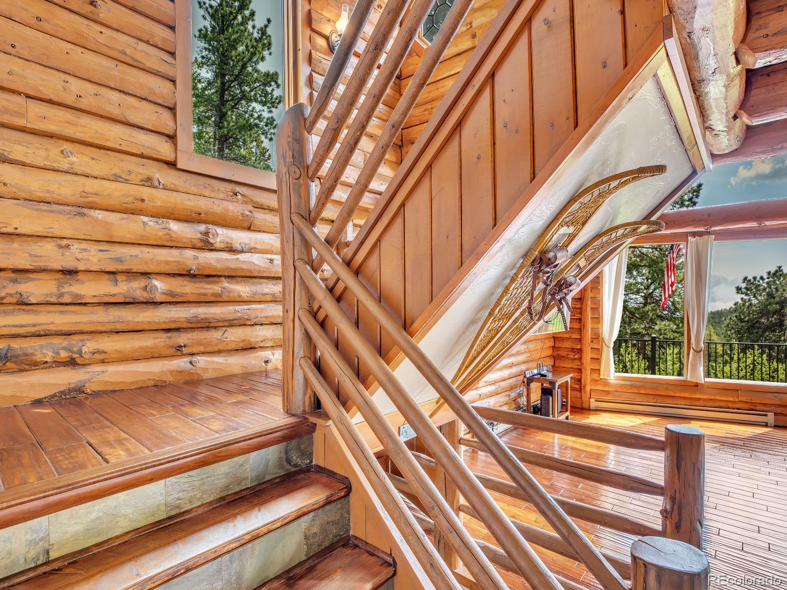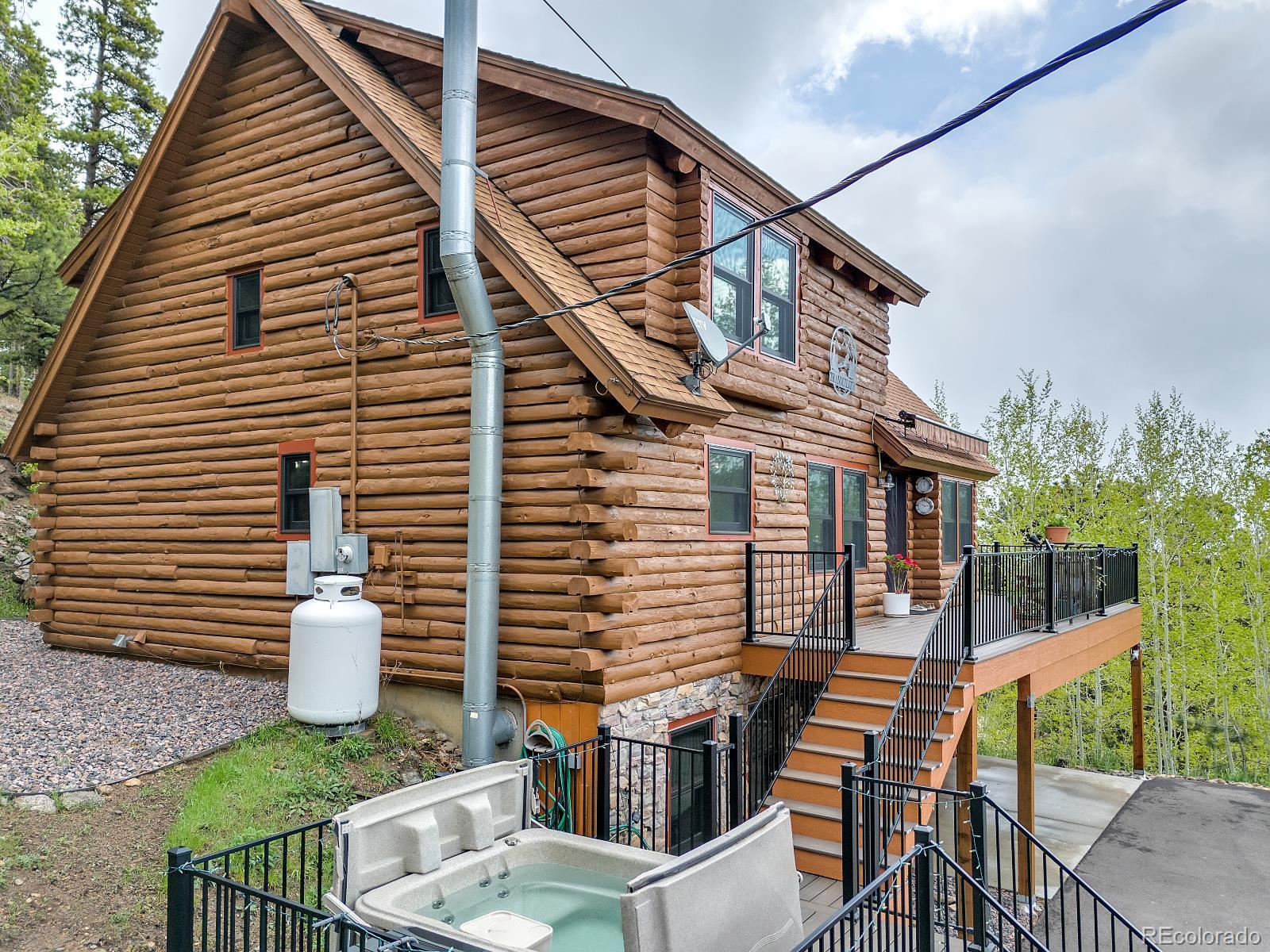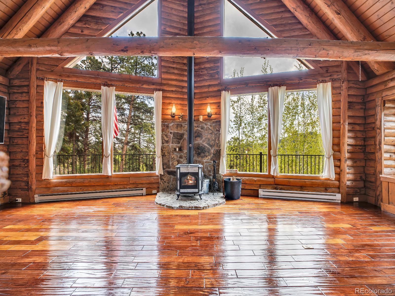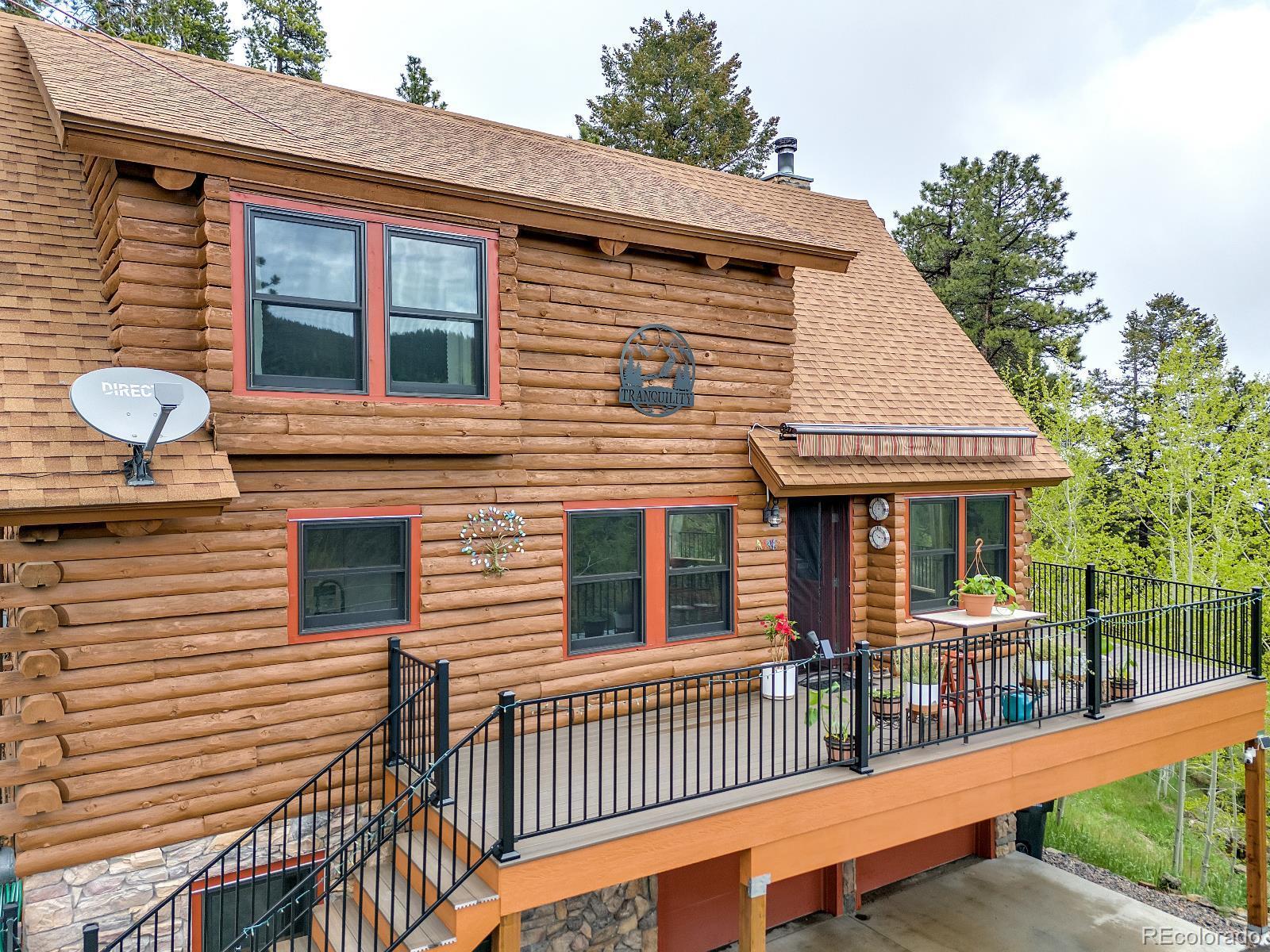 Peace and tranquility await you in this beautiful,cozy log home, nestled on 1.04 acres located in the mountains above Evergreen, CO. Beautiful hand scraped golden teak hardwood floors are throughout the home. The kitchen features new slab granite counters, breakfast bar, new sink, hickory cabinets and newer appliances, including an antique reproduction stove with a gas cooktop and electric oven. Enjoy panoramic views to the east from the open concept kitchen and great room. A new wood burning stove and chimney were added to the great room for cozy fires on cooler evenings. The main-floor ensuite bath includes a new shower, vanity and sink. The large 3rd floor main bedroom and ensuite bath includes a clawfoot bathtub, and a modern replica of a high tank toilet. Laundry room on the lower level has new: water pressure/filtration system, linoleum floor and vent system for clothes dryer. Updates on the lower-level include: the bathroom and the garden level bedroom with a second wood burning stove. The large, over-sized attached 2 car garage with work bench and ample storage space has been freshly painted. A contractor performed fire mitigation on the Property in 2023 and 2024 cutting down trees near the home, and removed any dead trees. Major renovations and improvements have been completed in the last 2 years by Seller and Seller’s contractor, including new: paved asphalt driveway; fence; woodshed; interior and exterior logs stained. Well pump was replaced in 2021. New Trex deck wraps around the home on 3 sides providing ample area for entertaining. A contractor installed new: remote-controlled deck awning; hot tub and deck; garage doors; and a fire-retardant metal-clad door between the house and garage. Most windows and exterior doors were replaced with new energy efficient doors and windows. SELLER OWNS HOME WITHOUT DEBT, BUT MOTIVATED! OTHER INCLUSIONS: Snow Blower, kitchen microwave, lower level refrigerator and stacked washer/dryer located in laundry room.