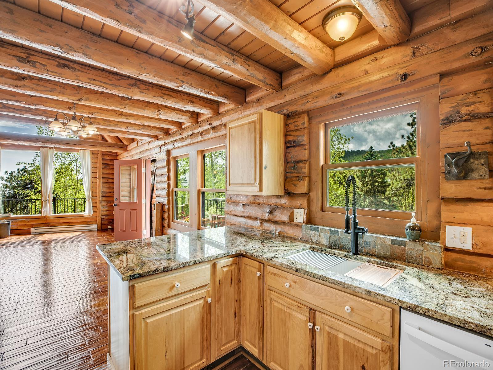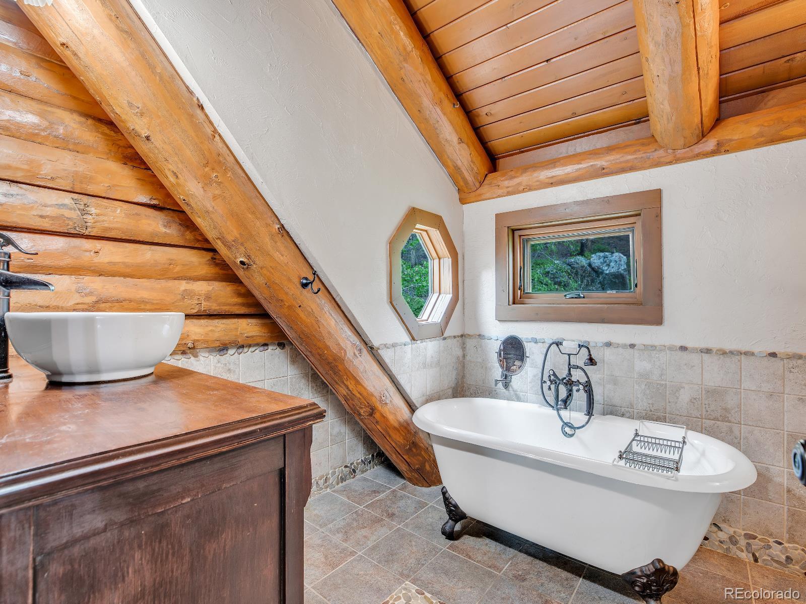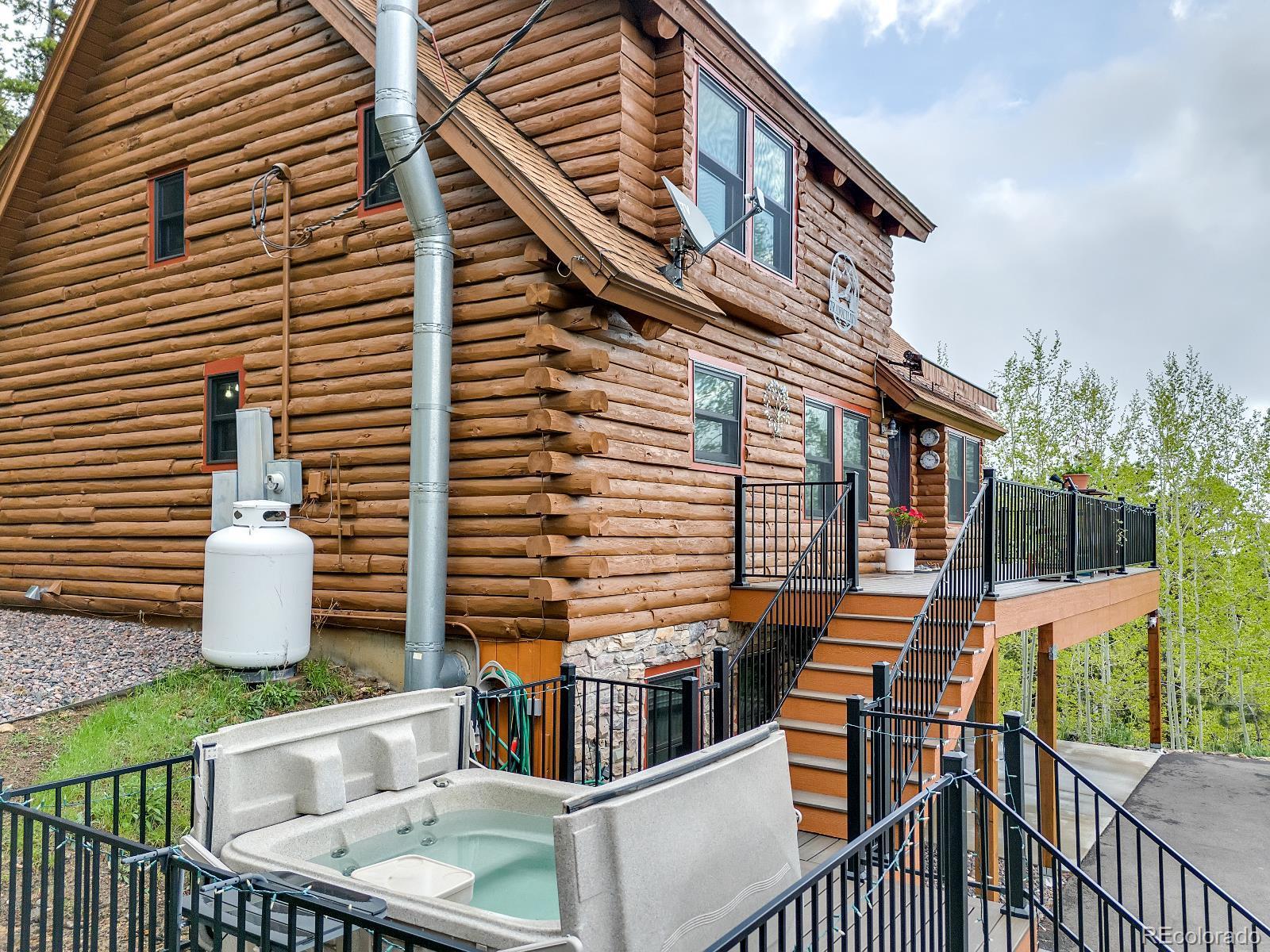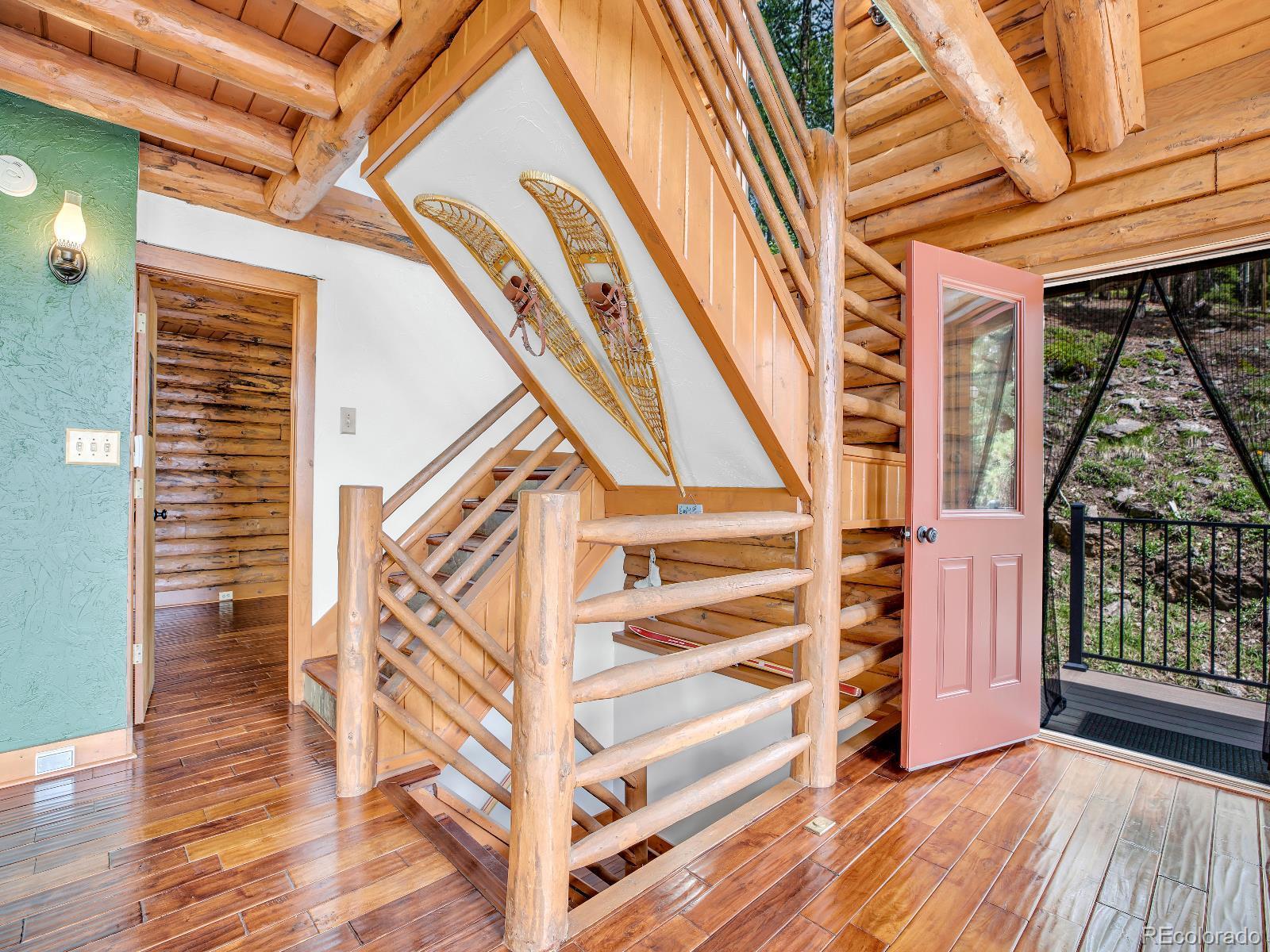 Peace and tranquility await you in this beautiful,cozy log home, nestled on 1.04 acres located in the mountains above Evergreen, CO. Beautiful hand scraped golden teak hardwood floors are throughout the home. The kitchen features new slab granite counters, breakfast bar, new sink, hickory cabinets and newer appliances, including an antique reproduction stove with a gas cooktop and electric oven. Enjoy panoramic views to the east from the open concept kitchen and great room. A new wood burning stove and chimney were added to the great room for cozy fires on cooler evenings. The main-floor ensuite bath includes a new shower, vanity and sink. The large 3rd floor main bedroom and ensuite bath includes a clawfoot bathtub, and a modern replica of a high tank toilet. Laundry room on the lower level has new: water pressure/filtration system, linoleum floor and vent system for clothes dryer. Updates on the lower-level include: the bathroom and the garden level bedroom with a second wood burning stove. The large, over-sized attached 2 car garage with work bench and ample storage space has been freshly painted. A contractor performed fire mitigation on the Property in 2023 and 2024 cutting down trees near the home, and removed any dead trees. Major renovations and improvements have been completed in the last 2 years by Seller and Seller’s contractor, including new: paved asphalt driveway; fence; woodshed; interior and exterior logs stained. Well pump was replaced in 2021. New Trex deck wraps around the home on 3 sides providing ample area for entertaining. A contractor installed new: remote-controlled deck awning; hot tub and deck; garage doors; and a fire-retardant metal-clad door between the house and garage. Most windows and exterior doors were replaced with new energy efficient doors and windows. SELLER OWNS HOME WITHOUT DEBT, BUT MOTIVATED! OTHER INCLUSIONS: Snow Blower, kitchen microwave, lower level refrigerator and stacked washer/dryer located in laundry room.
