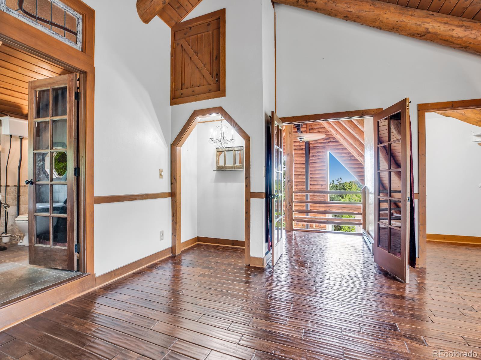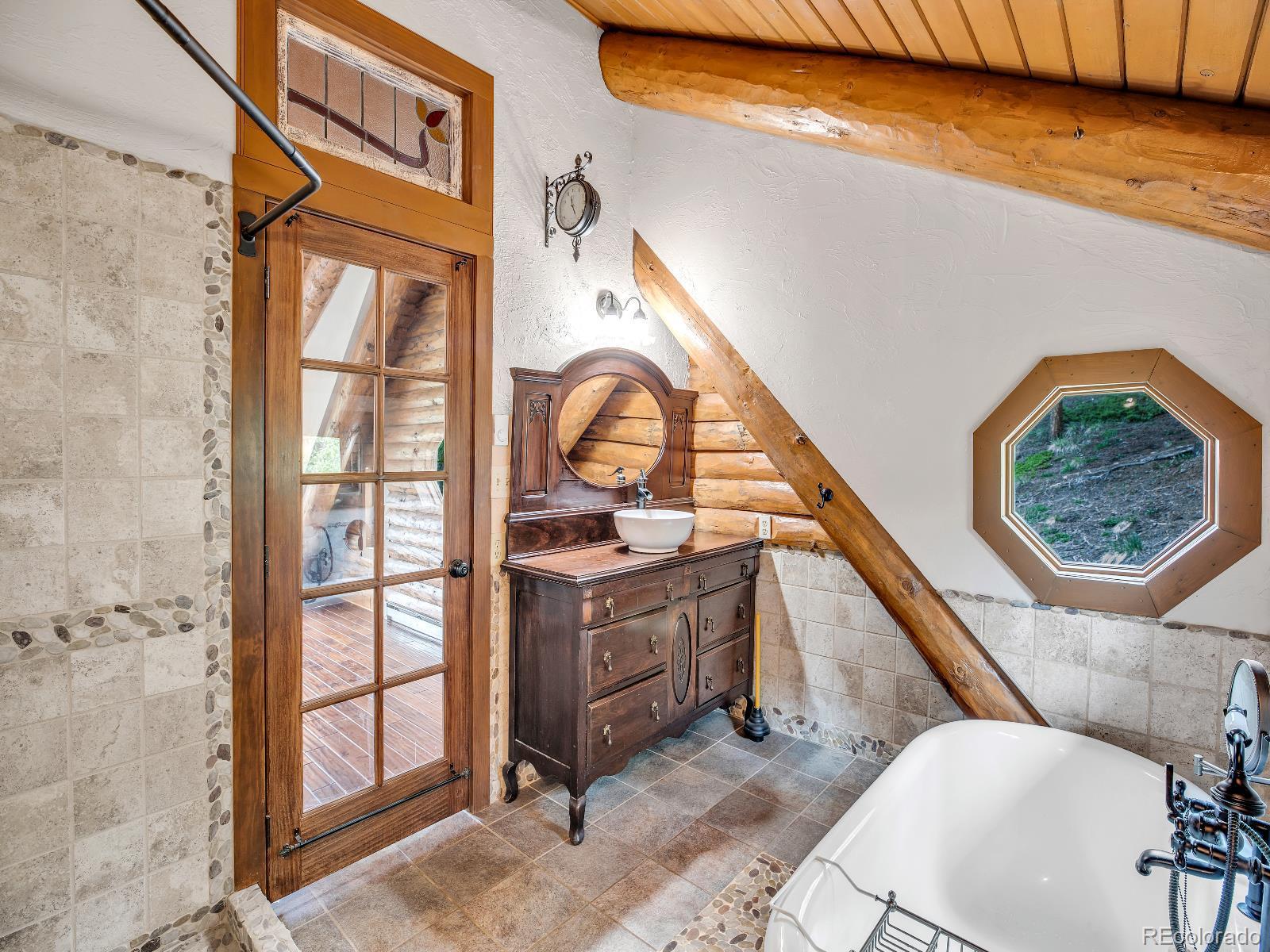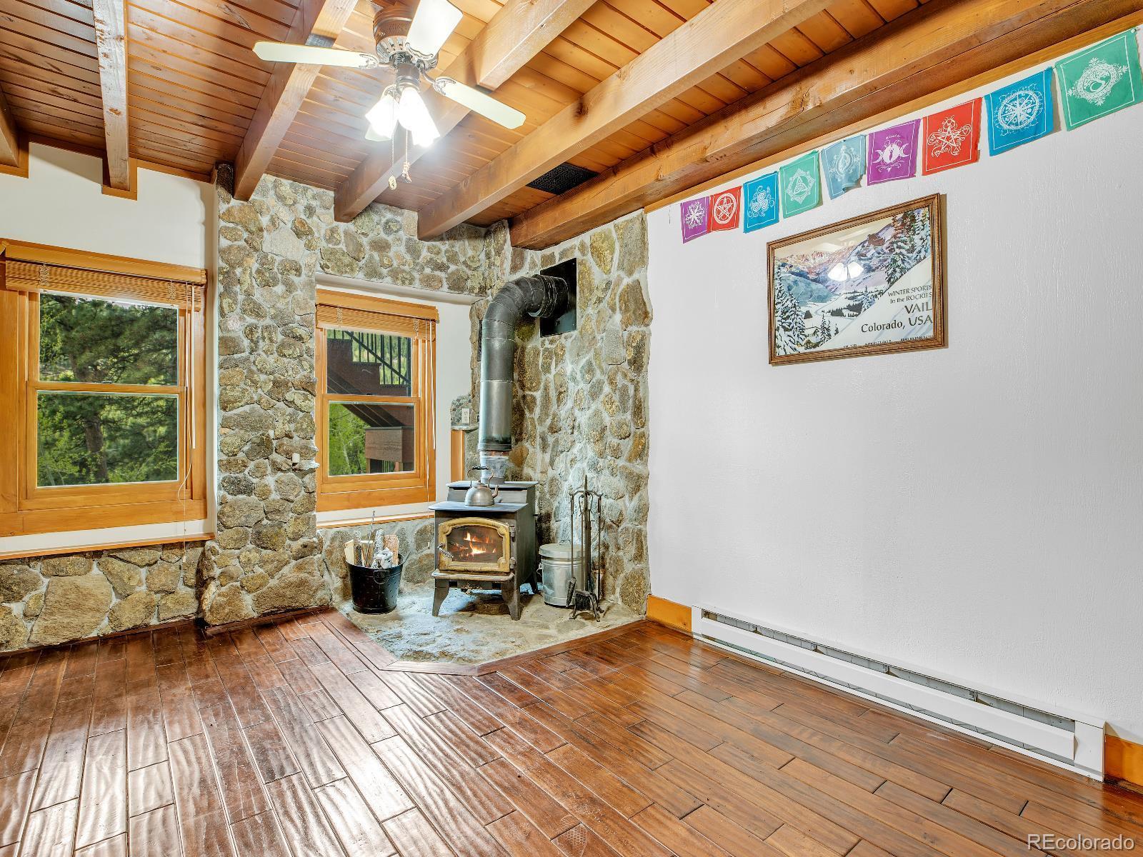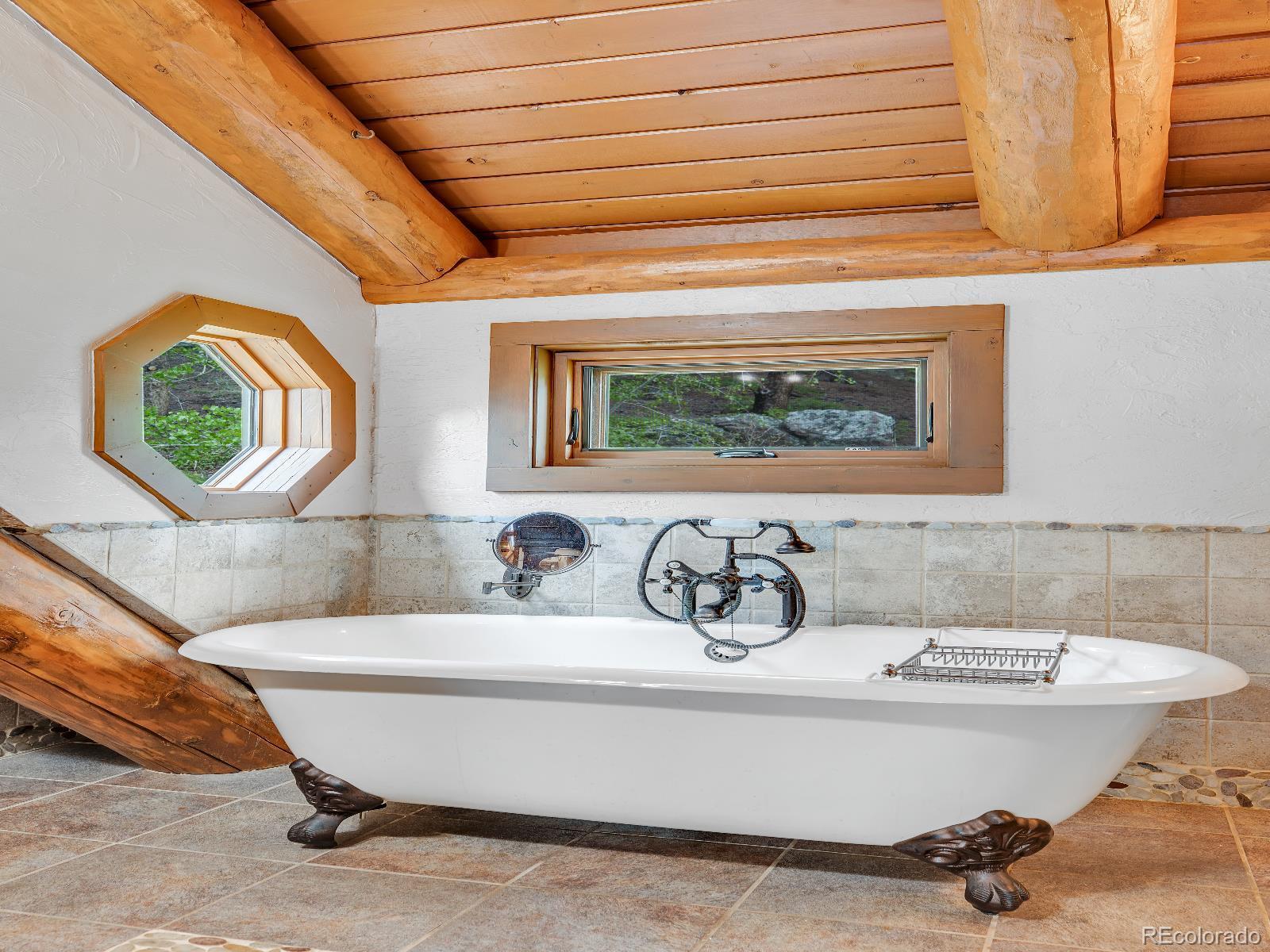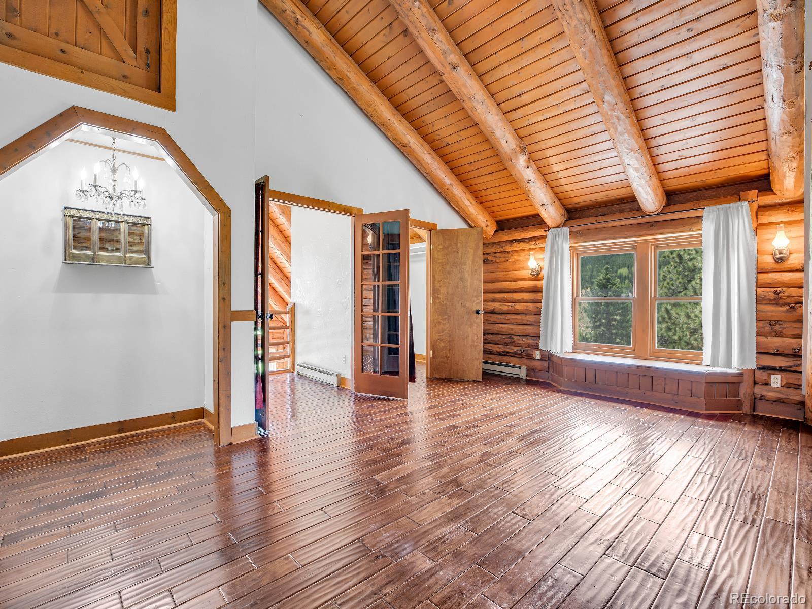 Peace and tranquility await you in this beautiful,cozy log home, nestled on 1.04 acres located in the mountains above Evergreen, CO. Beautiful hand scraped golden teak hardwood floors are throughout the home. The kitchen features new slab granite counters, breakfast bar, new sink, hickory cabinets and newer appliances, including an antique reproduction stove with a gas cooktop and electric oven. Enjoy panoramic views to the east from the open concept kitchen and great room. A new wood burning stove and chimney were added to the great room for cozy fires on cooler evenings. The main-floor ensuite bath includes a new shower, vanity and sink. The large 3rd floor main bedroom and ensuite bath includes a clawfoot bathtub, and a modern replica of a high tank toilet. Laundry room on the lower level has new: water pressure/filtration system, linoleum floor and vent system for clothes dryer. Updates on the lower-level include: the bathroom and the garden level bedroom with a second wood burning stove. The large, over-sized attached 2 car garage with work bench and ample storage space has been freshly painted. A contractor performed fire mitigation on the Property in 2023 and 2024 cutting down trees near the home, and removed any dead trees. Major renovations and improvements have been completed in the last 2 years by Seller and Seller’s contractor, including new: paved asphalt driveway; fence; woodshed; interior and exterior logs stained. Well pump was replaced in 2021. New Trex deck wraps around the home on 3 sides providing ample area for entertaining. A contractor installed new: remote-controlled deck awning; hot tub and deck; garage doors; and a fire-retardant metal-clad door between the house and garage. Most windows and exterior doors were replaced with new energy efficient doors and windows. SELLER OWNS HOME WITHOUT DEBT, BUT MOTIVATED! OTHER INCLUSIONS: Snow Blower, kitchen microwave, lower level refrigerator and stacked washer/dryer located in laundry room.