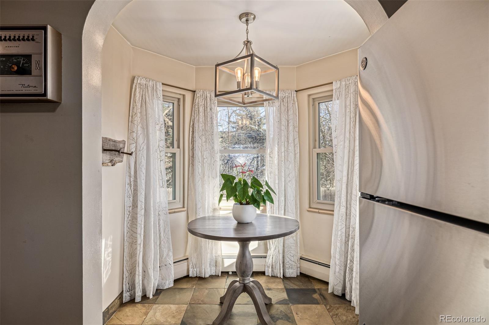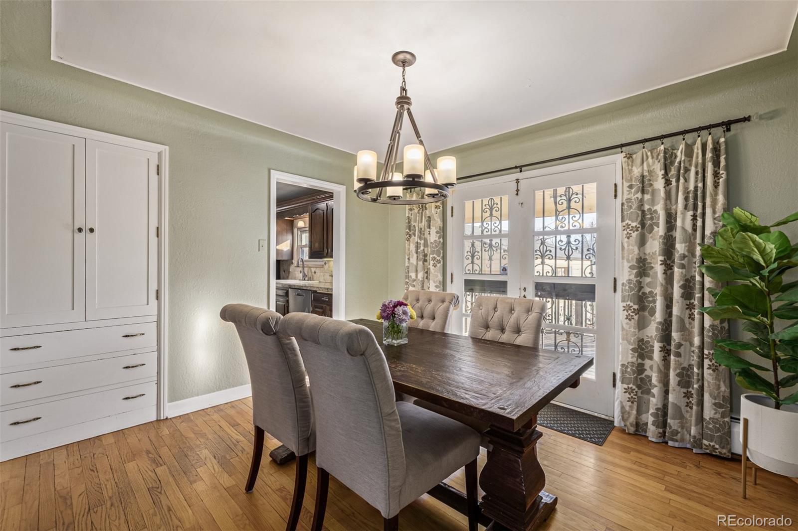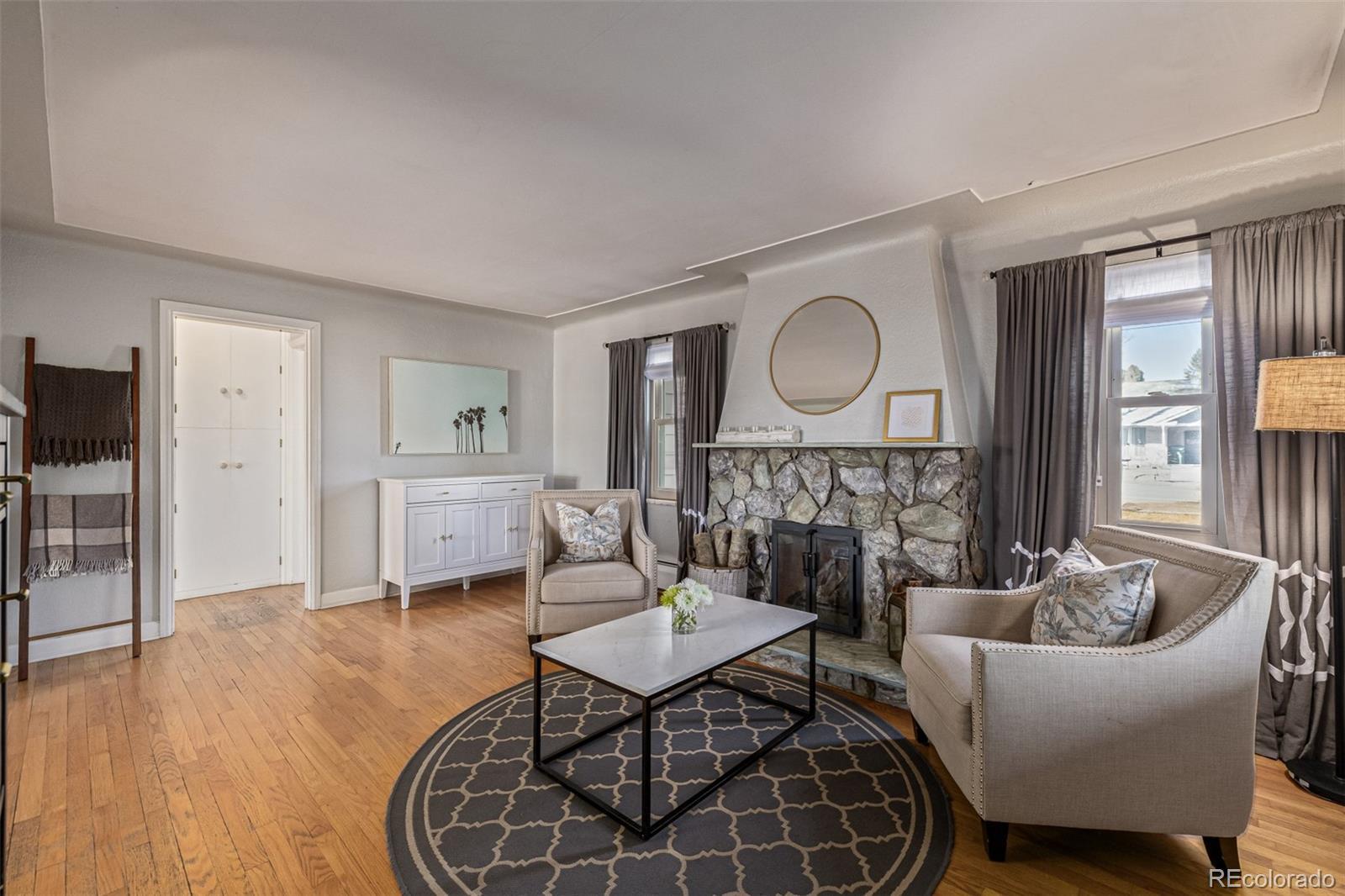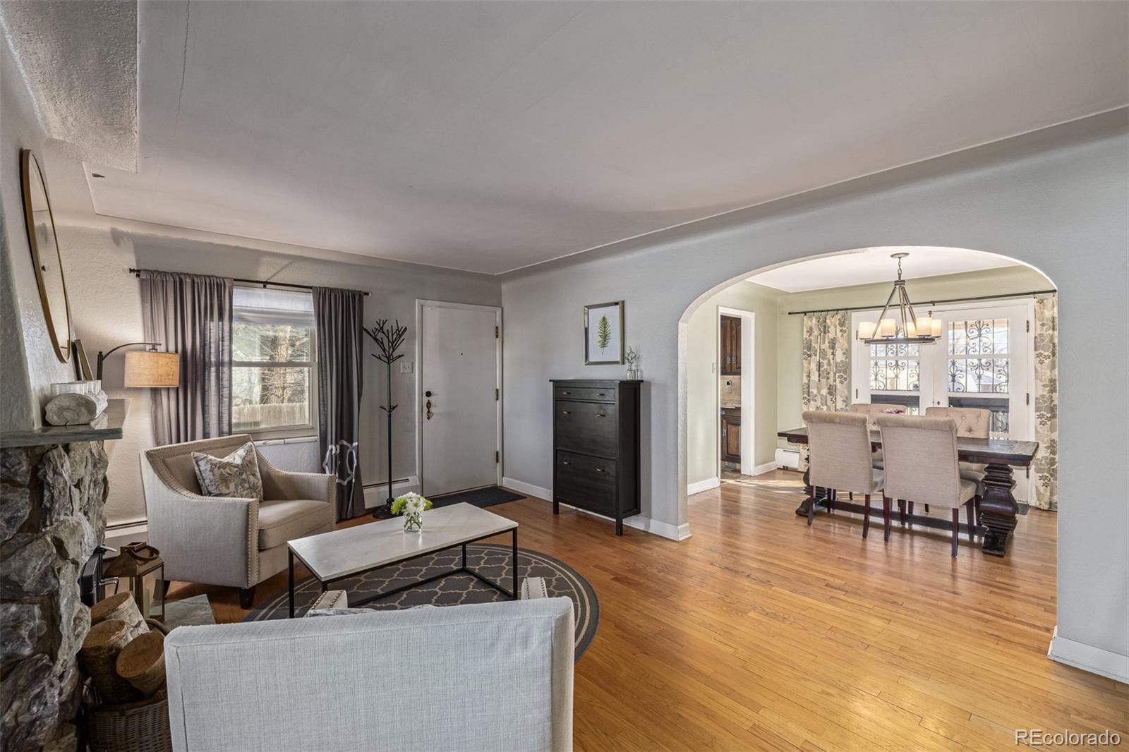 Built in the 1930s and rich with enduring character, this classic farmhouse rests on a rare .365 acre lot in the heart of the city, offering space, privacy, and possibility seldom found in a central single family home. A long driveway and generous setback create a quiet sense of arrival, while the broad lawn and simple architectural lines lend timeless curb appeal. Inside, the living room welcomes with warmth and intention. A grey stone fireplace anchors the space, framed by soft curves and an arched opening that nod to the home’s original craftsmanship. Beautiful hardwood floors carry throughout, creating a natural, harmonious flow from room to room. The dining room is both elegant and inviting, complete with French doors to the backyard, an iconic chandelier, and a built in for effortless entertaining. The kitchen blends heritage with thoughtful updates, featuring deep toned cabinetry, new stainless appliances, and a charming breakfast nook wrapped in windows. Bedrooms feel bright and serene. The main bath honors its era with intricate tile inlays and classic lines, creating a fresh yet timeless retreat. The recently remodeled lower level adds a garden level bedroom, stylish modern bath, flexible office or guest space, a spacious second living area with brick fireplace, and abundant storage including built ins, pantry, and a cedar closet. Outdoors, mature trees, garden beds, and a covered porch create privacy and room to gather. An oversized two car garage, useful outbuildings, and auxiliary structures extend the functionality well beyond the home’s footprint. Surrounded by parks, trails, Edgewater dining, neighborhood cafés, downtown Denver, Golden, and quick highway access, this soulful farmhouse blends history, land, and everyday livability into one rare offering.