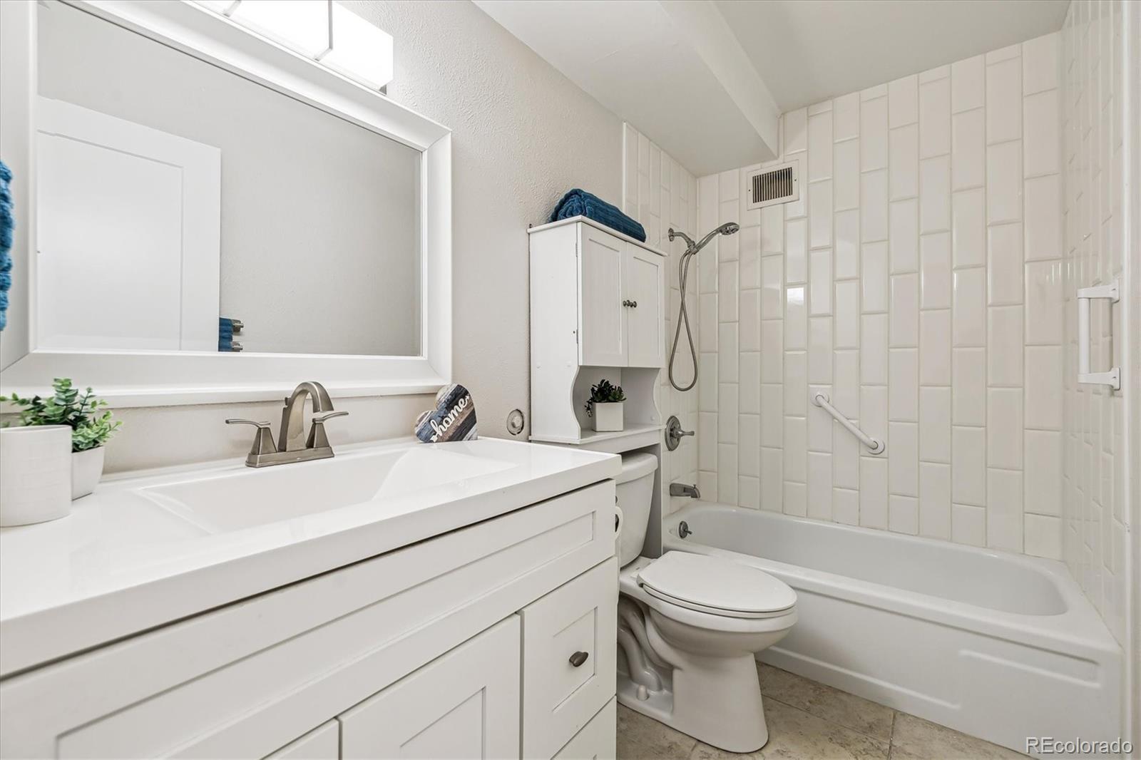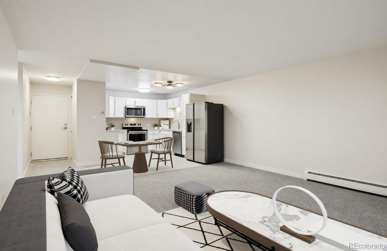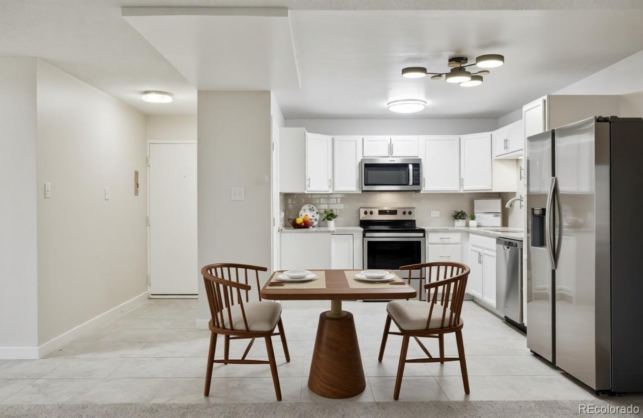 Golf Course Views from 1st Floor Condo! Remodeled and beautiful, this property is 1200 sf, with 2 bedrooms, 2 bathrooms, multi-purpose room, and 1 detached garage included! Kitchen features open floorplan- newer cabinetry freshly painted white, stone slab counters, tile backsplash, stainless appliances, tile floor, and spacious pantry. Bathrooms remodeled with tall white vanities, updated fixtures, lighting, and tile surrounds in both tub and shower. Primary bedroom is oversized with en-suite 3/4 bathroom and oversized walk-in closet. All new carpet and interior nuetral 2 tone paint color scheme. Enjoy the vast golf course scenery from this double pane vinyl enclosed lanai with tile floor. Bonus storage room in building. Additionally there are 2 updated wall ac units- one in living room, the other in primary bedroom. This condo is a must see!**Windsor Gardens is Colorado's Largest Age 55+ Active Adult Living Condo Community. Did you know? Monthly HOA Dues include annual property taxes! And heat, water, sewer, trash, round-the-clock patrolling community responders, full time onsite association management, grounds/building maintenance, and activities department. Enjoy clubhouse amenities such as fitness center, indoor/outdoor pools, hot tub, sauna, billiards, library, craft rooms for ceramics, sewing, woodworking, and 9 hole par 3 golf course and onsite restaurant both open to the public. Stay engaged with a wide array of activities, clubs, and events scheduled every month. Additional features include garden plot program, private walking trail and nature preserve, and RV/Boat storage. The Highline Canal runs full length along south side of the complex. RTD Bus Stops located thru-out the community. FHA/VA approved. Close to restaurants, stores, shopping…Minutes to Lowry, Hwy 225, Cherry Creek…Easy access to DIA and downtown. Come see for yourself what Windsor Gardens has to offer. ©2021**
