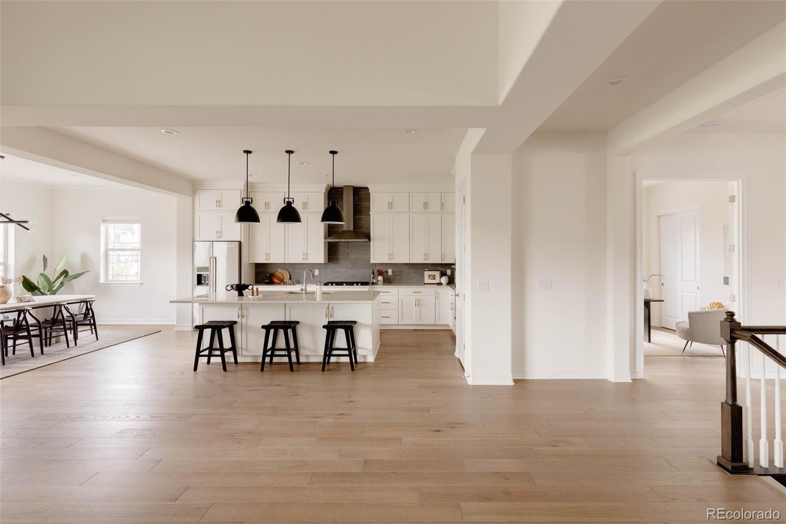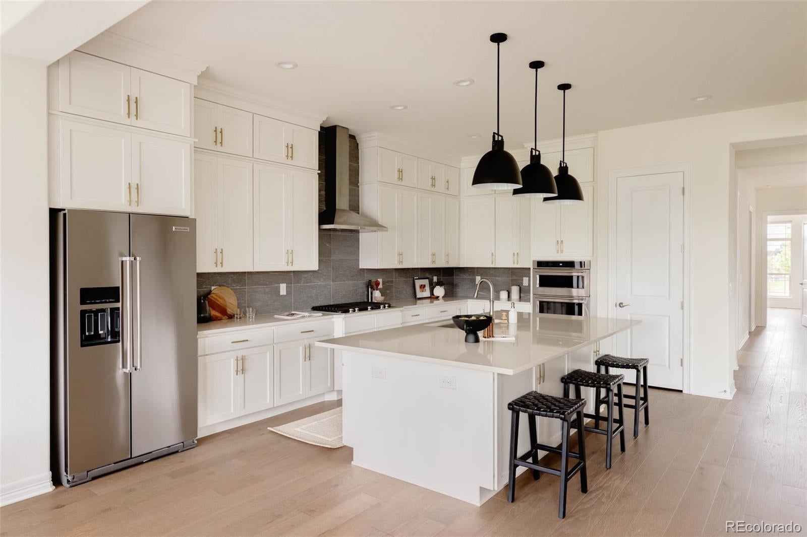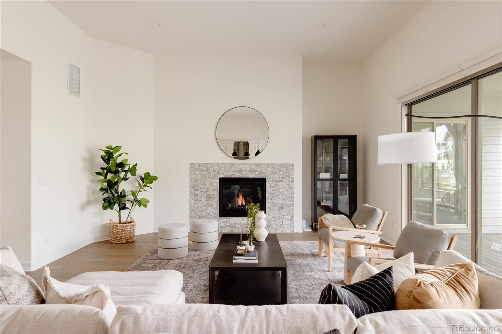 Nestled between 2 resort-style clubhouses & pools, & part of the award-winning Cherry Creek School District, this home offers the best of Colorado living w/scenic trails, vibrant parks, state-of-the-art fitness centers, & the Aurora Reservoir steps away. Inside, the great room impresses with soaring 12ft ceilings & a stunning 15ft stacked slider to access an extended patio, while the dining area has a picturesque view of the reservoir. A gas fireplace with tile surround anchors the space, complemented by engineered wide-plank oak floors & recessed LED lighting throughout. The kitchen shines w/ stacked white cabinetry to the ceiling, quartz countertops, designer lighting, an extended island perfect for entertaining, & upgraded stainless steel appliances including a gas range. A large pantry completes the space. The main level features a secondary bed w/ its own en-suite bath, providing comfort & privacy for guests or family. An additional bedroom with French doors can be used as a study, showcasing water views for an ideal work-from-home retreat. The primary suite is a sanctuary with a luxurious en-suite bath boasting double vanities, upgraded countertops, a large walk-in shower with floor-to-ceiling tile, a soaking tub & a large walk-in closet. The convenient mud/laundry room enhances daily organization. The garden-level unfinished basement is bright with six large windows & ready for your custom vision, including plumbing rough-in. Upgrades include custom blinds, enhanced sound & garage insulation, gas fireplace fan, in-line humidifier, & radon detection system. The 3-car garage is pre-wired for an EV charger; the backyard is wired for a swim spa or hot tub. Outdoors, enjoy a beautifully landscaped yard w/ dual retaining walls & a custom water runoff channel. Relax on an expanded rear deck w/water views. The deck has a gas line, perfect for grilling, while a hot/cold hose bib in the front yard adds convenience. South-facing driveway ensures easy snowmelt in winter.