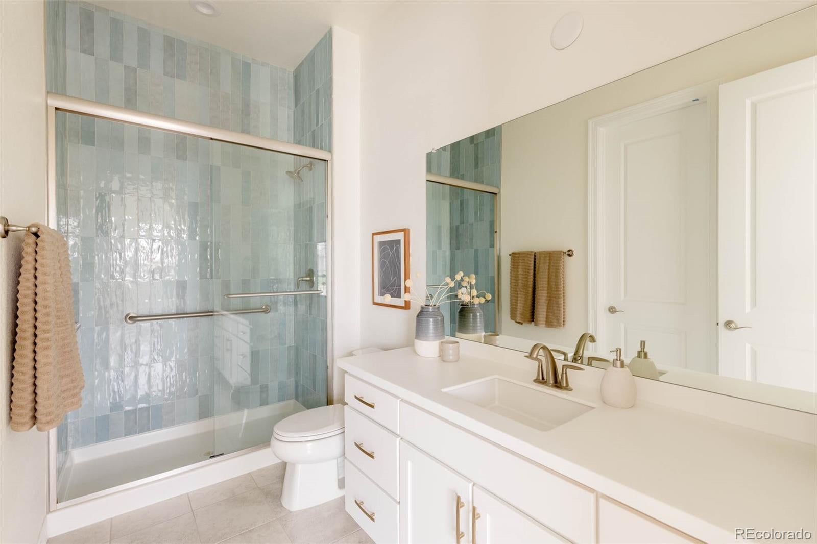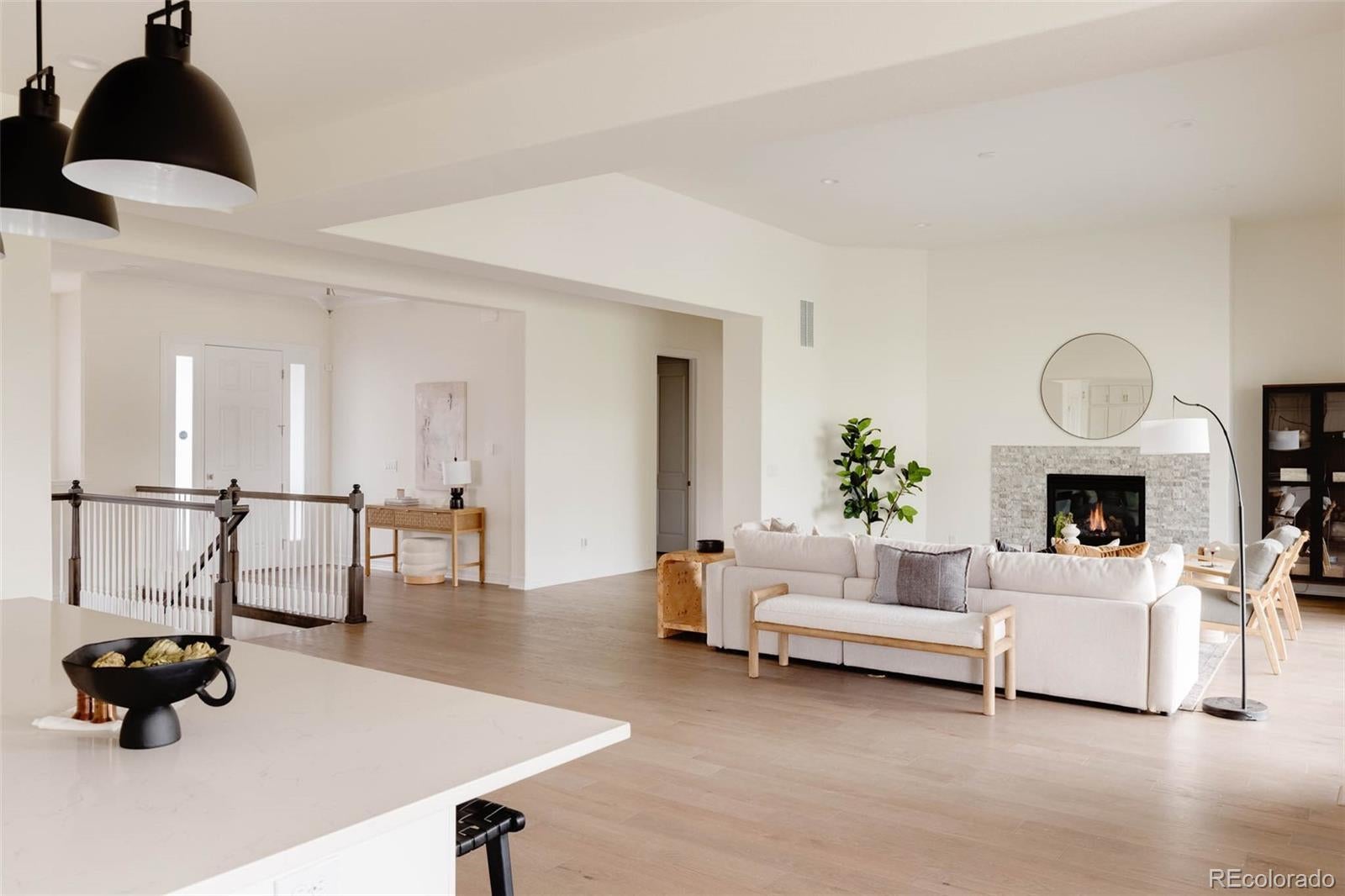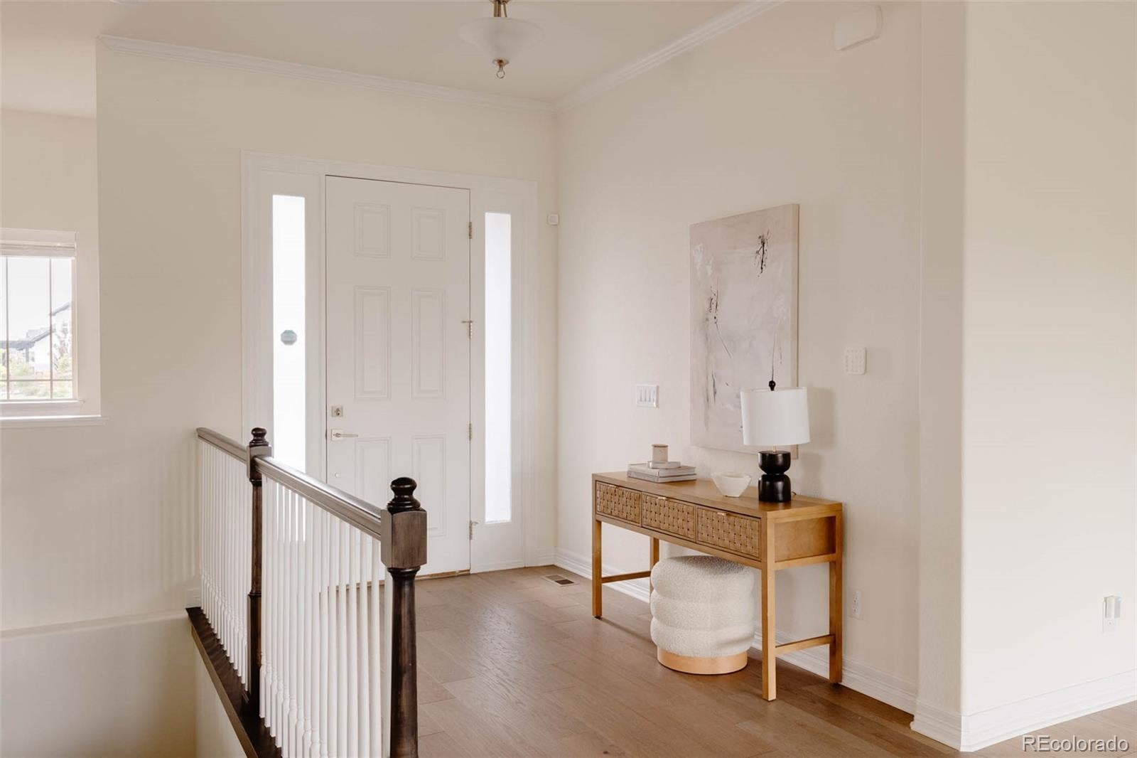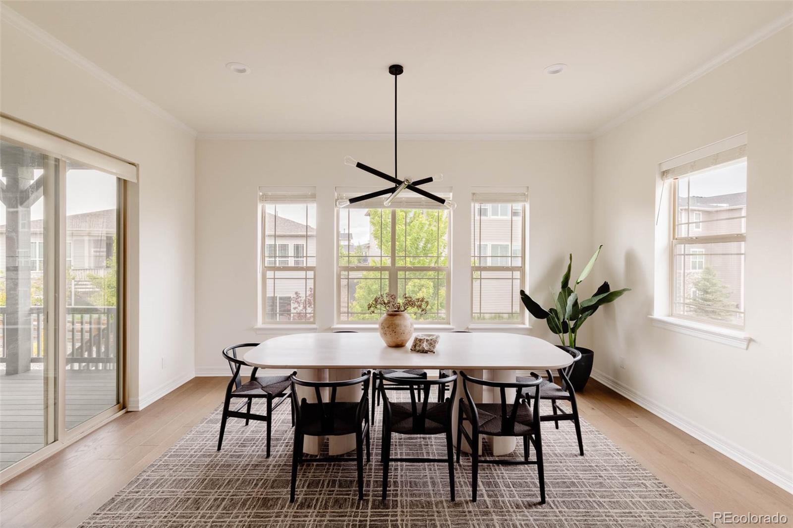 Nestled between 2 resort-style clubhouses & pools, & part of the award-winning Cherry Creek School District, this home offers the best of Colorado living w/scenic trails, vibrant parks, state-of-the-art fitness centers, & the Aurora Reservoir steps away. Inside, the great room impresses with soaring 12ft ceilings & a stunning 15ft stacked slider to access an extended patio, while the dining area has a picturesque view of the reservoir. A gas fireplace with tile surround anchors the space, complemented by engineered wide-plank oak floors & recessed LED lighting throughout. The kitchen shines w/ stacked white cabinetry to the ceiling, quartz countertops, designer lighting, an extended island perfect for entertaining, & upgraded stainless steel appliances including a gas range. A large pantry completes the space. The main level features a secondary bed w/ its own en-suite bath, providing comfort & privacy for guests or family. An additional bedroom with French doors can be used as a study, showcasing water views for an ideal work-from-home retreat. The primary suite is a sanctuary with a luxurious en-suite bath boasting double vanities, upgraded countertops, a large walk-in shower with floor-to-ceiling tile, a soaking tub & a large walk-in closet. The convenient mud/laundry room enhances daily organization. The garden-level unfinished basement is bright with six large windows & ready for your custom vision, including plumbing rough-in. Upgrades include custom blinds, enhanced sound & garage insulation, gas fireplace fan, in-line humidifier, & radon detection system. The 3-car garage is pre-wired for an EV charger; the backyard is wired for a swim spa or hot tub. Outdoors, enjoy a beautifully landscaped yard w/ dual retaining walls & a custom water runoff channel. Relax on an expanded rear deck w/water views. The deck has a gas line, perfect for grilling, while a hot/cold hose bib in the front yard adds convenience. South-facing driveway ensures easy snowmelt in winter.