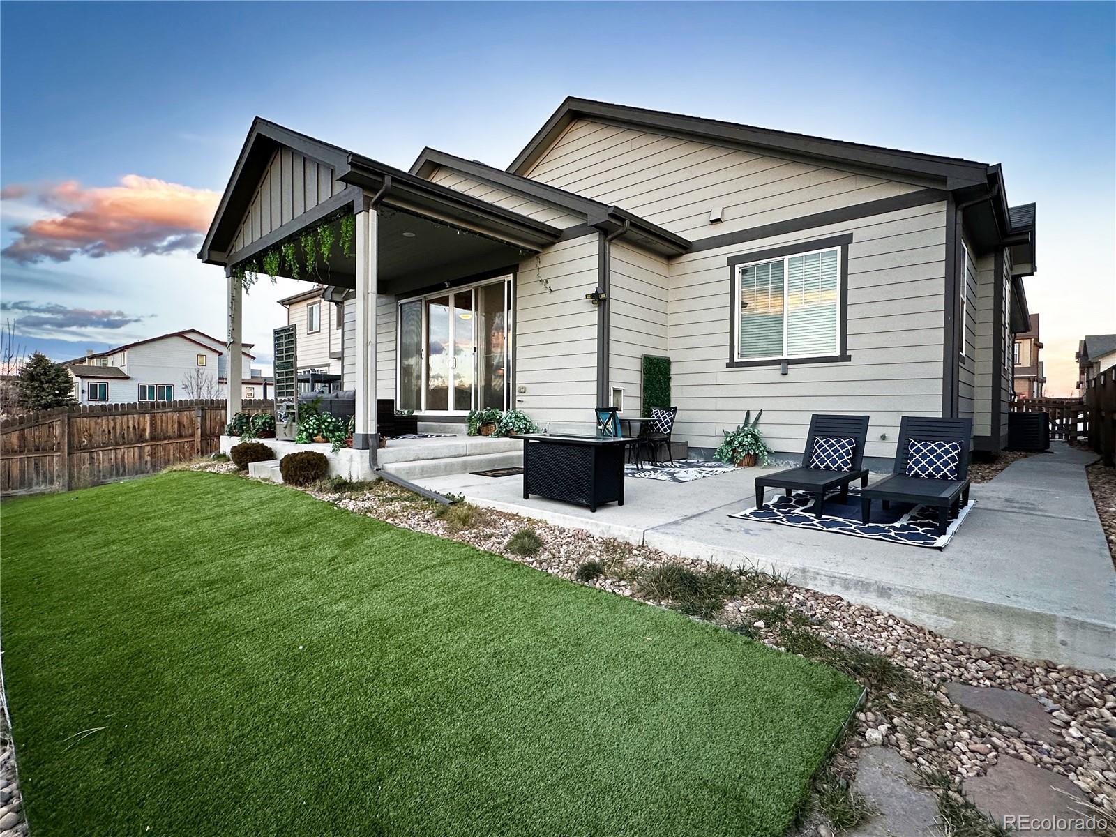 Nestled in the Prairie Farm community, this beautifully maintained 3-bedroom, 2-bath home offers inviting curb appeal with stone detailing, a well-kept lawn, a two-car garage, and a charming front porch. Inside, the bright and airy layout is highlighted by wood-style flooring, modern lighting upgrades, and a soothing neutral color scheme. The kitchen is thoughtfully designed with generous cabinet space, granite countertops, stainless steel appliances, and a central island perfect for casual meals or entertaining. The primary suite provides a comfortable retreat with plush carpeting, a spacious walk-in closet, and an en-suite bath featuring dual vanities. Step outside to enjoy the private backyard complete with a covered patio and cozy seating area—ideal for relaxing or hosting guests. This home truly offers both comfort and style.