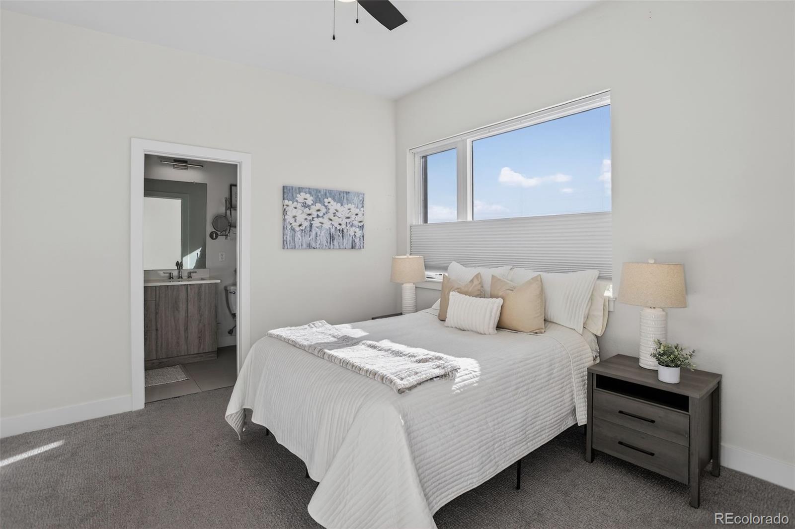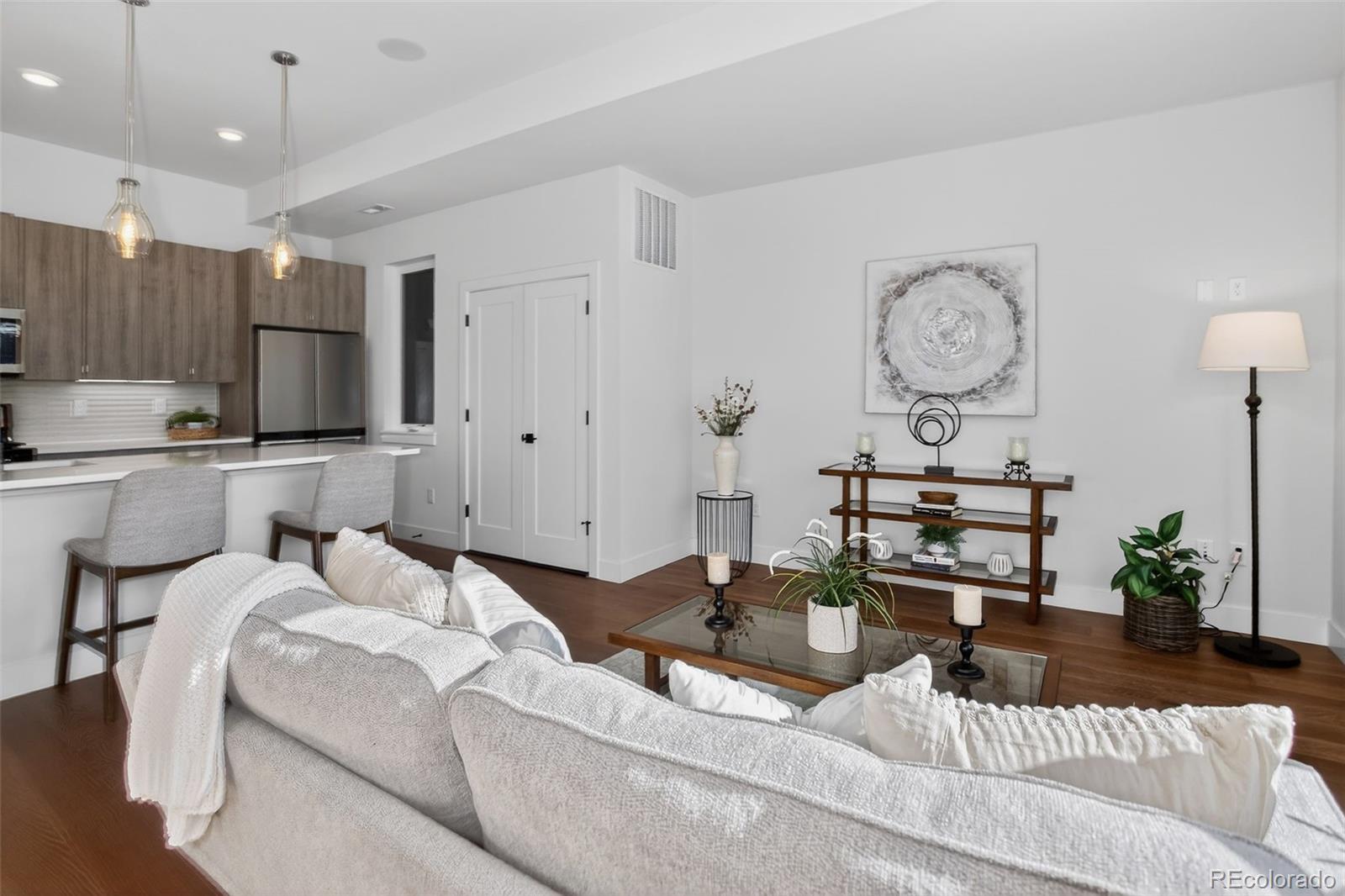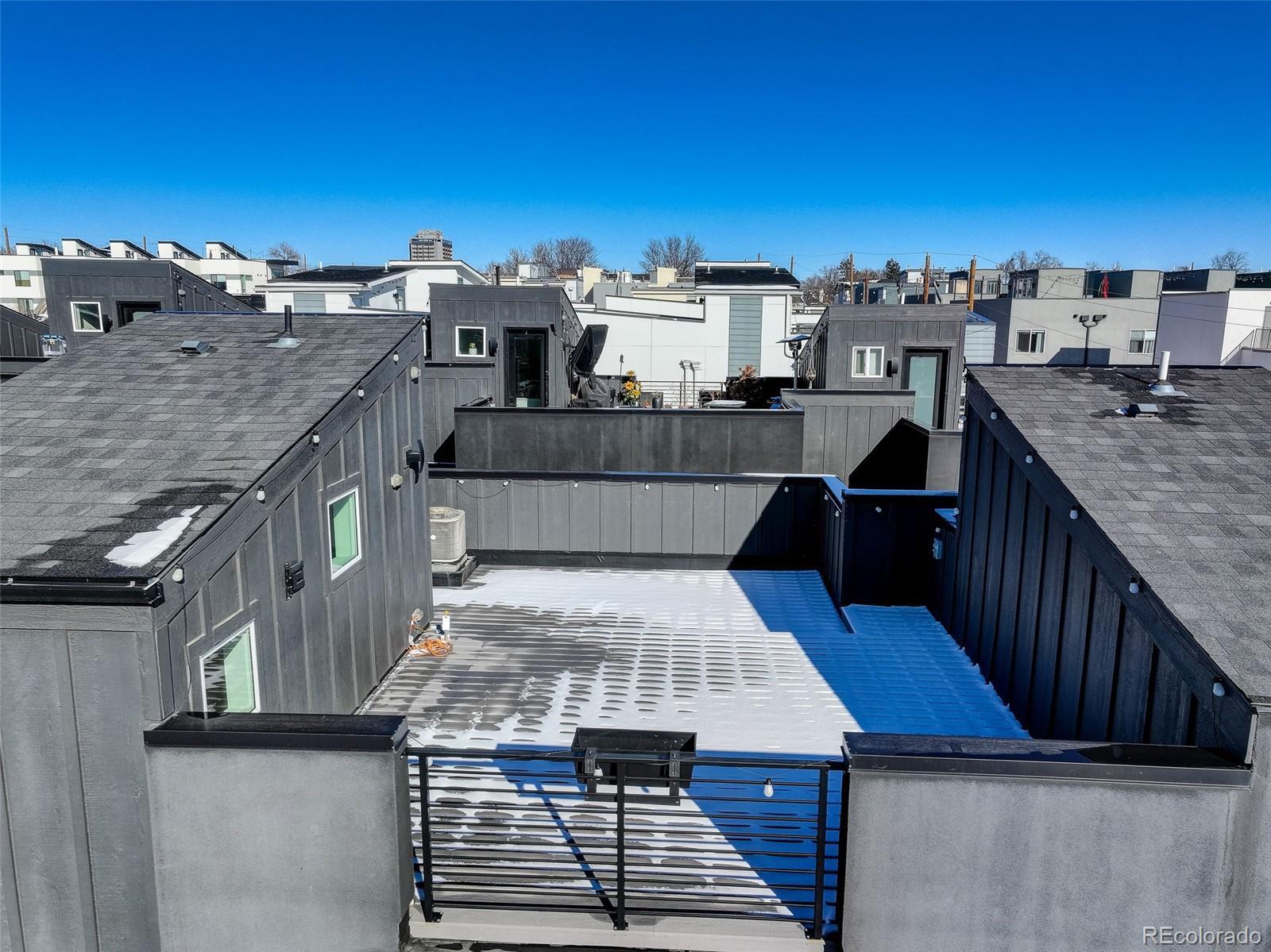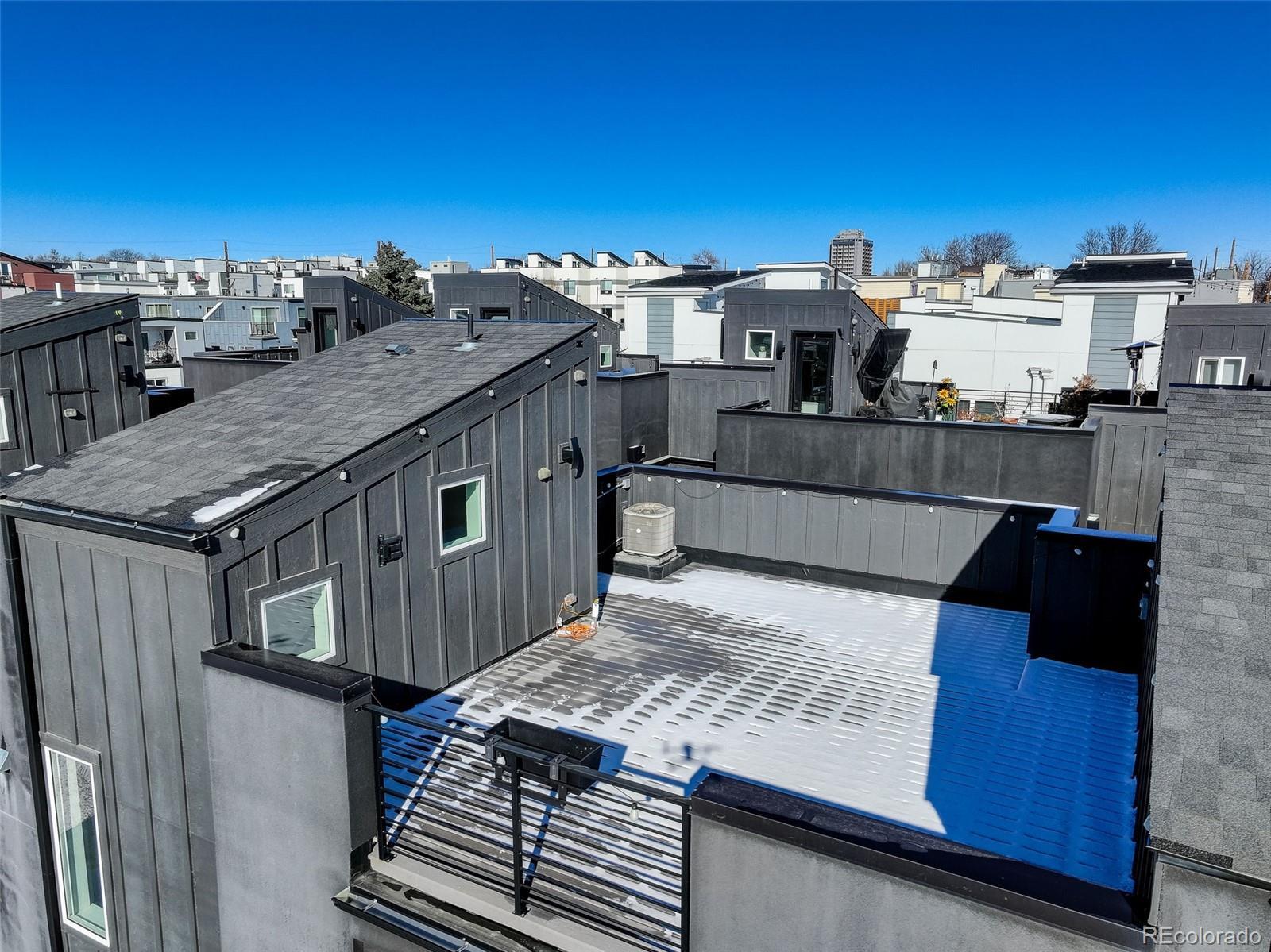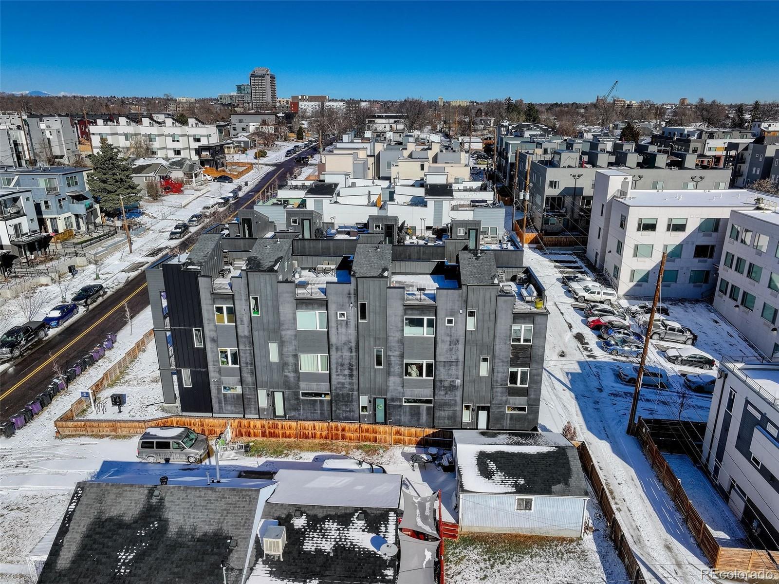 This stunning, modern two-bedroom, 2.5-bath townhouse is truly beautiful inside and out. Featuring stylish designer finishes, abundant natural light, an expansive rooftop deck with mountain and downtown views, and a two-car attached garage, this home offers both comfort and sophistication. Ideally located just south of Sloan’s Lake and only one block from the light rail, the home provides easy access to restaurants, outdoor activities, and a quick ride to downtown. Inside, the home showcases a calming palette of neutral tones and natural textures throughout. Gorgeous hardwood floors greet you at the entry and continue up the stairs and across the main living level. The main floor features a show-stopping kitchen with sleek modern cabinetry, white quartz countertops, stainless steel appliances, and a generous nine-foot island, perfect for entertaining. The kitchen flows seamlessly into the living and dining area, highlighted by a large window that floods the space with natural light. Upstairs, retreat to the inviting bedrooms, including a spacious primary suite with a dual-sink vanity, a beautifully tiled walk-in shower, and a walk-in closet. A second bedroom and full bathroom complete the upper level. The crown jewel of the home is the expansive rooftop deck, offering breathtaking mountain and downtown views. Equipped with a gas hookup for grilling, built-in lighting, and wiring for a hot tub, it’s the perfect space for entertaining or simply unwinding and enjoying the scenery.