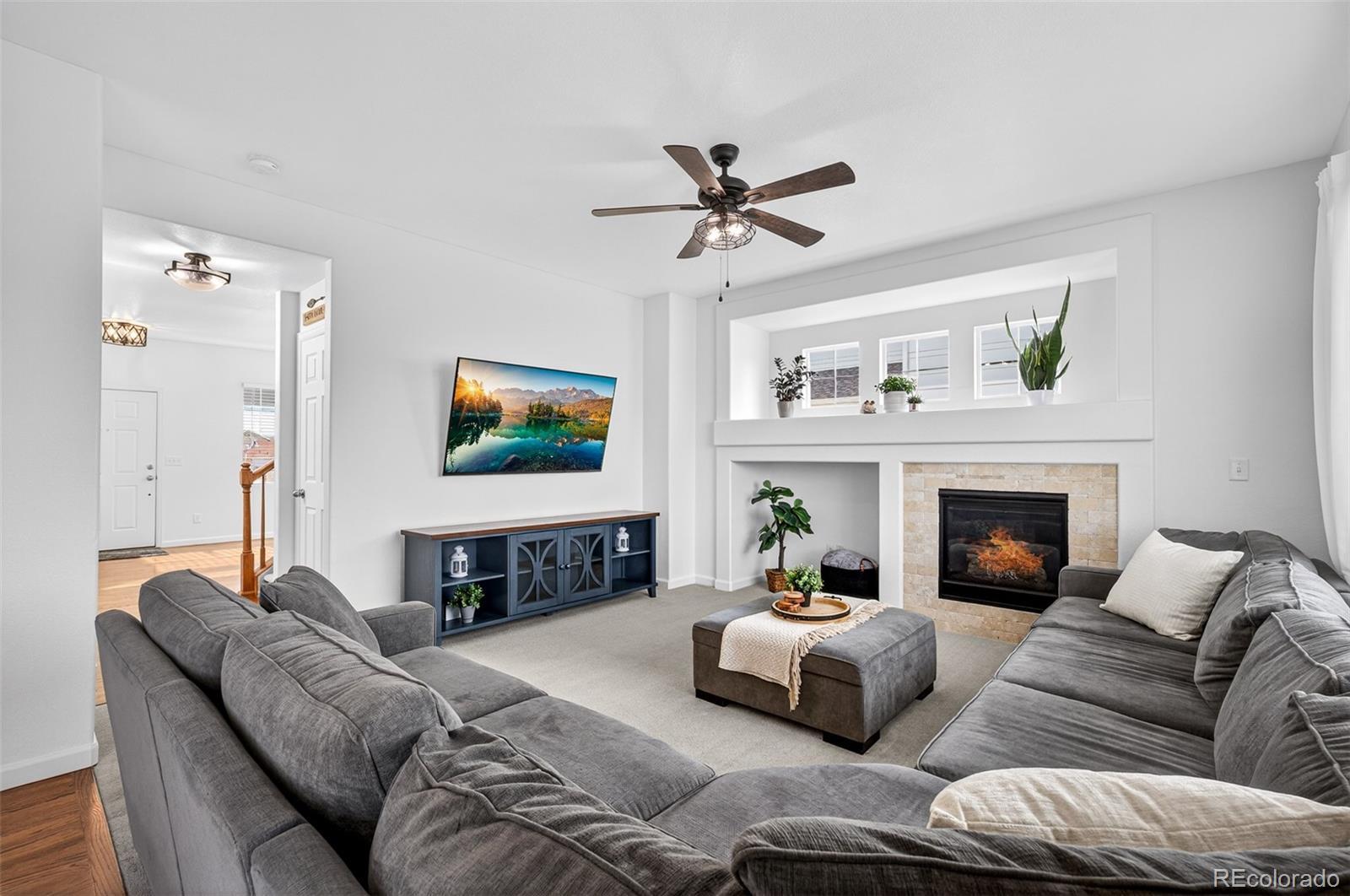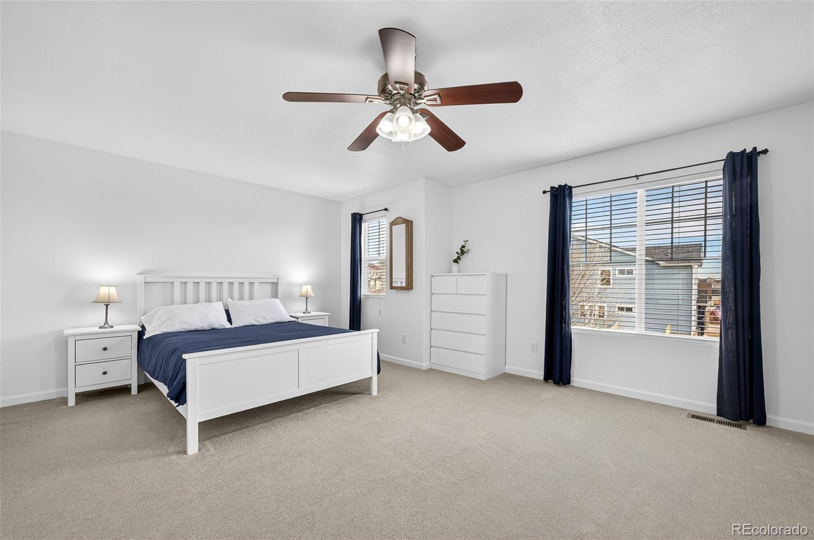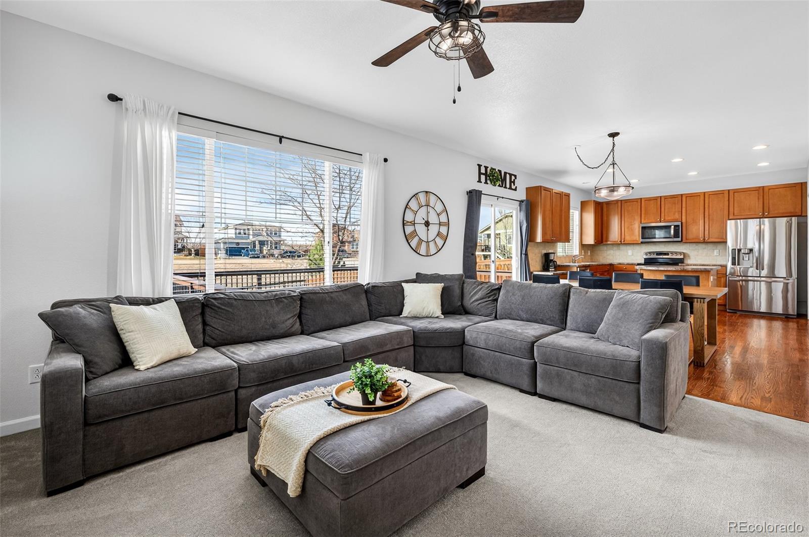 Welcome to this beautifully maintained 3-bed, 3-bath home in the highly sought-after Villages at Riverdale neighborhood. Inside, the open-concept layout flows effortlessly between the kitchen, dining area, and family room, where large windows fill the space with warm, natural light. The spacious kitchen features an eat-in design, pantry, island, breakfast bar, and updated appliances. Upstairs, light continues to pour into the generous primary suite, complete with two walk-in closets and a luxurious 5-piece bath. Secondary bedrooms offer privacy and mountain-view glimpses, with a full bath conveniently located nearby. The unfinished basement includes bathroom rough-ins and offers nearly 1,000 sq ft of future expansion — perfect for adding long-term value. Outside, enjoy a large, well-maintained premium lot that backs to a greenbelt with no neighbors directly behind, providing extra privacy and openness. Major exterior upgrades were completed in September 2025, including a new roof, gutters, downspouts, and exterior paint. Bonus: Home includes mineral rights, generating roughly $1,000 per year, to be transferred to the new owners. This light-filled, low-maintenance home is perfectly situated in a prime location — move-in ready and full of long-term value.