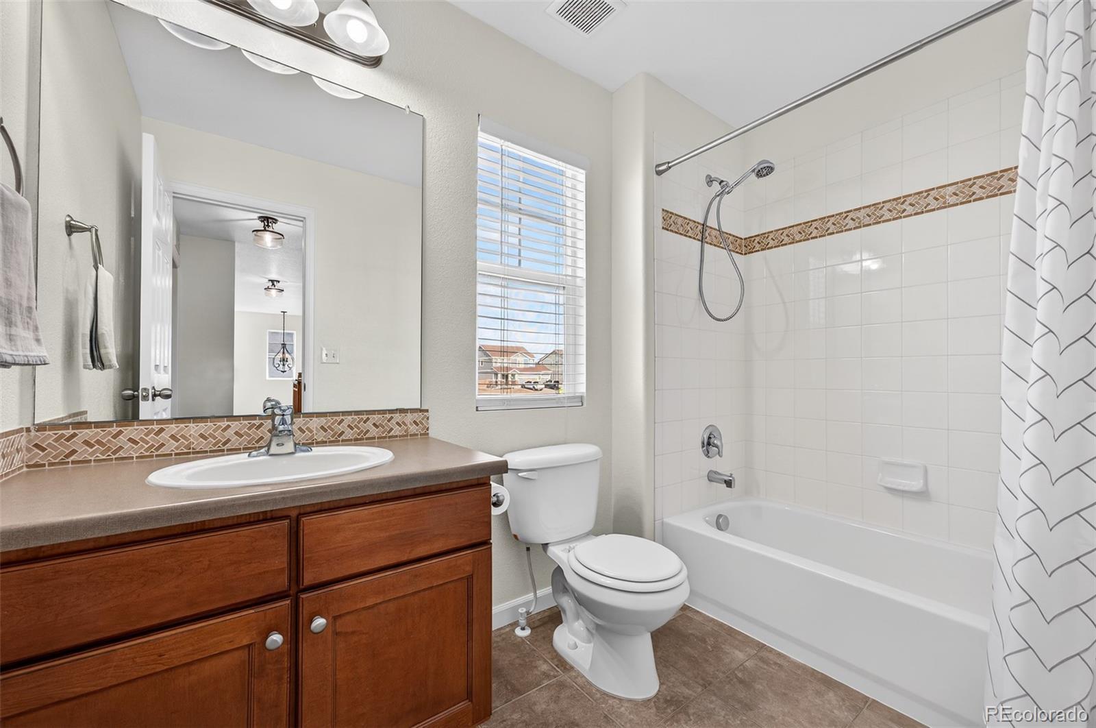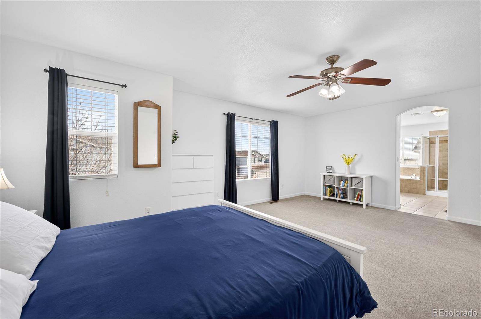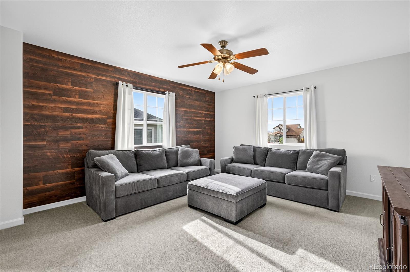 Welcome to this beautifully maintained 3-bed, 3-bath home in the highly sought-after Villages at Riverdale neighborhood. Inside, the open-concept layout flows effortlessly between the kitchen, dining area, and family room, where large windows fill the space with warm, natural light. The spacious kitchen features an eat-in design, pantry, island, breakfast bar, and updated appliances. Upstairs, light continues to pour into the generous primary suite, complete with two walk-in closets and a luxurious 5-piece bath. Secondary bedrooms offer privacy and mountain-view glimpses, with a full bath conveniently located nearby. The unfinished basement includes bathroom rough-ins and offers nearly 1,000 sq ft of future expansion — perfect for adding long-term value. Outside, enjoy a large, well-maintained premium lot that backs to a greenbelt with no neighbors directly behind, providing extra privacy and openness. Major exterior upgrades were completed in September 2025, including a new roof, gutters, downspouts, and exterior paint. Bonus: Home includes mineral rights, generating roughly $1,000 per year, to be transferred to the new owners. This light-filled, low-maintenance home is perfectly situated in a prime location — move-in ready and full of long-term value.