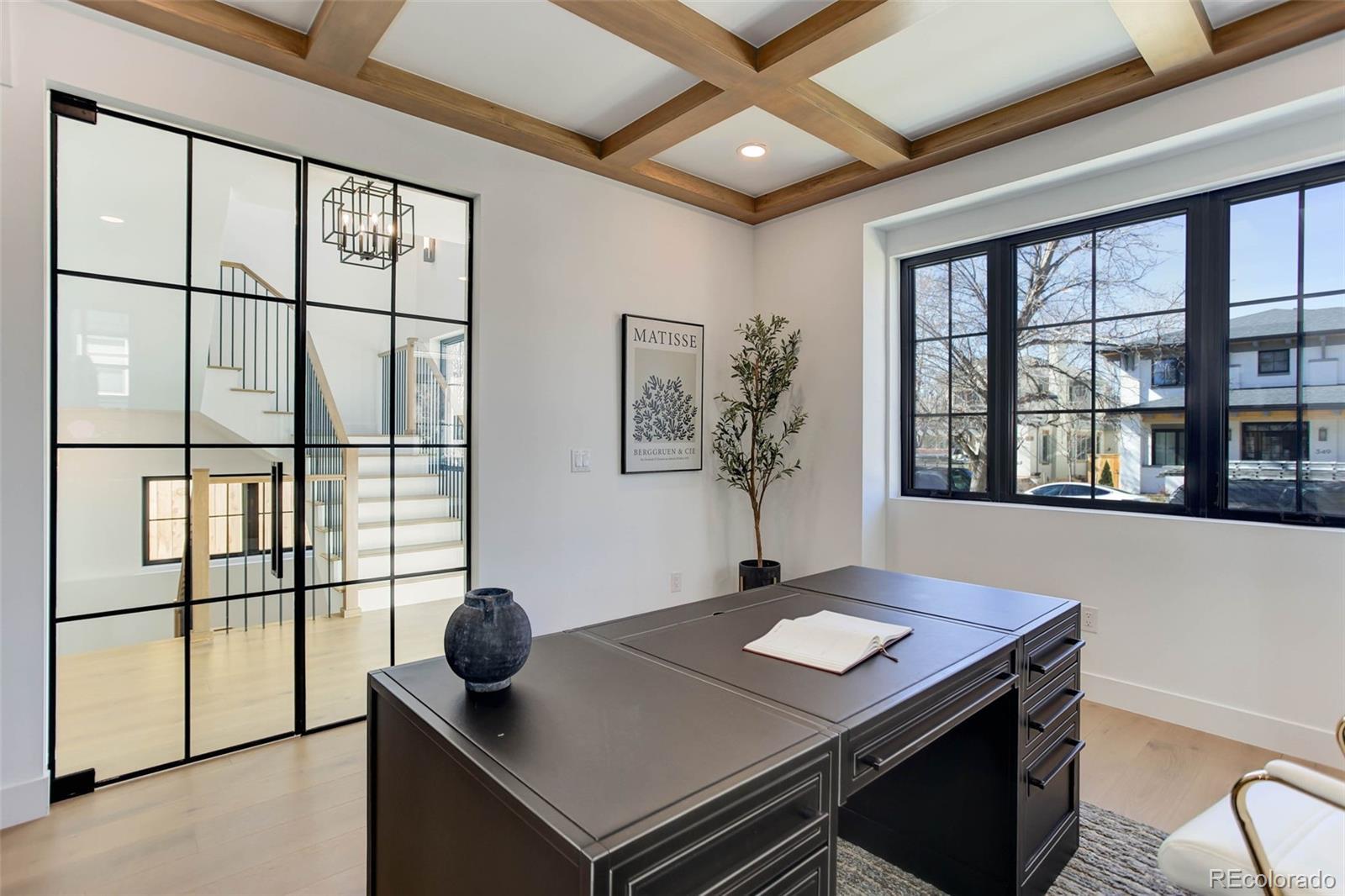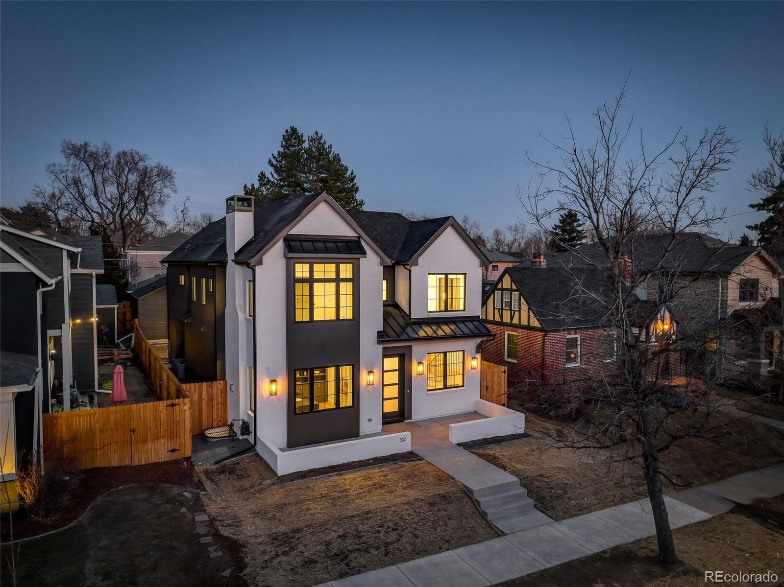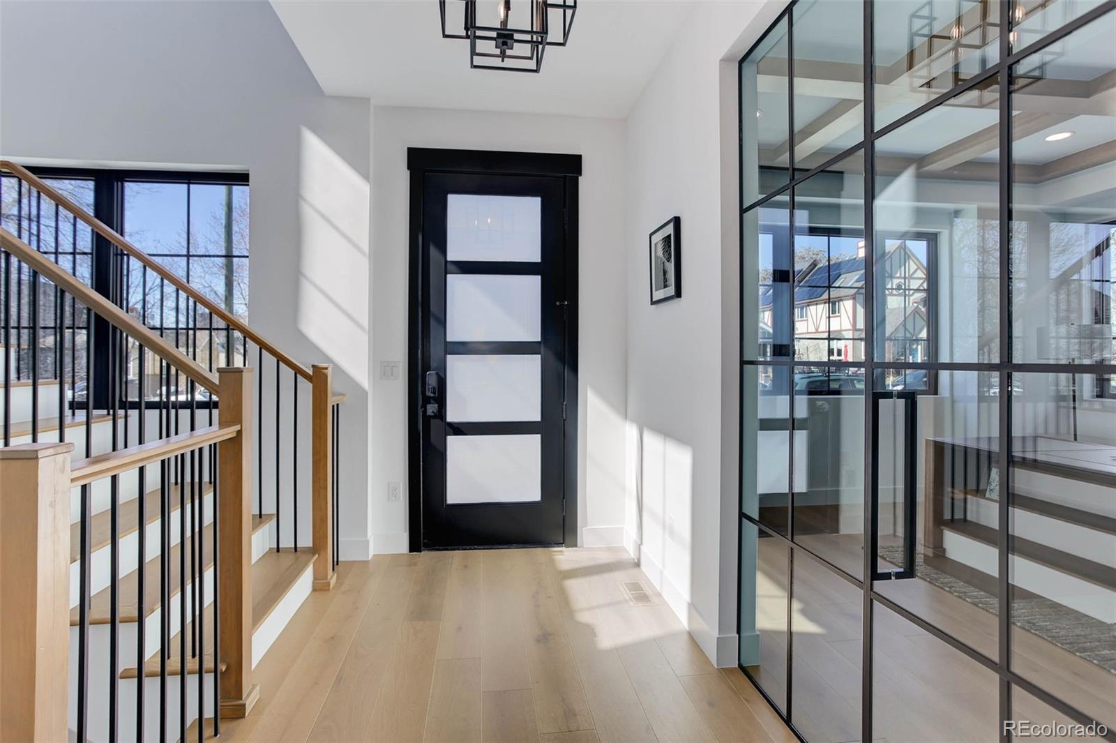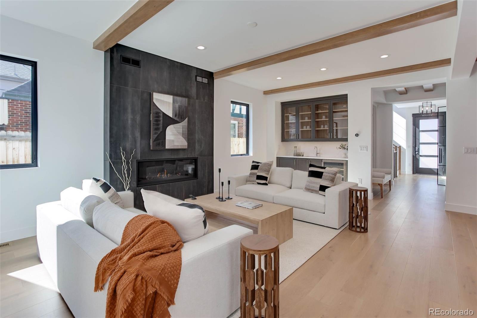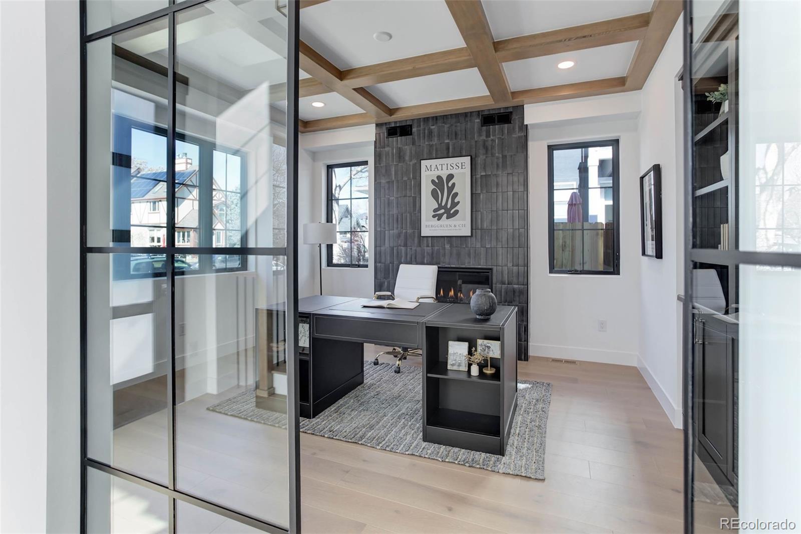 Located just a few blocks from Washington Park on a developed block, this Baronger Colorado masterpiece displays custom features and a sleek layout. To the left of the foyer, a staircase with wood handrails and rod iron balusters give a spacious path to move between levels. To the left of the foyer, glass doors with grids lead to a 170sqft office with a 36" fireplace and built in cabinets/shelves. The kitchen features wolf, subzero and cove appliances, rift white oak cabinets with integrated lighting, and an efficient layout designed for large meal prep. Adjacent to the kitchen, the great room has its own wet bar with glass cabinets, an under-counter beverage center and integrated lighting. The great room also features a 52" fireplace with Direct heat circulation, and sliders that lead you to a covered patio with a 42" exterior fireplace. Faux beams on the 1st floor have been stained to match the European white oak hardwood floors. The basement has been designed to allow for 2 bedrooms,a full bar, theatre area, and a 210 square foot gym! The gym has a glass partition entrance, glass mirrors spanning the entire east wall, block framing to allow for equipment mounting, wiring for speakers/t.v, and self-leveled floors with gym-grade flooring. Not your average at-home gym! When walking upstairs you'll notice the laundry room has been placed next to the primary suite. Two 5' long floating shelves, a builder supplied washer and dryer, and a 42" countertop for folding clothes make this laundry room extremely functional. The primary suite features a 42" fireplace, chandelier, slat wood panels, and French doors that open to a private deck floored with tiles and wired for speakers and a T.V. The backyard has a detached 2 car garage that has been placed close to the north property line. This has allowed for a large greenspace/backyard that very few new construction homes offer.