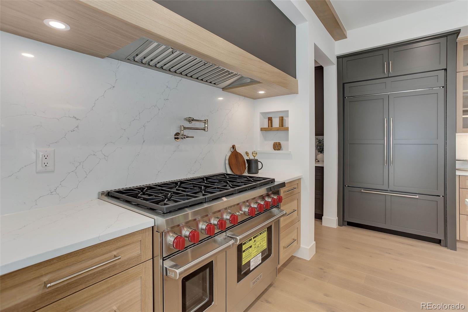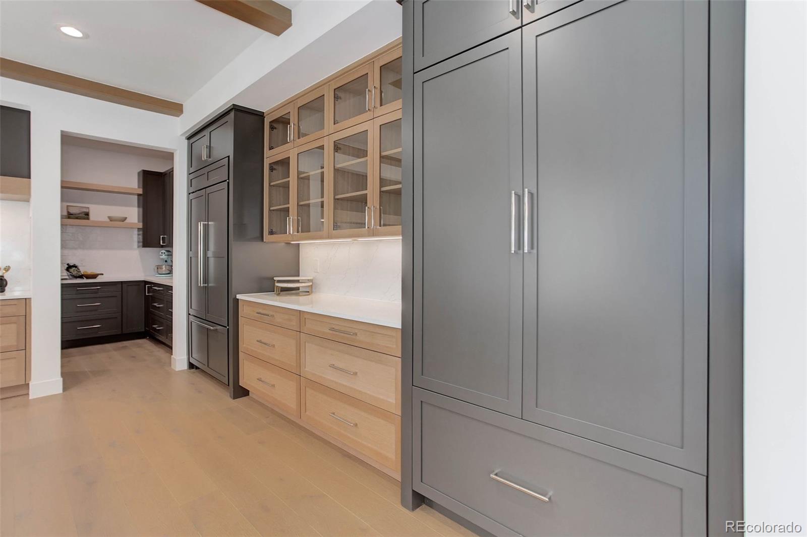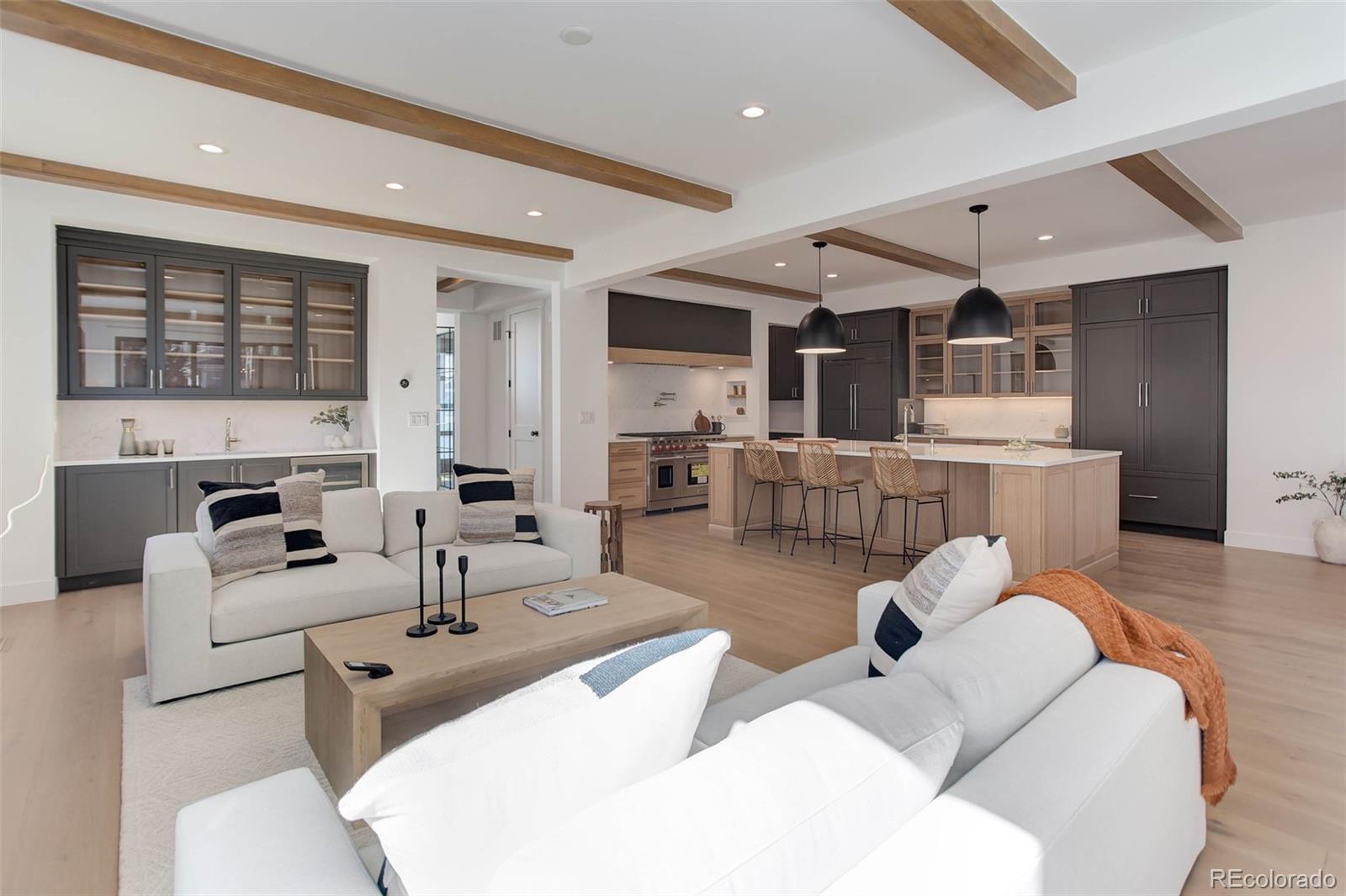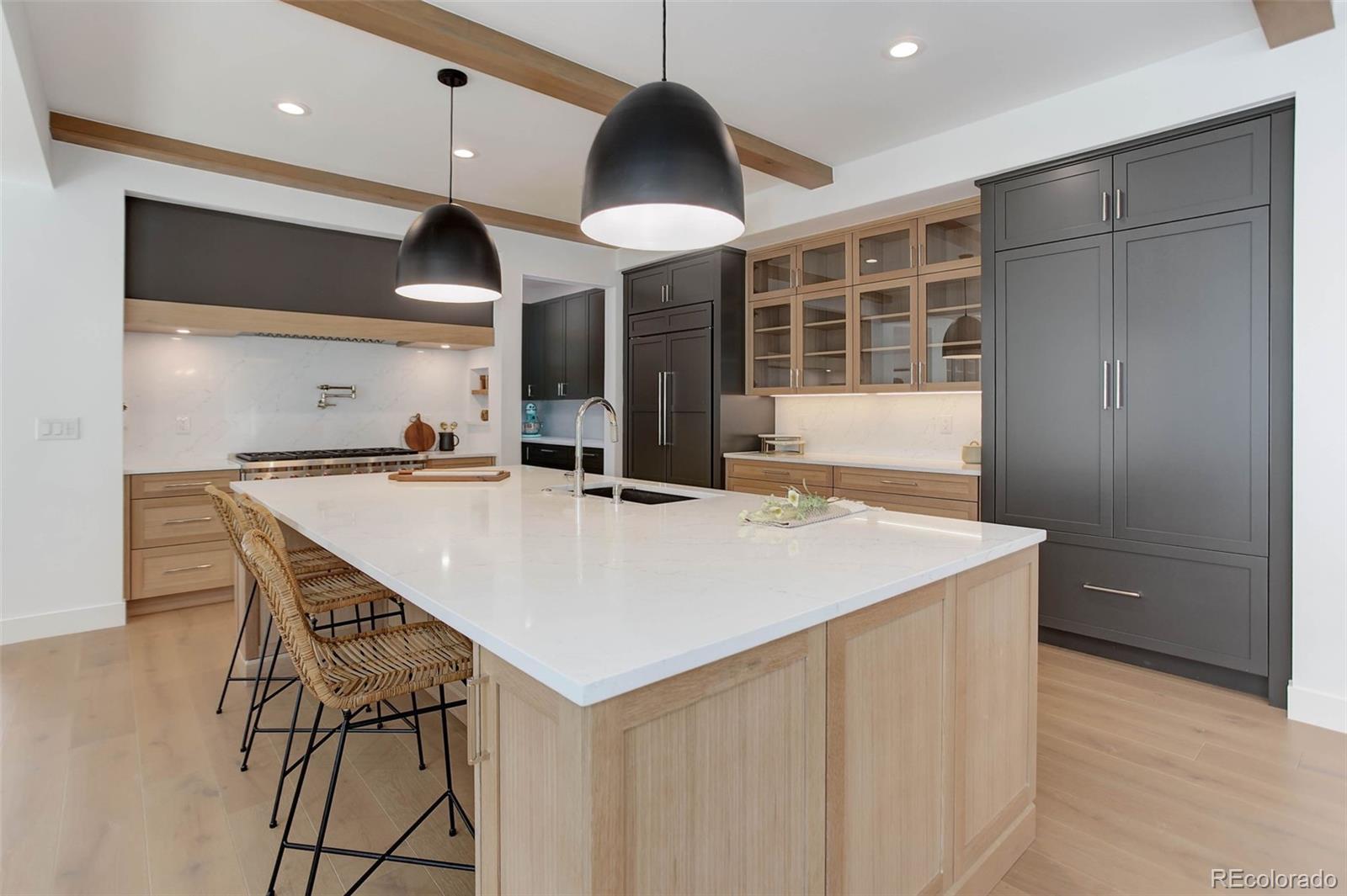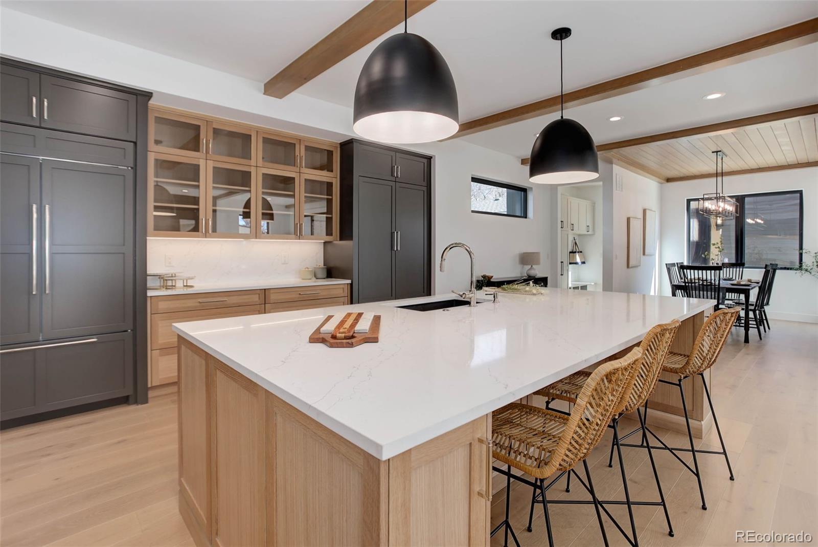 Located just a few blocks from Washington Park on a developed block, this Baronger Colorado masterpiece displays custom features and a sleek layout. To the left of the foyer, a staircase with wood handrails and rod iron balusters give a spacious path to move between levels. To the left of the foyer, glass doors with grids lead to a 170sqft office with a 36" fireplace and built in cabinets/shelves. The kitchen features wolf, subzero and cove appliances, rift white oak cabinets with integrated lighting, and an efficient layout designed for large meal prep. Adjacent to the kitchen, the great room has its own wet bar with glass cabinets, an under-counter beverage center and integrated lighting. The great room also features a 52" fireplace with Direct heat circulation, and sliders that lead you to a covered patio with a 42" exterior fireplace. Faux beams on the 1st floor have been stained to match the European white oak hardwood floors. The basement has been designed to allow for 2 bedrooms,a full bar, theatre area, and a 210 square foot gym! The gym has a glass partition entrance, glass mirrors spanning the entire east wall, block framing to allow for equipment mounting, wiring for speakers/t.v, and self-leveled floors with gym-grade flooring. Not your average at-home gym! When walking upstairs you'll notice the laundry room has been placed next to the primary suite. Two 5' long floating shelves, a builder supplied washer and dryer, and a 42" countertop for folding clothes make this laundry room extremely functional. The primary suite features a 42" fireplace, chandelier, slat wood panels, and French doors that open to a private deck floored with tiles and wired for speakers and a T.V. The backyard has a detached 2 car garage that has been placed close to the north property line. This has allowed for a large greenspace/backyard that very few new construction homes offer.