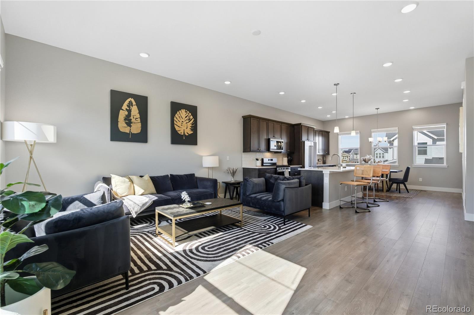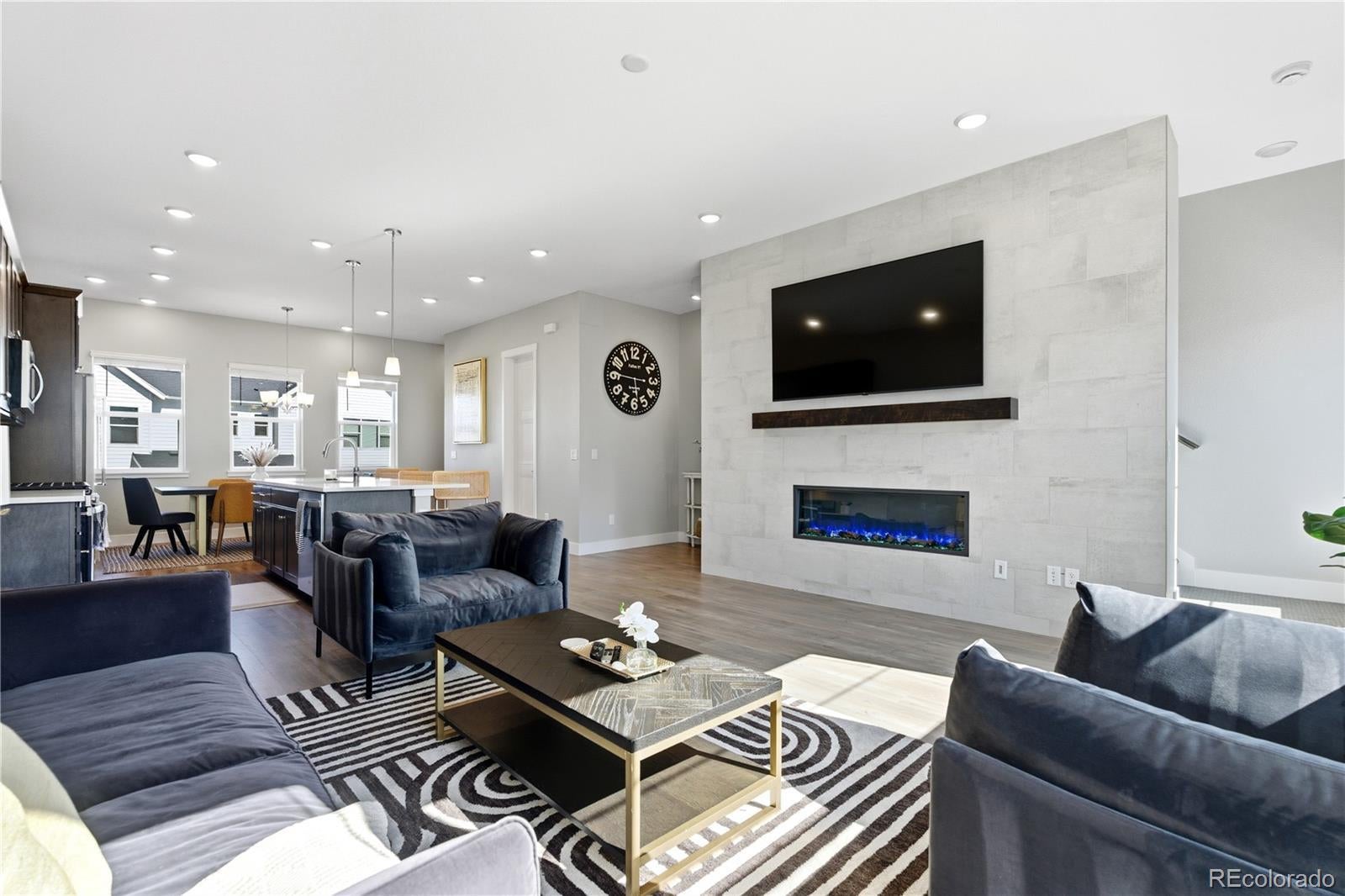 Modern Elegance Meets Outdoor Luxury in Central Park’s North End! Step into this better-than-new townhome in one of Denver’s most desirable neighborhoods. From the moment you arrive at the inviting front porch with a built-in gas fireplace, you’ll know this is not your average home—it’s a lifestyle. Natural light floods the open-concept main level, showcasing clean contemporary design, designer finishes, and a spacious, comfortable flow. The living room centers around a sleek modern fireplace, adding warmth and sophistication, while the adjoining dining area creates the perfect setting for hosting friends and family. The chef’s kitchen is the heart of the home, featuring white quartz countertops, soft-close cabinetry, stainless-steel appliances, and an oversized island that invites connection. Upstairs, you’ll find two generous bedrooms, a full bath, and a convenient laundry area. The primary suite offers a serene retreat with a spa-inspired ensuite—dual sinks, euro-glass shower, and floor-to-ceiling tile detailing. Saving the best for last, the private rooftop deck is your personal sanctuary with unobstructed mountain views—ideal for relaxing by the fire under Colorado’s endless blue skies or star-filled nights. Designed for low-maintenance living, this townhome offers style, comfort, and thoughtful upgrades you won’t find elsewhere. Schedule your private showing today and experience the perfect balance of modern elegance and everyday ease.