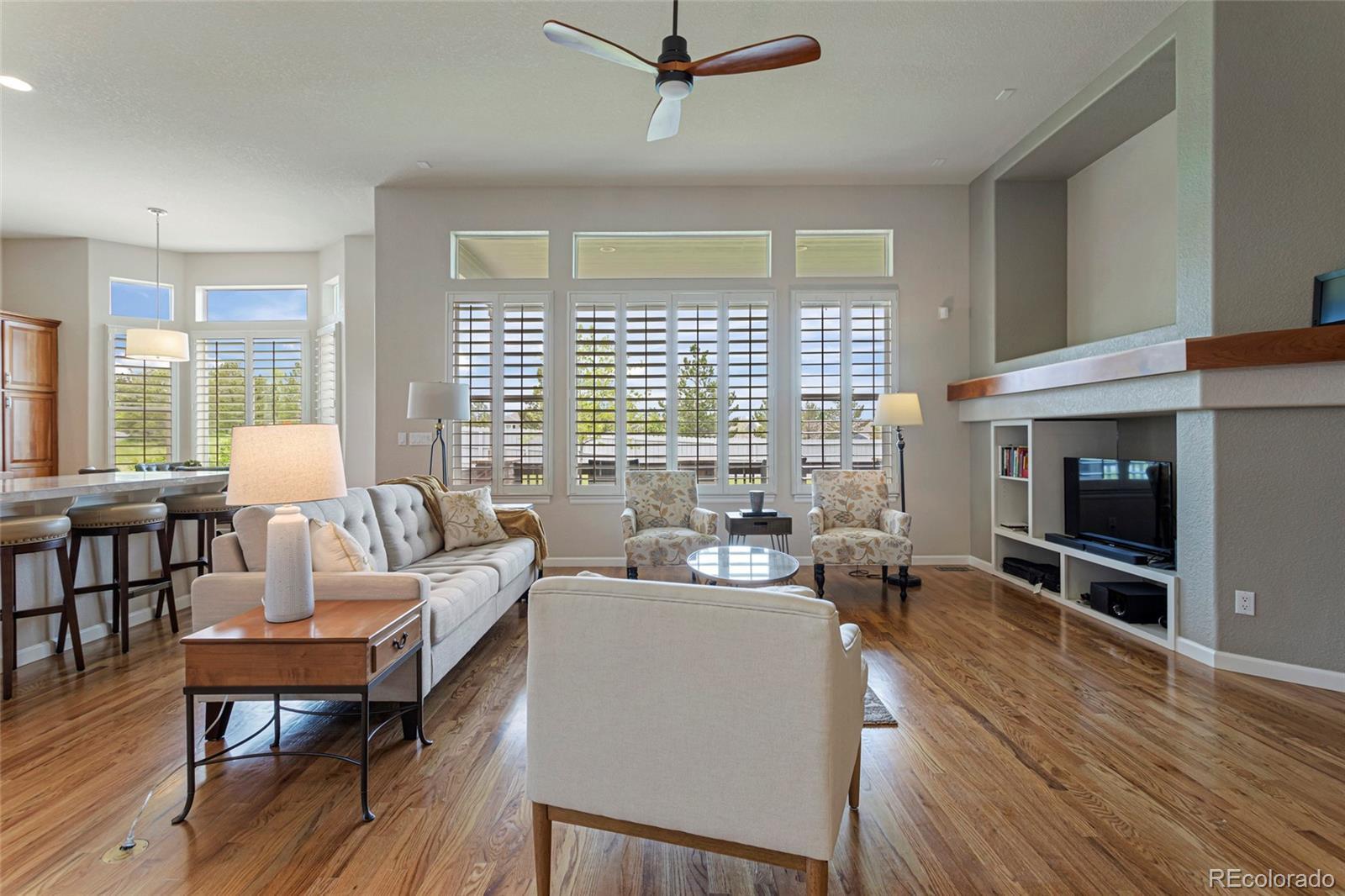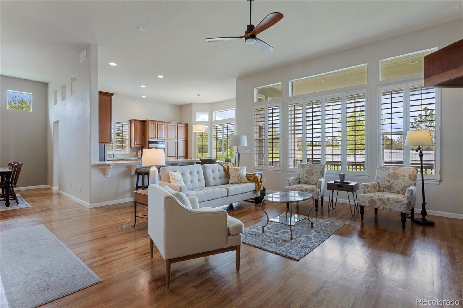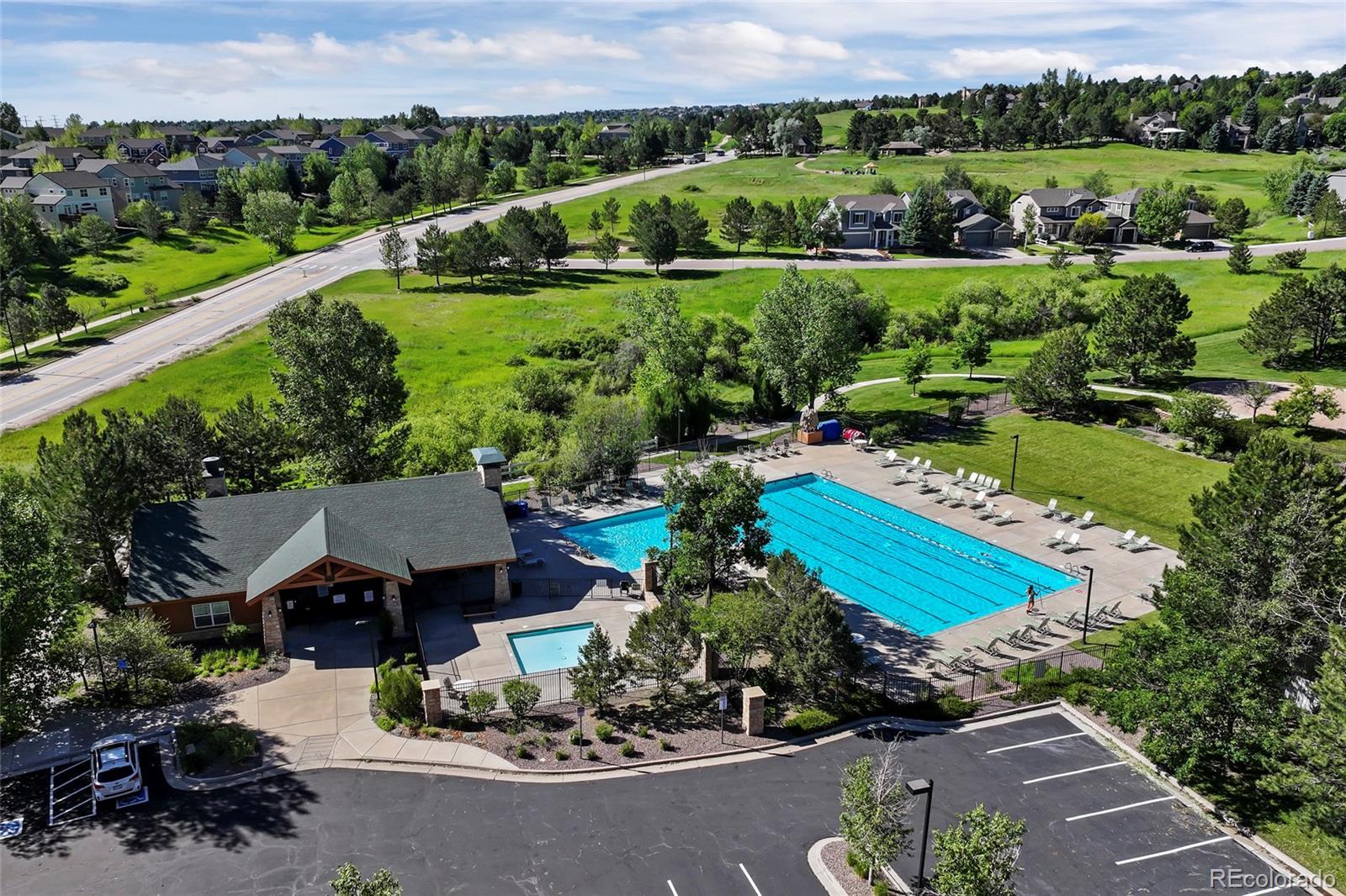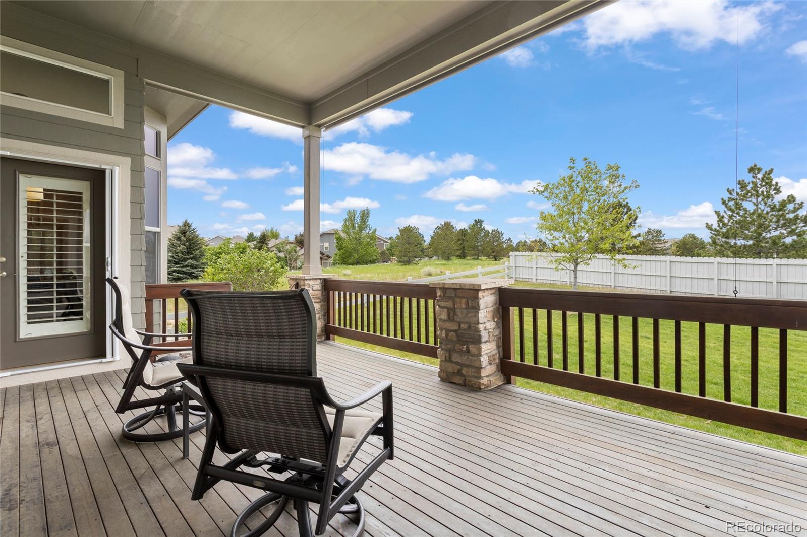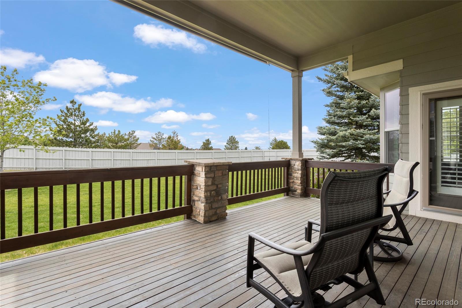 BEST LOT IN NEIGHBORHOOD! Discover the epitome of effortless living in this low maintenance ranch. Pristine perfection, this spacious abode offers 3,747 square feet of living space, nestled at the end of a serene cul-de-sac, adjacent to open space, providing mountain and golf course views. Step inside and be greeted by a thoughtfully designed main level, featuring large Bedrooms, a study, 2 full Bathrooms, and an open concept Family Room with vaulted ceilings. The inviting Dining Room boasts built-in cabinets, ideal for showcasing your treasured possessions. Indulge in the luxurious Primary Suite, with a coffered ceiling and a remodeled bathroom that includes heated floors, 2 walk-in closets, spa shower, and soaking tub. Access the deck directly from the Primary Suite, seamlessly blending indoor/outdoor living. The well-appointed kitchen offers an abundance of Cherrywood cabinetry, stainless steel appliances, a breakfast bar, eat-in space, and granite tile countertops. You'll find cabinetry lining the wall, perfect for hosting gatherings and entertaining guests in the formal Dining Room. Throughout most of the main level, enjoy the beauty of wood flooring and updated lighting, enhancing the allure. Step outside onto the private covered deck, complete with a retractable sunscreen, and appreciate the tranquil surroundings. Plantation shutters adorn the windows, adding a touch of sophistication. Descend to the Finished Basement, where you'll find a wet bar, fireplace, built-in cabinetry, an additional Bedroom and Bath. With over 500 square feet of unfinished space, the basement offers endless possibilities for further customization. The exterior landscaping is meticulously maintained by the HOA. Enjoy the convenience of a community pool within walking distance. Additionally, the location offers easy access to Daniels Park, The Ridge golf course, 1-25, DTC and 35 min. to DIA. Embrace a lifestyle of comfort and convenience in this exceptional ranch-style home.