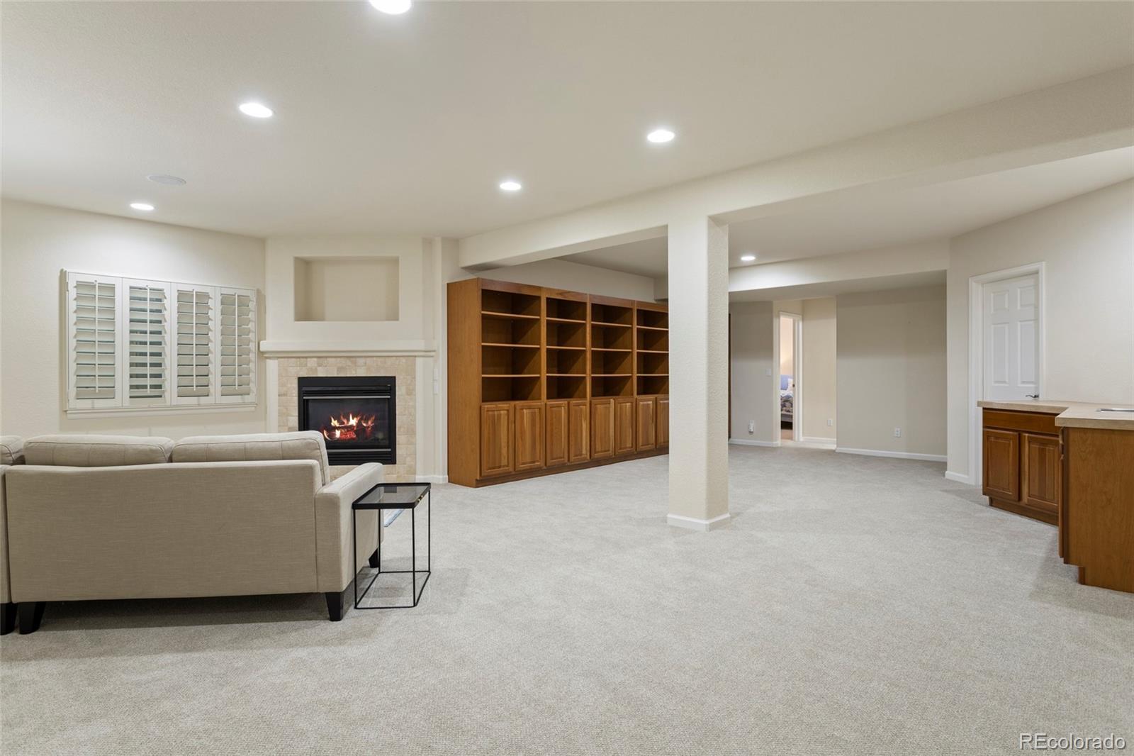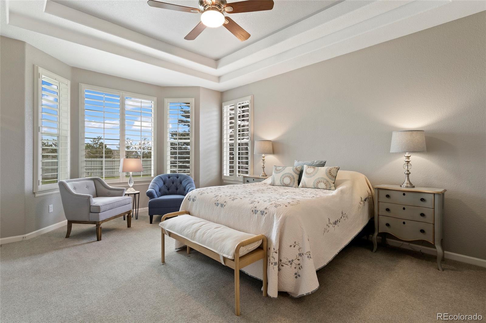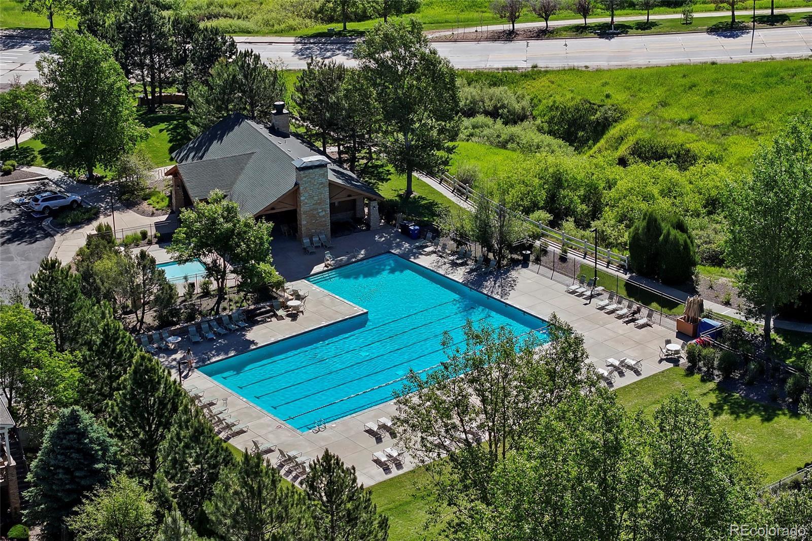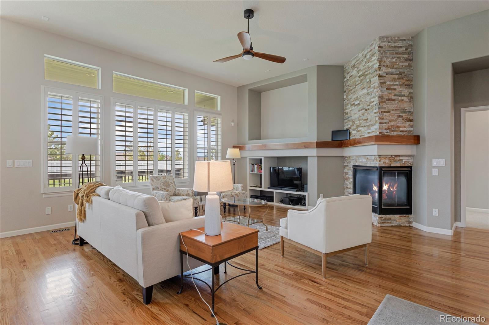 BEST LOT IN NEIGHBORHOOD! Discover the epitome of effortless living in this low maintenance ranch. Pristine perfection, this spacious abode offers 3,747 square feet of living space, nestled at the end of a serene cul-de-sac, adjacent to open space, providing mountain and golf course views. Step inside and be greeted by a thoughtfully designed main level, featuring large Bedrooms, a study, 2 full Bathrooms, and an open concept Family Room with vaulted ceilings. The inviting Dining Room boasts built-in cabinets, ideal for showcasing your treasured possessions. Indulge in the luxurious Primary Suite, with a coffered ceiling and a remodeled bathroom that includes heated floors, 2 walk-in closets, spa shower, and soaking tub. Access the deck directly from the Primary Suite, seamlessly blending indoor/outdoor living. The well-appointed kitchen offers an abundance of Cherrywood cabinetry, stainless steel appliances, a breakfast bar, eat-in space, and granite tile countertops. You'll find cabinetry lining the wall, perfect for hosting gatherings and entertaining guests in the formal Dining Room. Throughout most of the main level, enjoy the beauty of wood flooring and updated lighting, enhancing the allure. Step outside onto the private covered deck, complete with a retractable sunscreen, and appreciate the tranquil surroundings. Plantation shutters adorn the windows, adding a touch of sophistication. Descend to the Finished Basement, where you'll find a wet bar, fireplace, built-in cabinetry, an additional Bedroom and Bath. With over 500 square feet of unfinished space, the basement offers endless possibilities for further customization. The exterior landscaping is meticulously maintained by the HOA. Enjoy the convenience of a community pool within walking distance. Additionally, the location offers easy access to Daniels Park, The Ridge golf course, 1-25, DTC and 35 min. to DIA. Embrace a lifestyle of comfort and convenience in this exceptional ranch-style home.