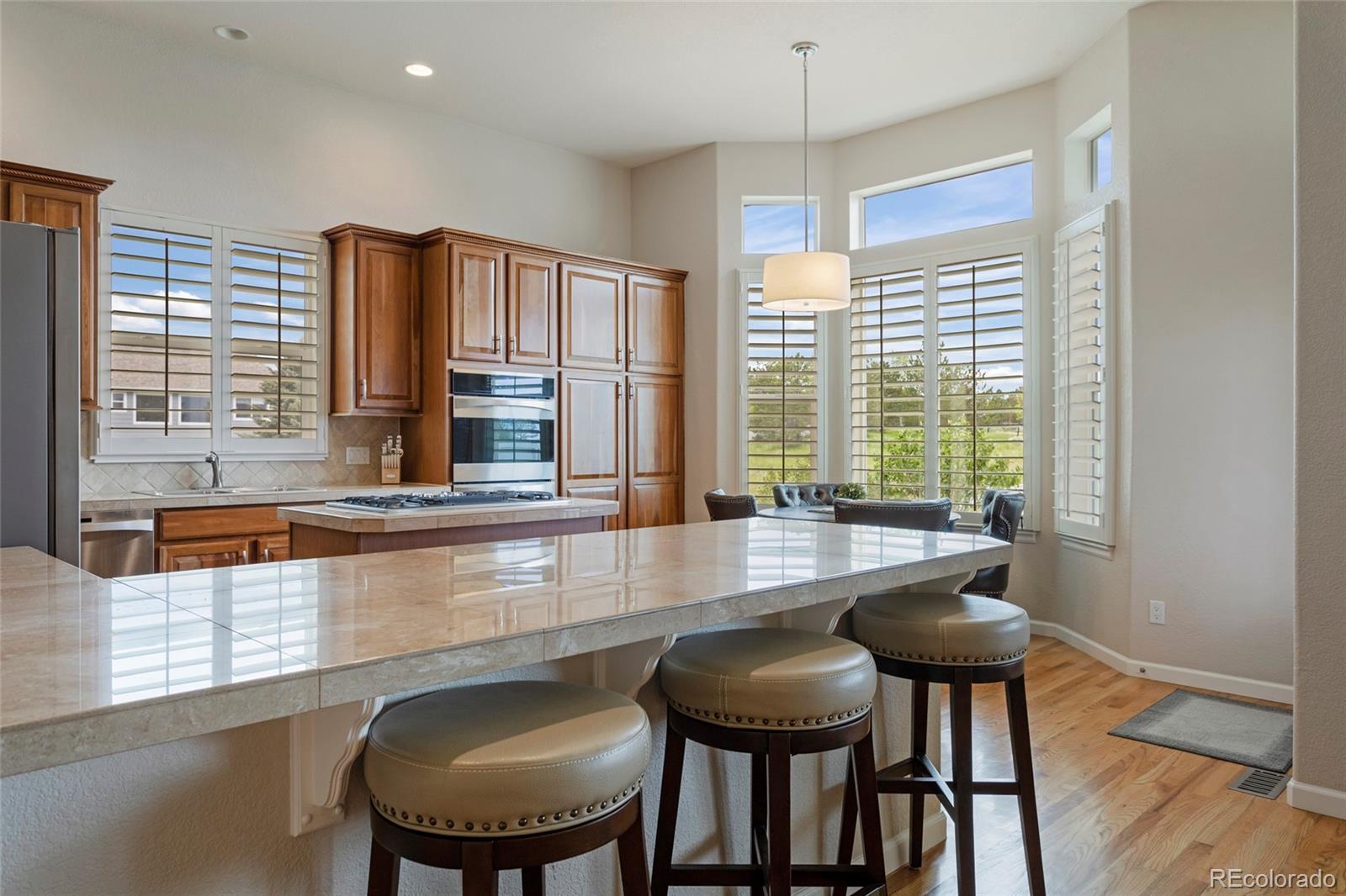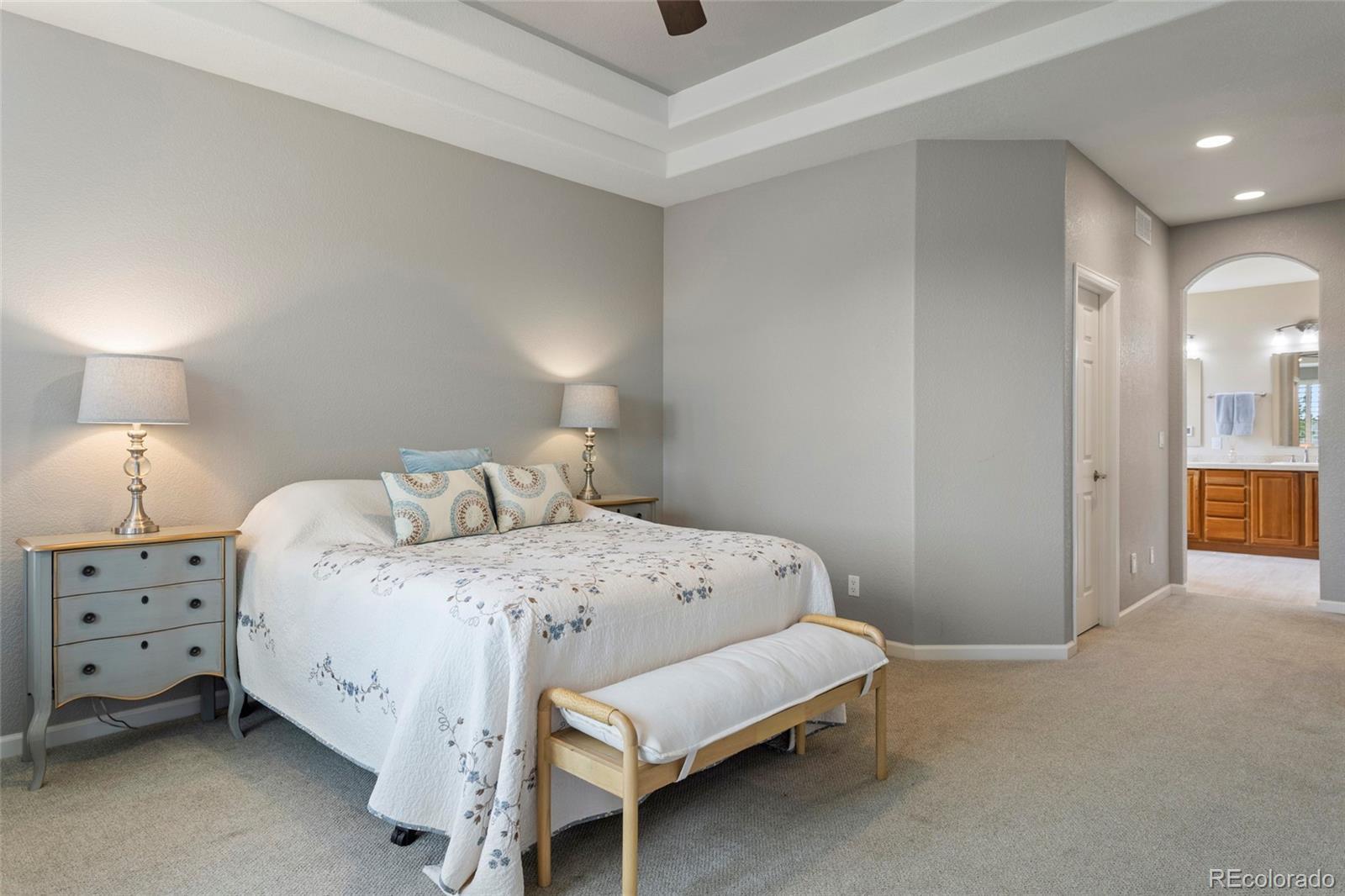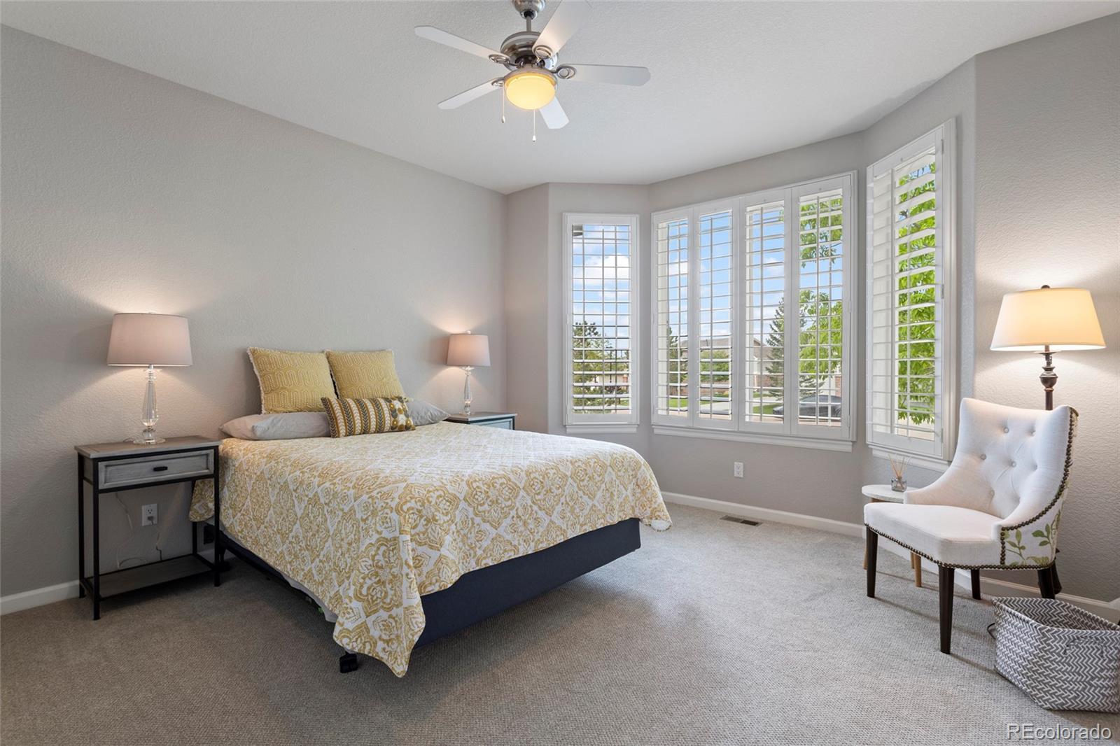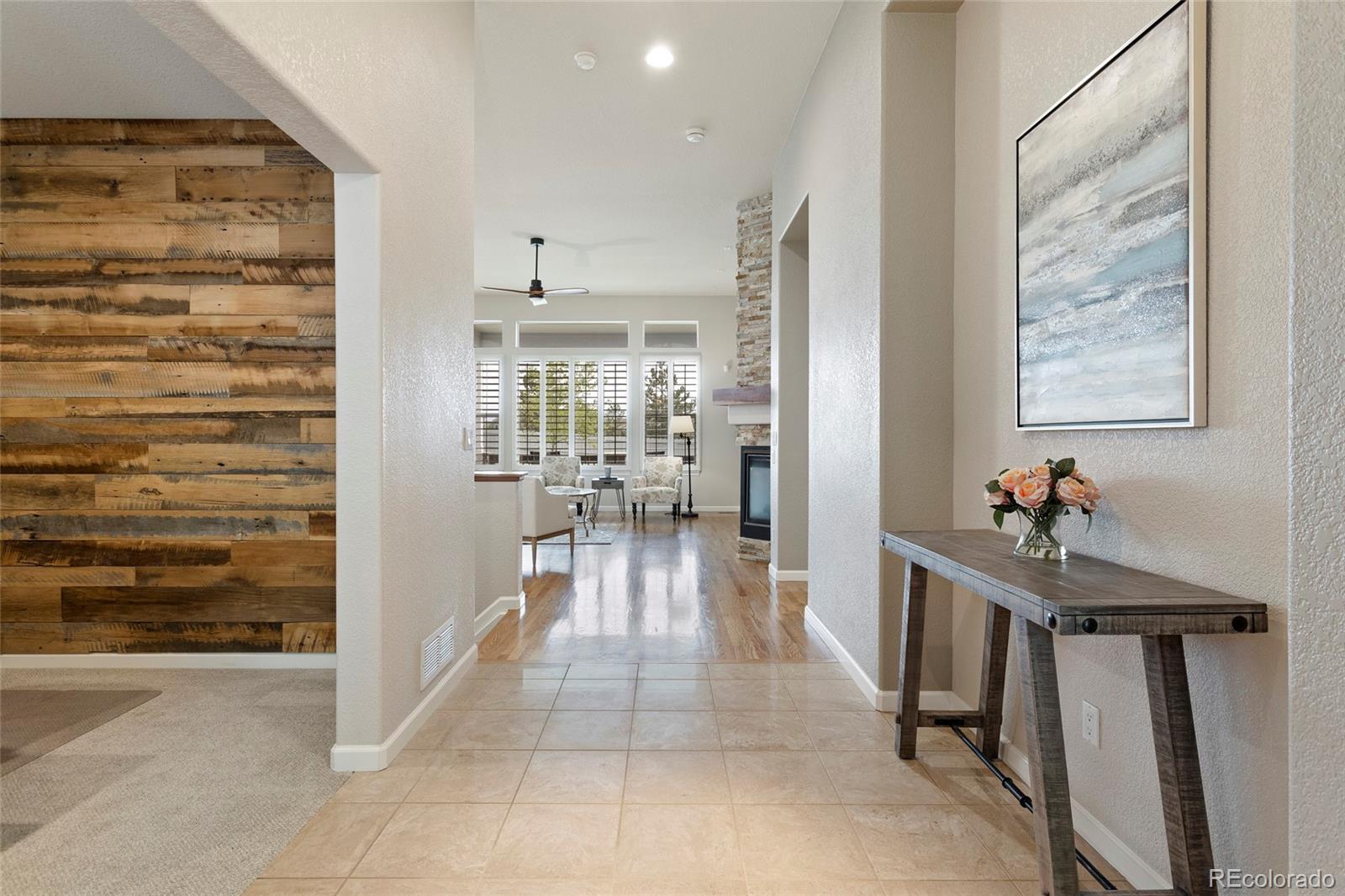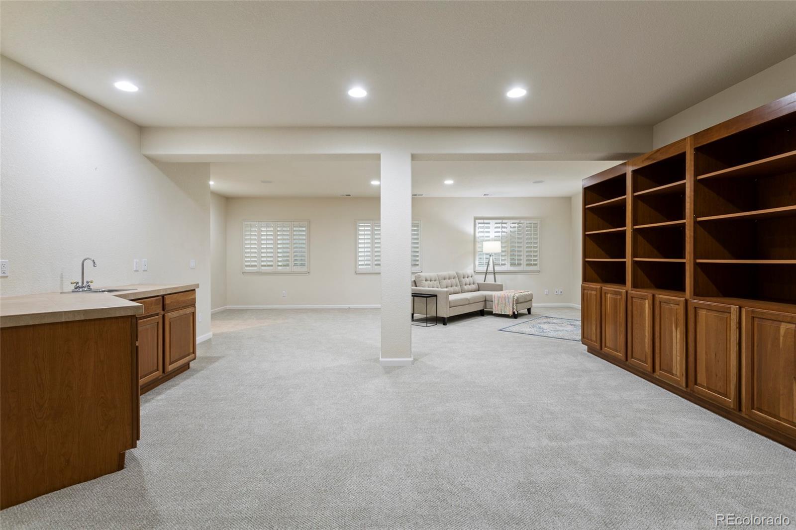 BEST LOT IN NEIGHBORHOOD! Discover the epitome of effortless living in this low maintenance ranch. Pristine perfection, this spacious abode offers 3,747 square feet of living space, nestled at the end of a serene cul-de-sac, adjacent to open space, providing mountain and golf course views. Step inside and be greeted by a thoughtfully designed main level, featuring large Bedrooms, a study, 2 full Bathrooms, and an open concept Family Room with vaulted ceilings. The inviting Dining Room boasts built-in cabinets, ideal for showcasing your treasured possessions. Indulge in the luxurious Primary Suite, with a coffered ceiling and a remodeled bathroom that includes heated floors, 2 walk-in closets, spa shower, and soaking tub. Access the deck directly from the Primary Suite, seamlessly blending indoor/outdoor living. The well-appointed kitchen offers an abundance of Cherrywood cabinetry, stainless steel appliances, a breakfast bar, eat-in space, and granite tile countertops. You'll find cabinetry lining the wall, perfect for hosting gatherings and entertaining guests in the formal Dining Room. Throughout most of the main level, enjoy the beauty of wood flooring and updated lighting, enhancing the allure. Step outside onto the private covered deck, complete with a retractable sunscreen, and appreciate the tranquil surroundings. Plantation shutters adorn the windows, adding a touch of sophistication. Descend to the Finished Basement, where you'll find a wet bar, fireplace, built-in cabinetry, an additional Bedroom and Bath. With over 500 square feet of unfinished space, the basement offers endless possibilities for further customization. The exterior landscaping is meticulously maintained by the HOA. Enjoy the convenience of a community pool within walking distance. Additionally, the location offers easy access to Daniels Park, The Ridge golf course, 1-25, DTC and 35 min. to DIA. Embrace a lifestyle of comfort and convenience in this exceptional ranch-style home.