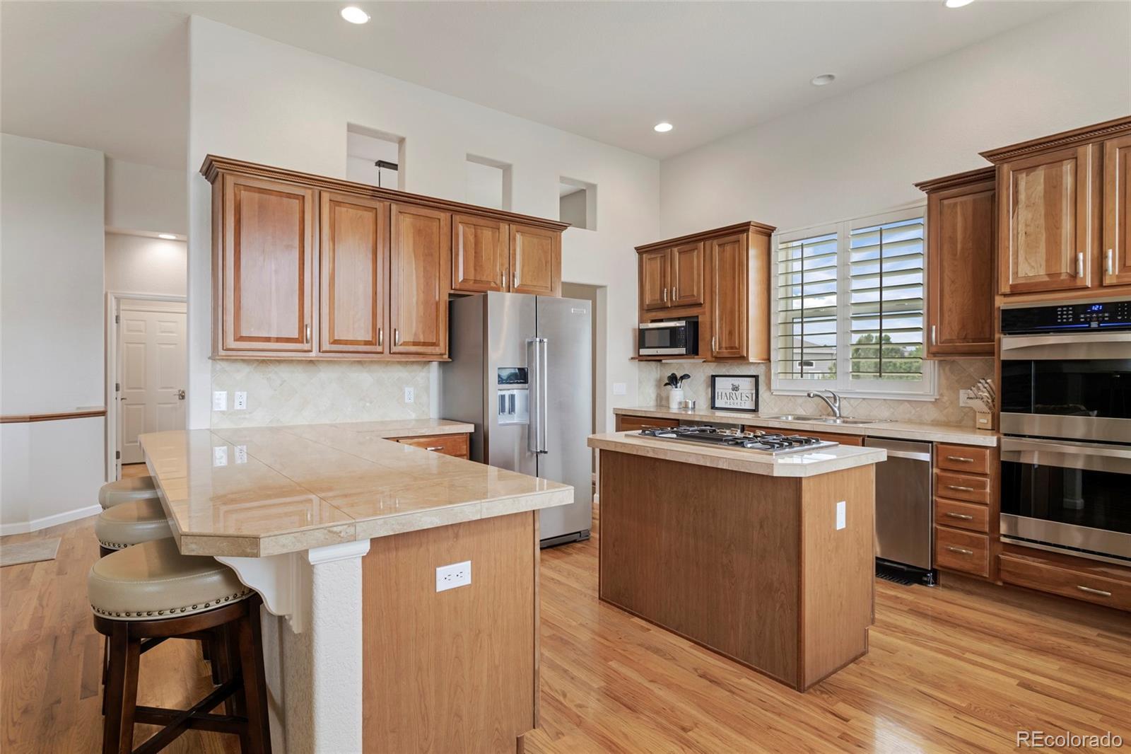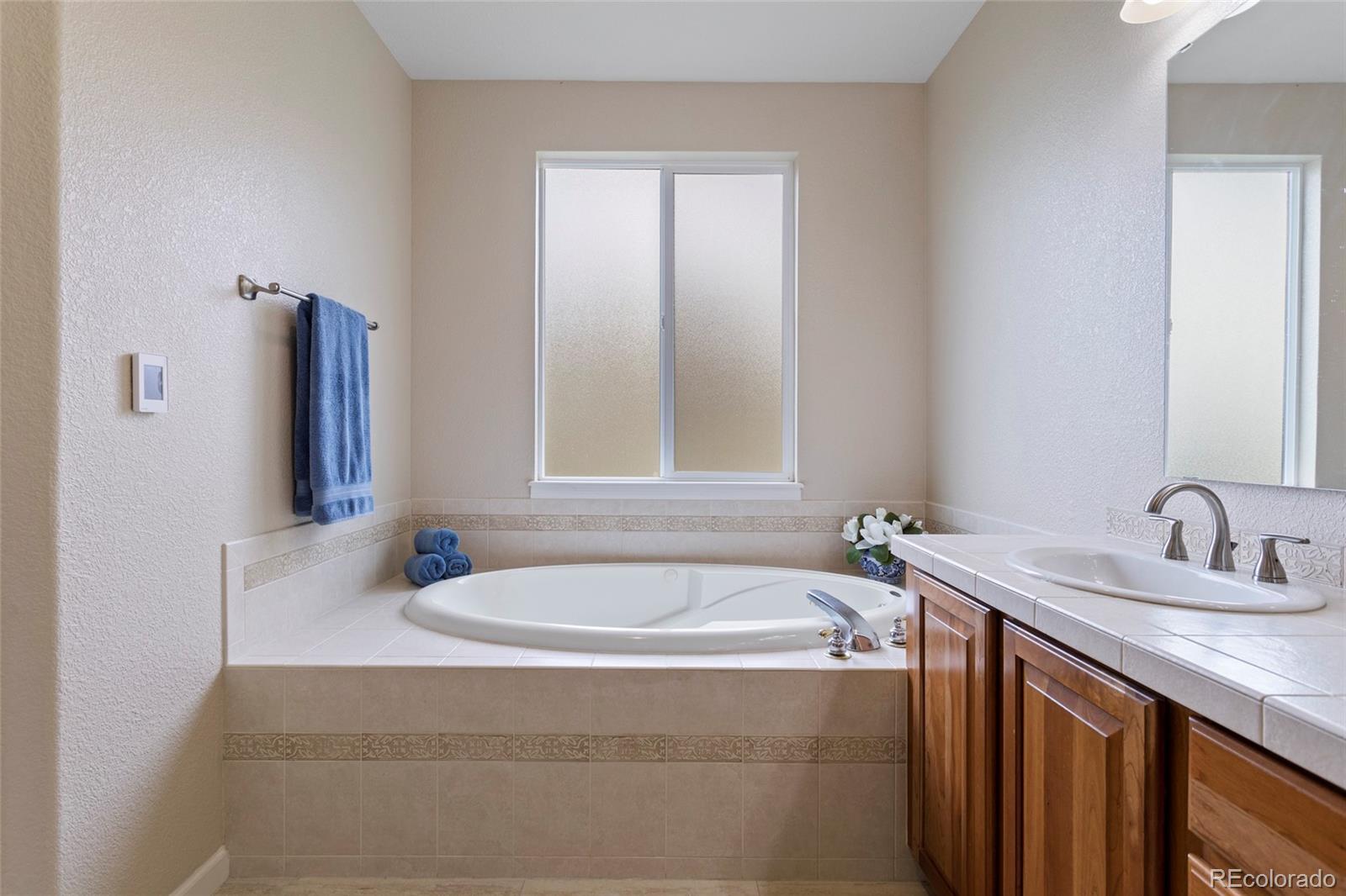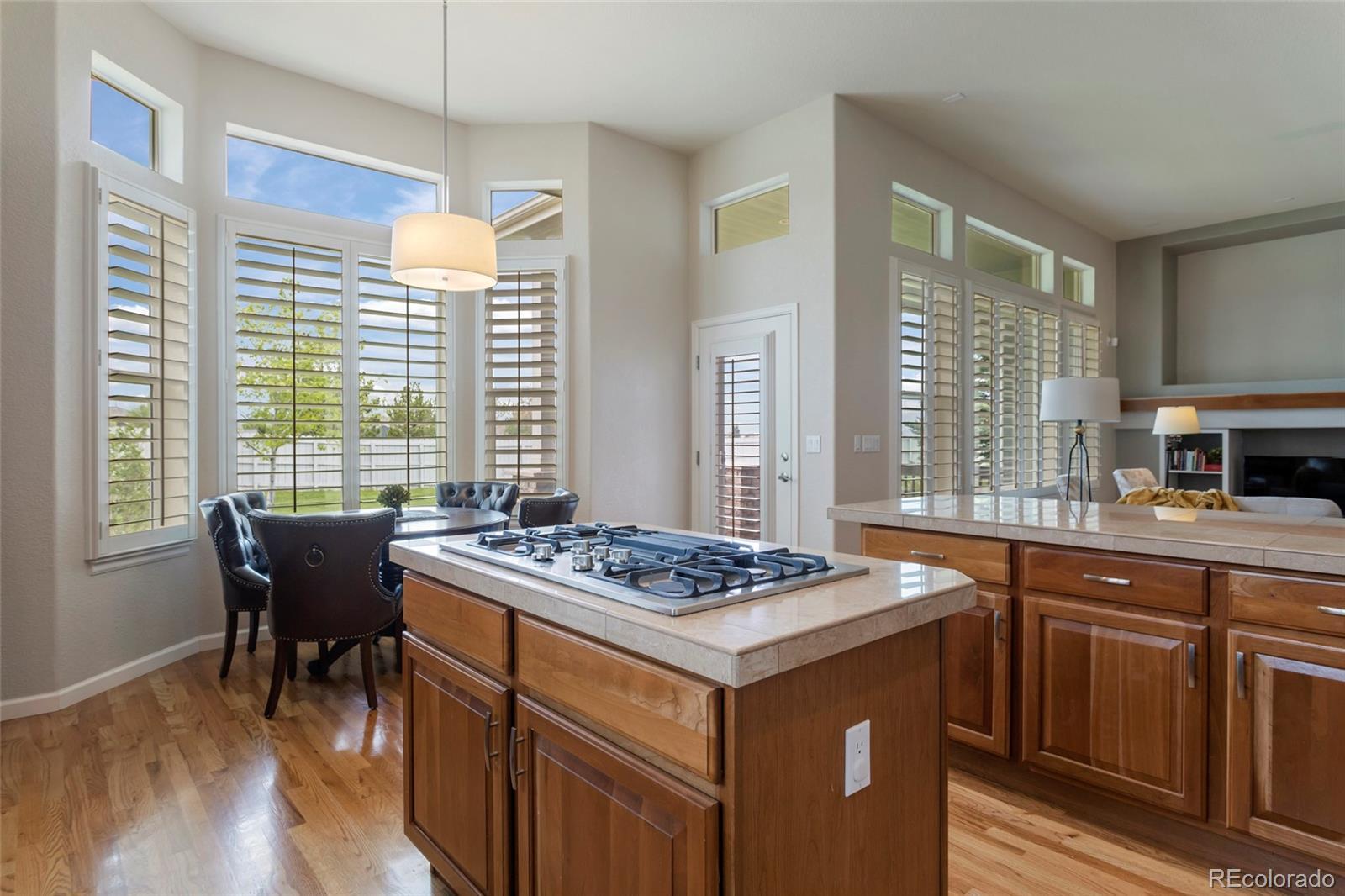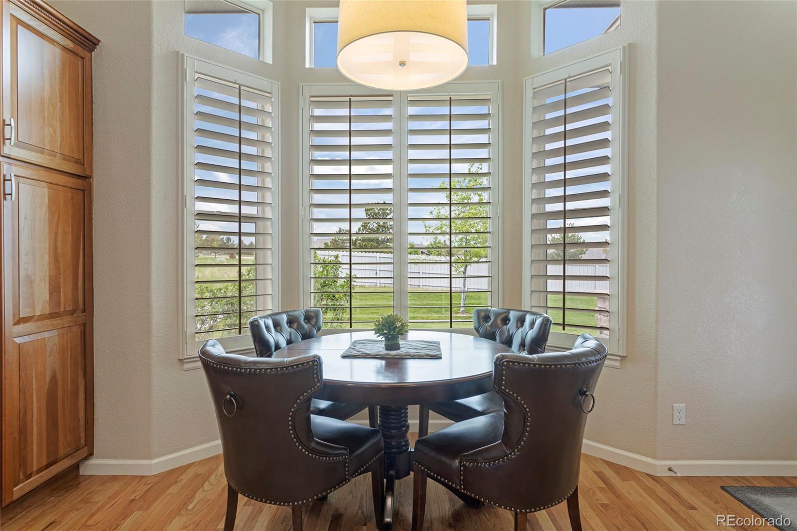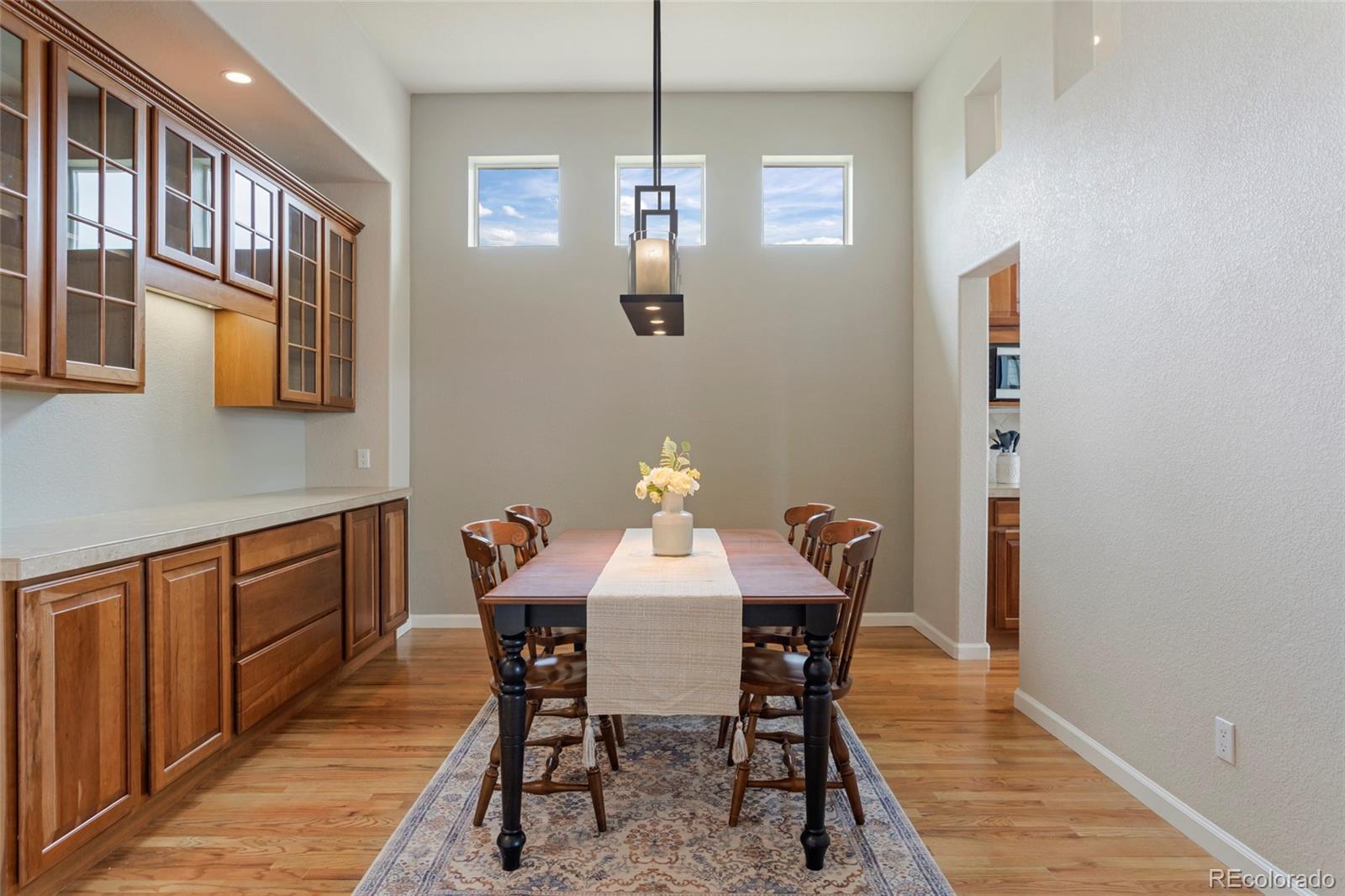 BEST LOT IN NEIGHBORHOOD! Discover the epitome of effortless living in this low maintenance ranch. Pristine perfection, this spacious abode offers 3,747 square feet of living space, nestled at the end of a serene cul-de-sac, adjacent to open space, providing mountain and golf course views. Step inside and be greeted by a thoughtfully designed main level, featuring large Bedrooms, a study, 2 full Bathrooms, and an open concept Family Room with vaulted ceilings. The inviting Dining Room boasts built-in cabinets, ideal for showcasing your treasured possessions. Indulge in the luxurious Primary Suite, with a coffered ceiling and a remodeled bathroom that includes heated floors, 2 walk-in closets, spa shower, and soaking tub. Access the deck directly from the Primary Suite, seamlessly blending indoor/outdoor living. The well-appointed kitchen offers an abundance of Cherrywood cabinetry, stainless steel appliances, a breakfast bar, eat-in space, and granite tile countertops. You'll find cabinetry lining the wall, perfect for hosting gatherings and entertaining guests in the formal Dining Room. Throughout most of the main level, enjoy the beauty of wood flooring and updated lighting, enhancing the allure. Step outside onto the private covered deck, complete with a retractable sunscreen, and appreciate the tranquil surroundings. Plantation shutters adorn the windows, adding a touch of sophistication. Descend to the Finished Basement, where you'll find a wet bar, fireplace, built-in cabinetry, an additional Bedroom and Bath. With over 500 square feet of unfinished space, the basement offers endless possibilities for further customization. The exterior landscaping is meticulously maintained by the HOA. Enjoy the convenience of a community pool within walking distance. Additionally, the location offers easy access to Daniels Park, The Ridge golf course, 1-25, DTC and 35 min. to DIA. Embrace a lifestyle of comfort and convenience in this exceptional ranch-style home.