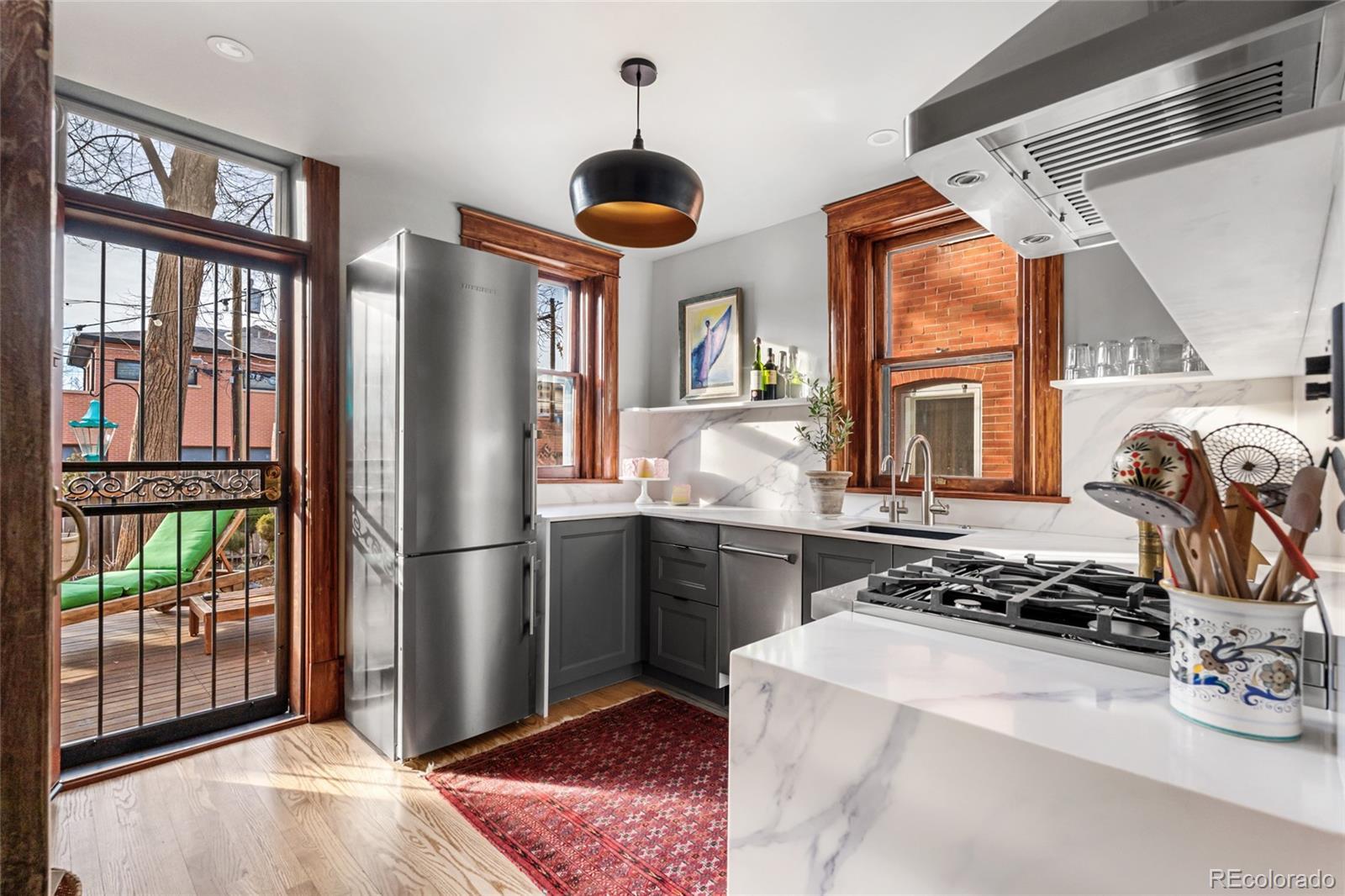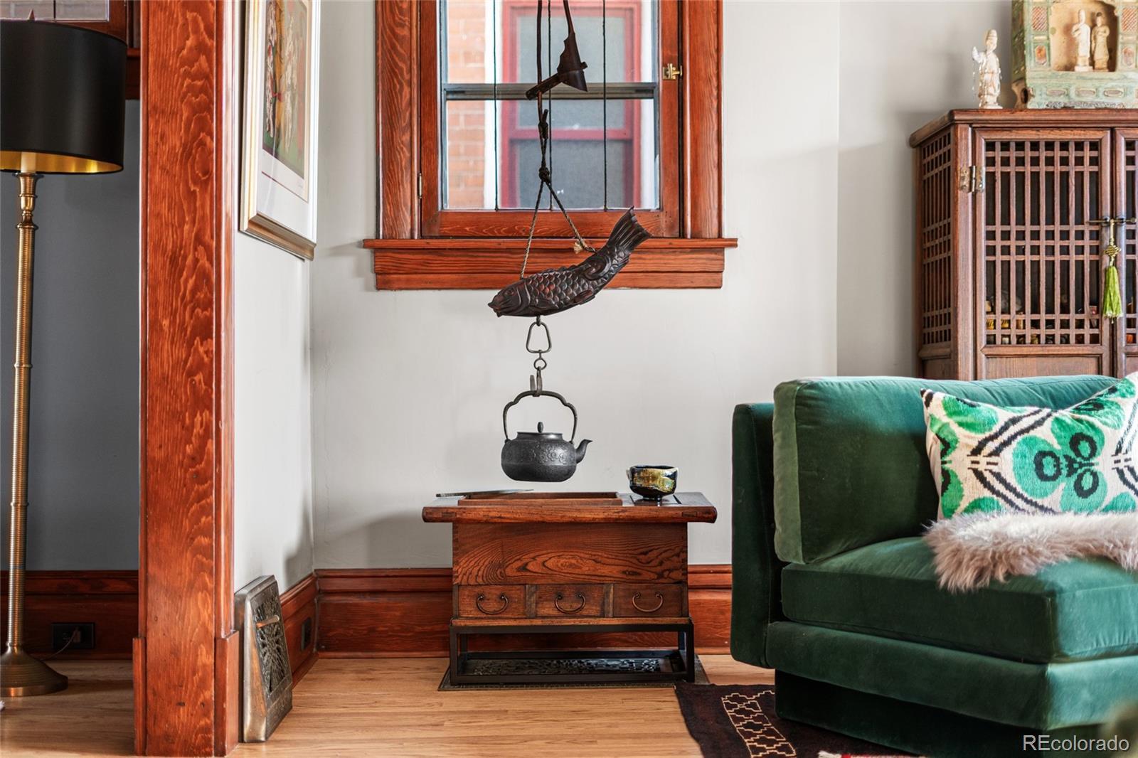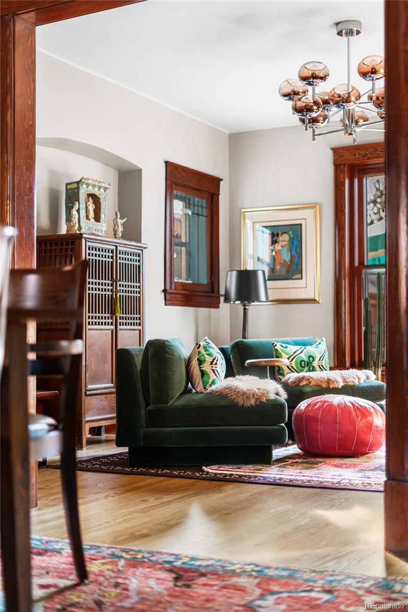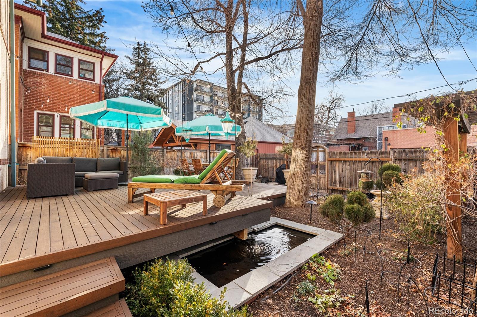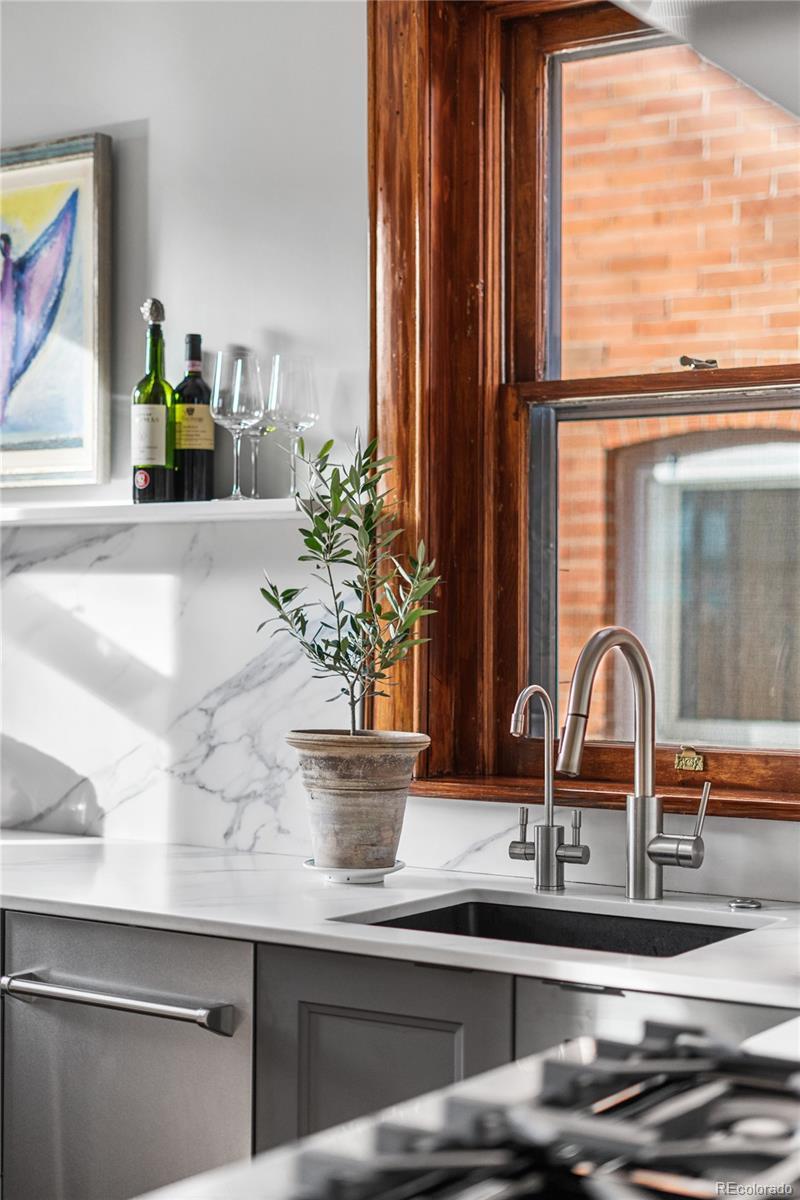 Prime location! This updated Denver Square blends modern improvements with preserved historic character and is set on one of Congress Park’s most desirable blocks, featuring a tranquil, Zen-inspired garden yard. The first and second levels showcase original craftsmanship, including rich woodwork, a gracious entry and staircase, hardwood floors, built-ins, and classic trim and window casings. Leaded and stained-glass windows add architectural interest, while the living space features a custom-built fireplace finished in Cle tile. The kitchen was fully redesigned in 2024 with an efficient layout, offering new cabinetry and shelving, double drawers, a gas range, quartz countertops, an instant hot water faucet with filtration, and an antique pantry piece. Upstairs, the primary suite includes a well-appointed en-suite bath with a vintage soaking tub, walk-in shower, custom Cle tile, and high-end fixtures. Two additional bedrooms share an updated full bath. The basement level offers a built-in office area, a newly finished non-conforming flex room, and ample storage. System upgrades include a new Class 4 impact-resistant roof installed January 2026, a Bosch heat pump and furnace combination, updated plumbing and electrical with a new panel, tuckpointing, and new landscaping and deck. The outdoor space includes gardens, plantings, paths, ponds, ambient lighting, drip irrigation, and multiple seating areas. Three off-street parking spaces are included, with the seller currently renting a garage across the alley, and the property offers sufficient space near parking to accommodate a custom two-car garage. Walkable to shops and dining at 12th & Madison and 12th & Elizabeth, Sprouts, the Colfax corridor, The Bluebird Theater, City Park, Congress Park, the Denver Botanic Gardens, 9th & Co, and Cherry Creek. Served by Teller Elementary and East High School.