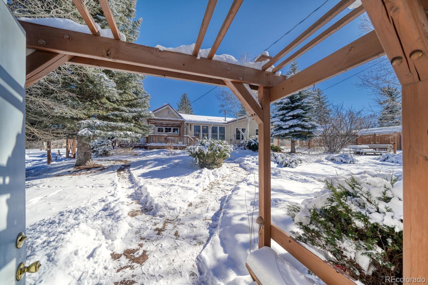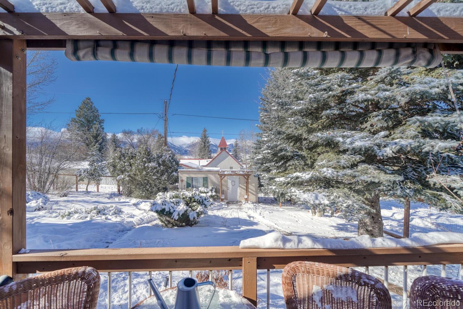 Situated on a spacious corner lot in the heart of Westcliffe, this beautifully renovated home offers comfort, character, and true in-town convenience. Remodeled in 2005 with a well-planned addition, it features three bedrooms (one non-conforming), a spacious office with mountain views, a dedicated library, and two inviting living spaces—providing room for work, reflection, and gathering. Both the living room and family room include thermostat-controlled propane fireplaces, offering warmth and ambience with ease. Large windows throughout frame unobstructed, front-and-center views of the Sangre de Cristo Mountains. Pocket doors, quality cabinetry throughout, and a stucco exterior continue the home’s thoughtful, enduring character. The dining room is positioned to take in the mountain backdrop and provides French-door access to the enclosed courtyard, creating a natural flow for both indoor and outdoor dining. The family room offers sliding-door access to the rear Trex deck, extending the living space and inviting you to enjoy the mountain air. Wood floors and crown molding add a timeless touch, while the kitchen’s warm wood cabinetry creates a welcoming, functional center to the home. Outdoor living is exceptional, with a covered front porch, a private courtyard, and a rear deck—all finished in durable Trex decking. An automatic sprinkler system, mature aspen and evergreen trees complement the fenced yard. The garage offers a workshop area suited for storage or hobbies, and a 10x20 shed provides additional flexible space. Originally formed from two miner cabins later combined and expanded, the home carries a quiet historical thread. A shadowbox table displaying late-1800s artifacts remains with the property. Within walking distance to downtown, this home blends mountain beauty, small-town charm, and a story uniquely its own. Schedule a showing today to experience the history, heart, and mountain presence that make this Westcliffe home truly unforgettable.
