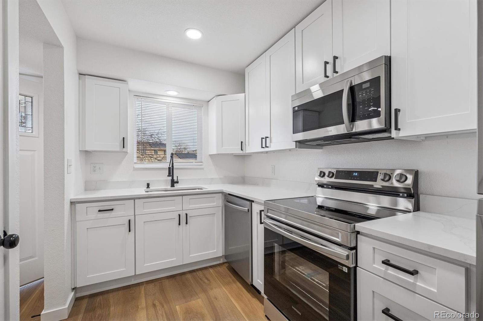 Welcome to this beautifully remodeled home that perfectly blends modern upgrades with everyday comfort, all in an unbeatable location just one block from O’Kane Park. Bright, airy, and thoughtfully updated throughout, this move-in-ready residence offers 3 bedrooms and 2 bathrooms, with a highly desirable floor plan featuring one bedroom on the main level and two spacious bedrooms upstairs. Step inside to a light-filled interior highlighted by brand-new laminate flooring on the main level, fresh interior paint, and a warm, inviting living room complete with a wood-burning fireplace—perfect for cozy Colorado evenings. The stunning kitchen is a true showstopper, showcasing soft-close white shaker cabinets, sleek quartz countertops, new stainless-steel appliances, modern fixtures, and a convenient pantry ideal for extra storage and functionality. Both bathrooms have been tastefully updated with newer vanities and modern finishes, while new carpet upstairs adds comfort to the private living spaces. Major system upgrades provide peace of mind, including a newer furnace, newer roof and gutters, new front door, and new garage doors. Outside, enjoy a long driveway with RV parking, an attached two-car garage, and the convenience of being within walking distance to a large park, perfect for outdoor recreation, pets, and gatherings. Located minutes from shopping centers, dining, and major highways, this home offers both tranquility and accessibility. Every detail has been carefully considered—simply move in and enjoy. Don’t miss this incredible opportunity—come see it today!
